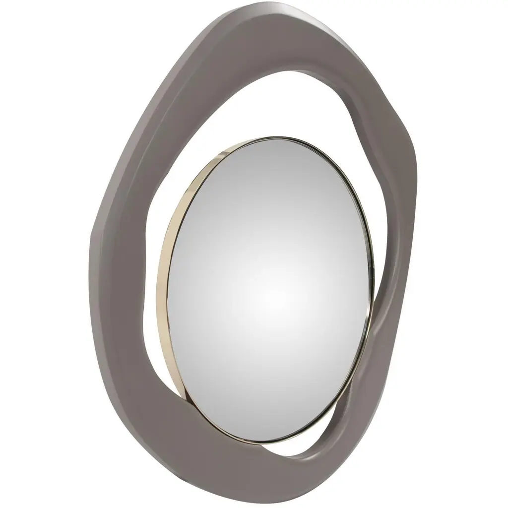 A traditional polished gold round stainless steel framed mirror appears to be balancing in the abstract. The gray matte finish of the outer frame contrasts perfectly and shows how traditional and abstract minds can work together in perfectly harmony.