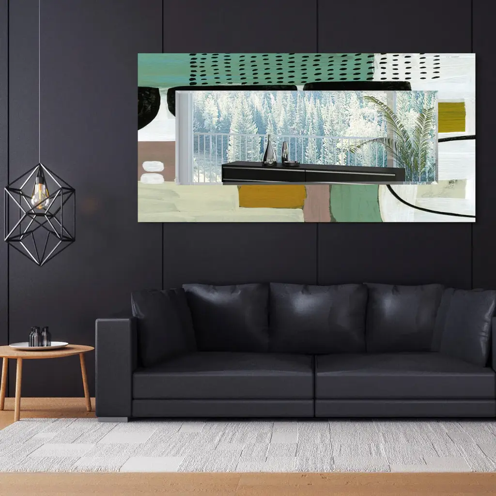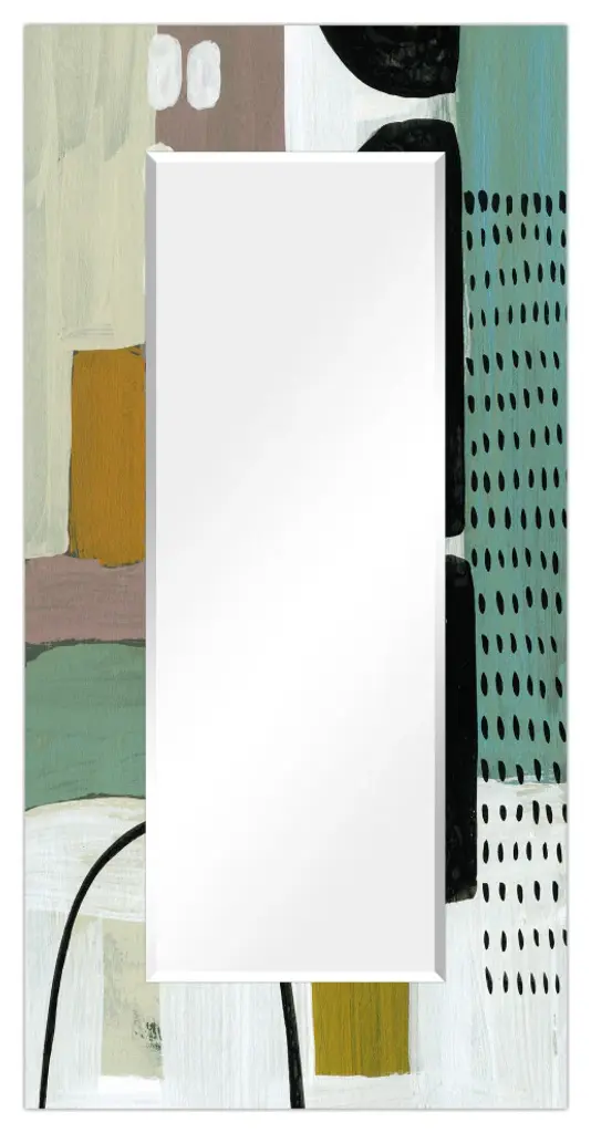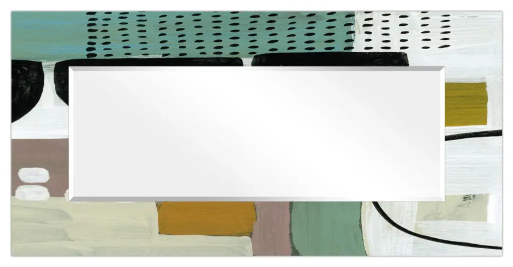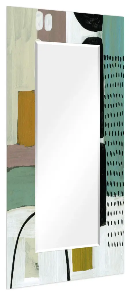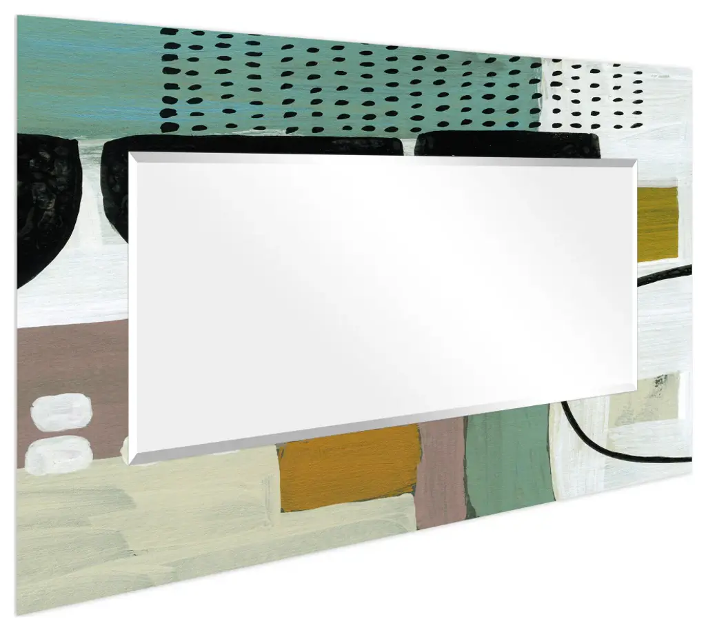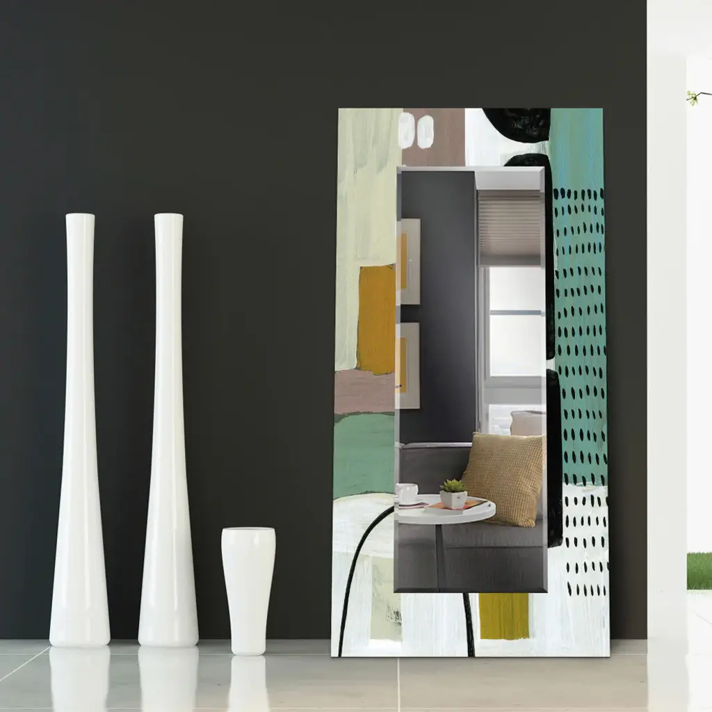 Abstract Rectangular Beveled Wall Mirror On Free Floating Printed Tempered Glass