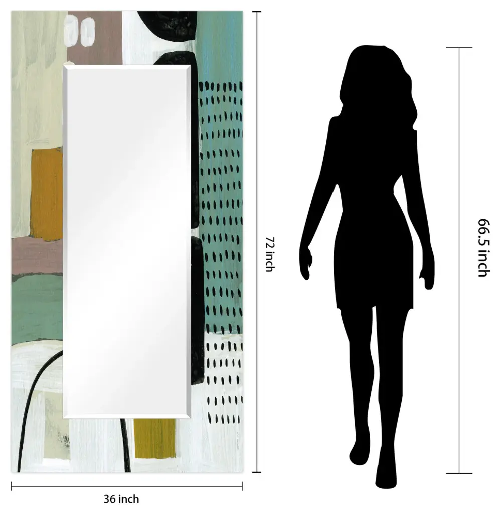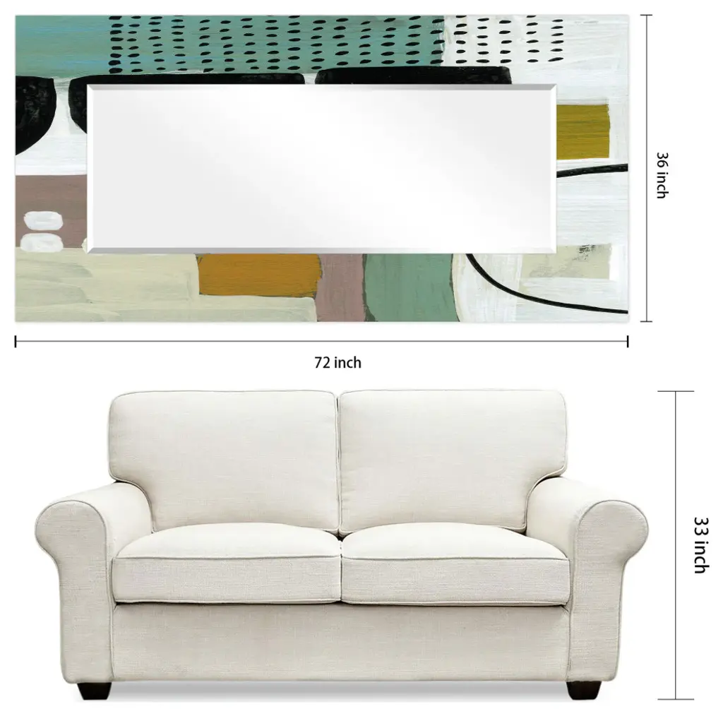 This stunning 72" x 36" frameless, free-floating tempered glass art is the perfect addition for any room where a 6 ft tall mirror is preferred. This specific mirror places a large rectangular mirror over beautiful abstract art of different shapes of blue and white. The mirror in the middle is 55"x 20" with a 0.7" beveled edge. 4 strong steel hangers are attached to the back of the mirror for quick and easy installation either vertically or horizontally.