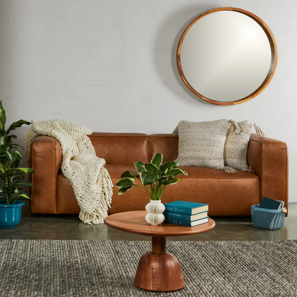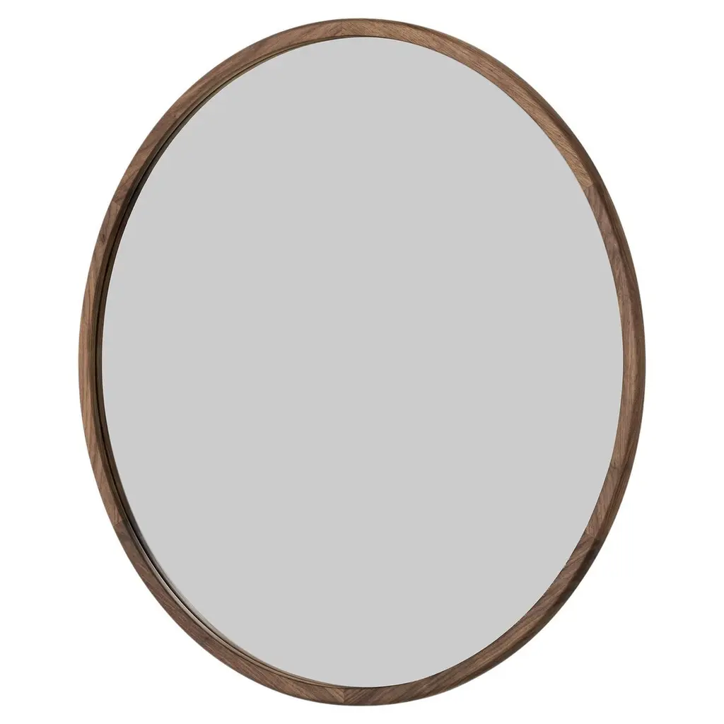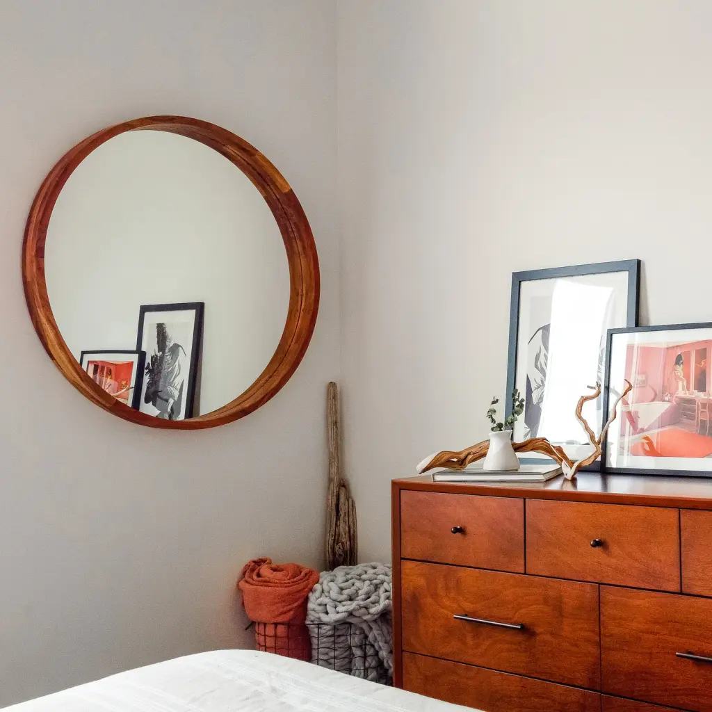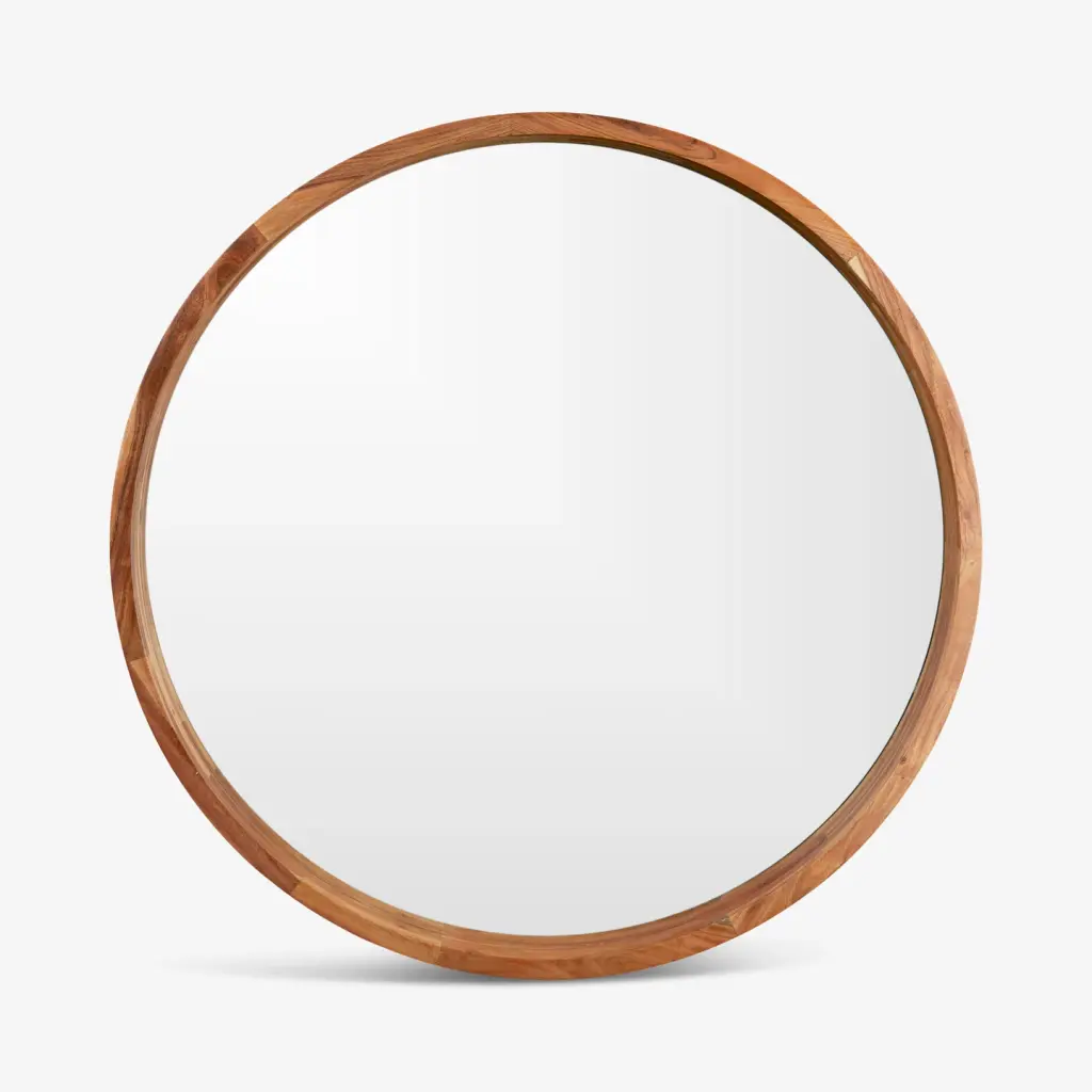 NATURAL PERSPECTIVE. Solid sustainable acacia wood comes full circle to showcase a sweeping grain and warm hi/lo tones. Spanning over three feet in diameter, handcrafted wooden frame rings the inset mirror with 3D depth. Mounting hardware is not included By CB2.