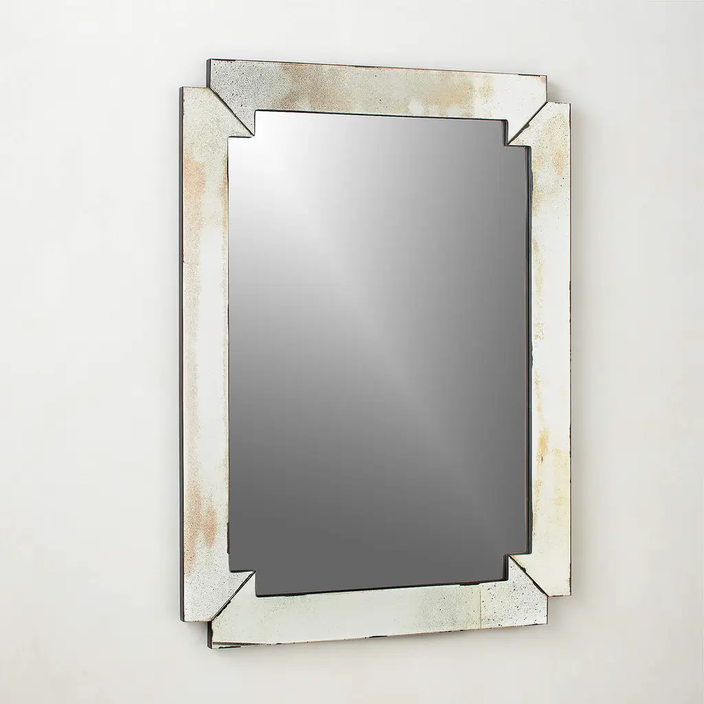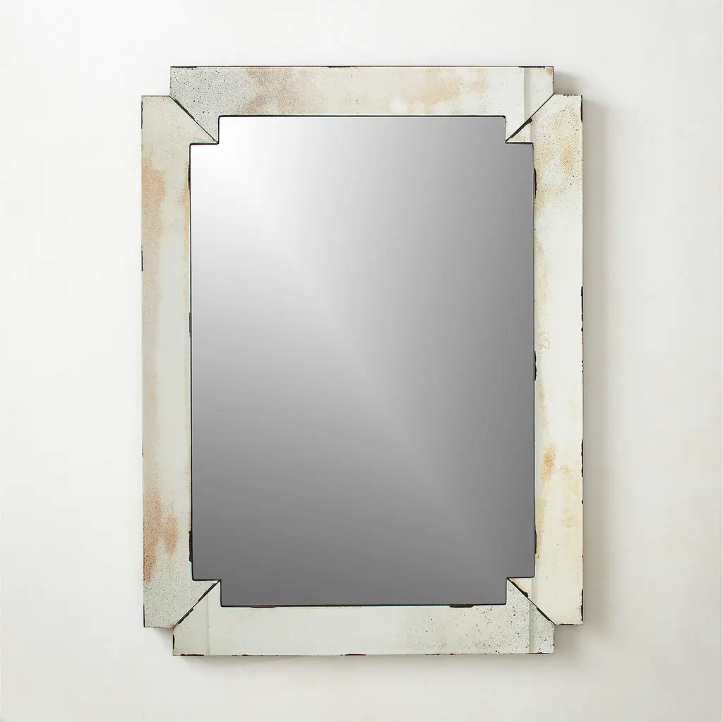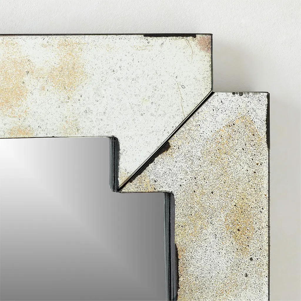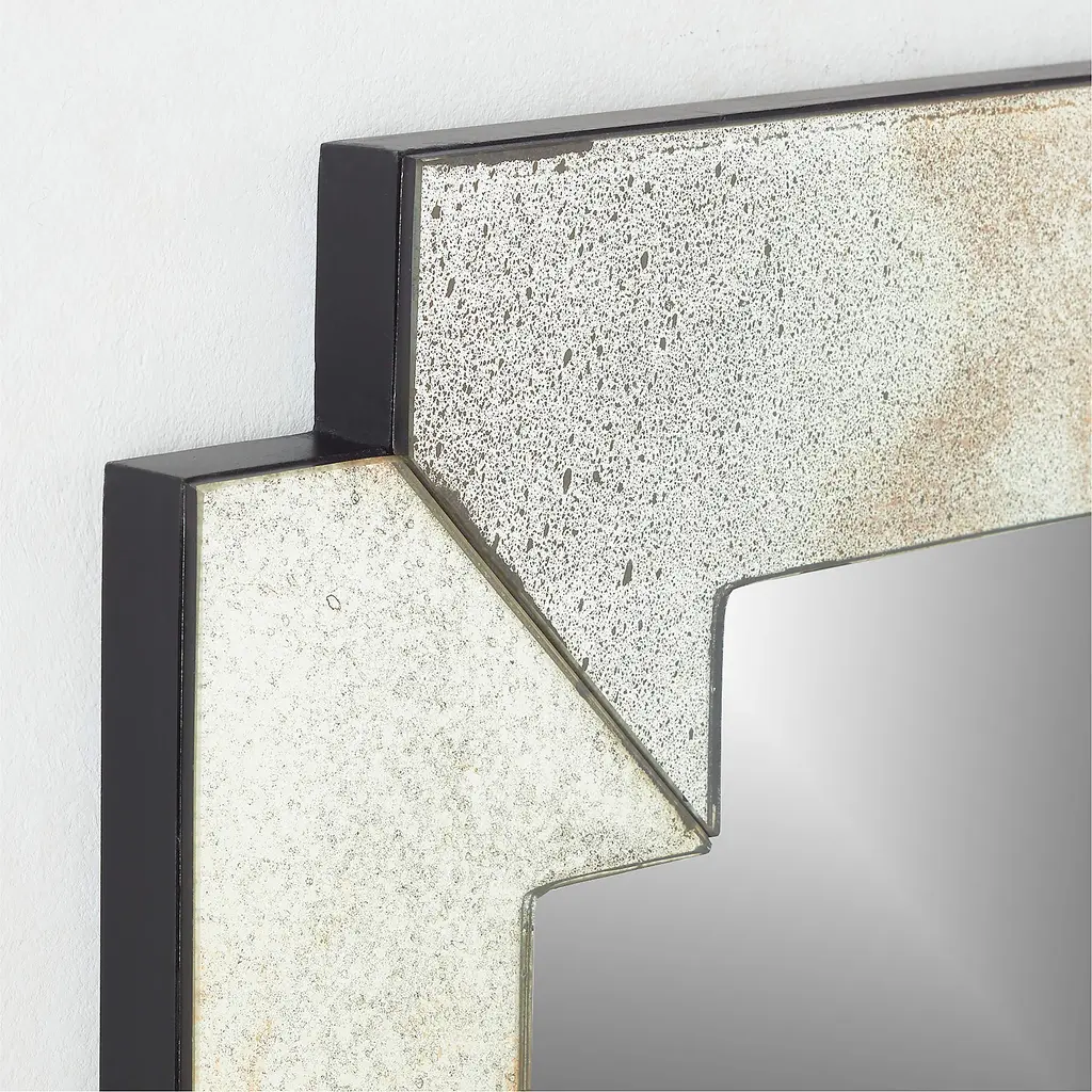 Modern wall mirror combines contrasting finishes to create a refined look. Artfully handmade, the glass frame features an antiqued finish that's rich with the patina of age. CB2 exclusive.