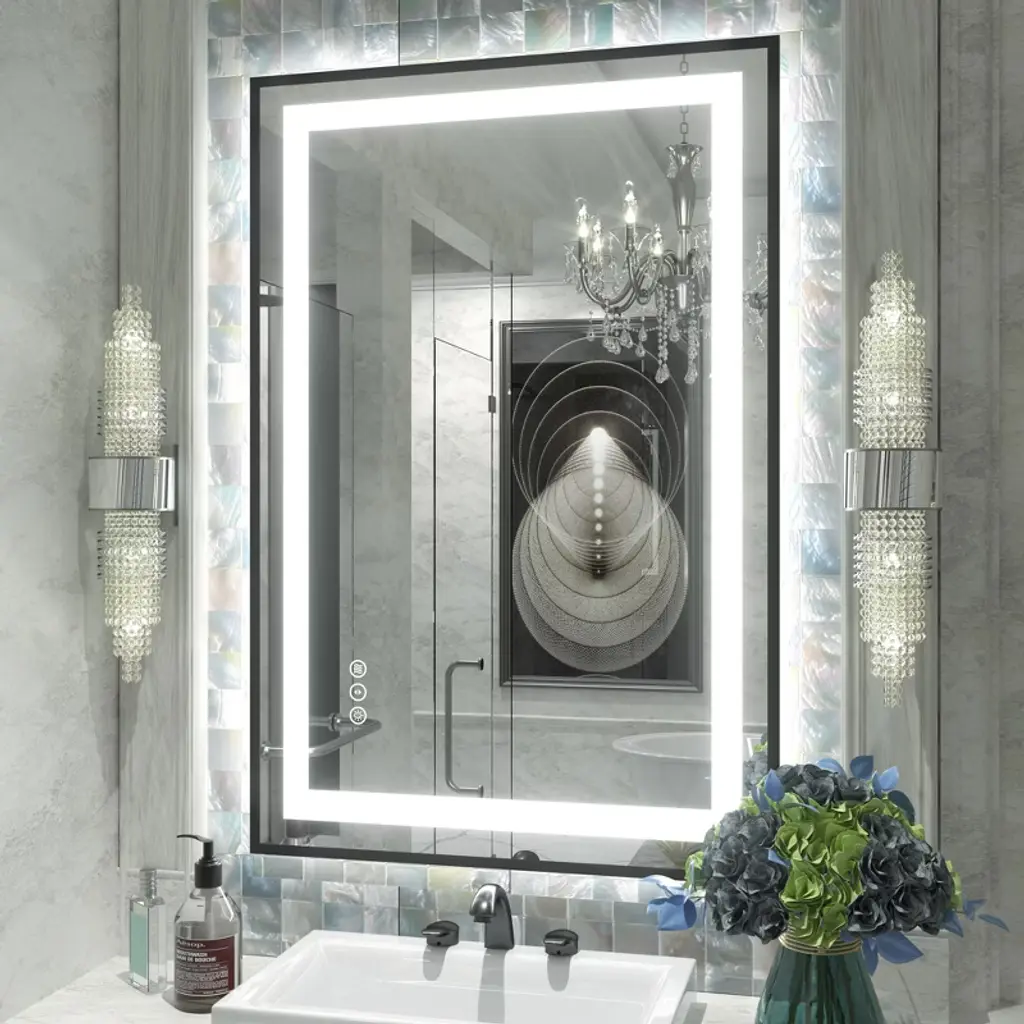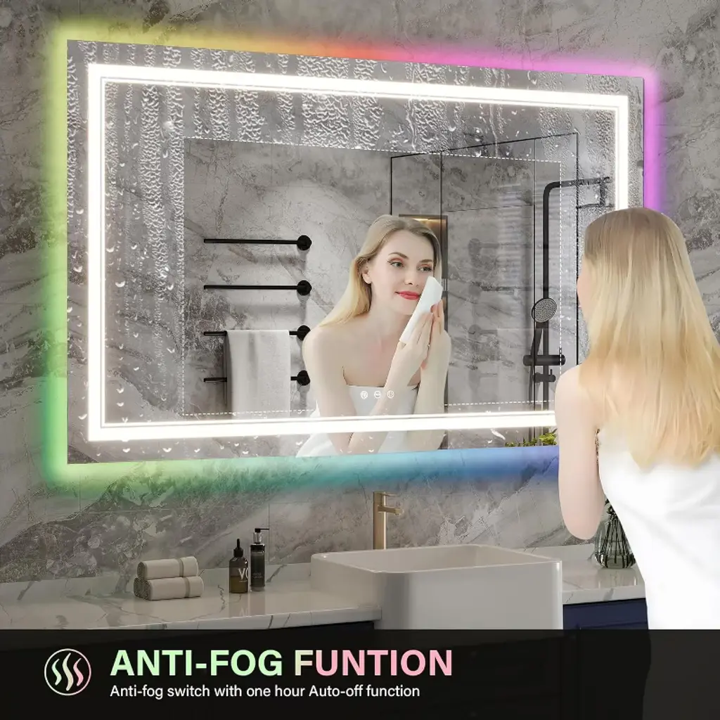 The Acekool Bathroom Vanity Mirror merges modern style with versatile lighting options to elevate your bathroom experience. Designed for convenience and clarity, it is available in three sizes—32" x 24", 40" x 32", and 48" x 36"—to fit different spaces and preferences. This mirror offers individually adjustable backlight with multiple colors plus a front light with three color temperatures. Both light zones are dimmable, allowing you to customize brightness for makeup, grooming, or ambiance. Advanced anti-fog technology ensures a clear view even in humid conditions, while a memory feature recalls your last brightness and color setting for hassle-free use. Installation is straightforward with included hardware. The mirror can be mounted either horizontally or vertically to suit your bathroom’s design and maximize usability. This combination of features makes it a functional and stylish upgrade for any personal care space. Specifications: Available Sizes: • 32" L x 24" W • 40" L x 32" W • 48" L x 36" W Lighting: Color-changing backlight, adjustable front light with 3 temperature modes Features: Anti-fog coating, memory recall, dimmable lighting controls Mounting: Wall mountable horizontally or vertically with included brackets