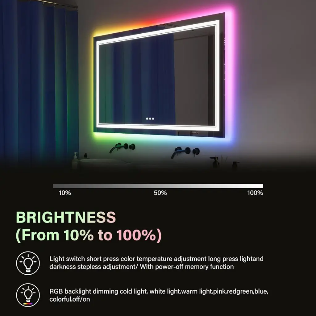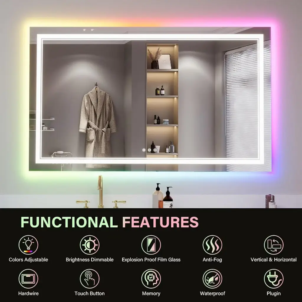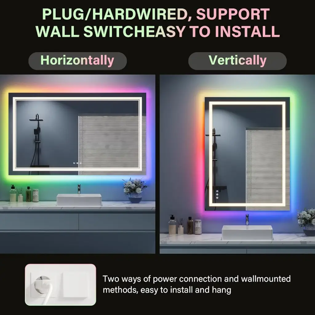 The Acekool Bathroom Vanity Mirror merges modern style with versatile lighting options to elevate your bathroom experience. Designed for convenience and clarity, it is available in three sizes—32" x 24", 40" x 32", and 48" x 36"—to fit different spaces and preferences. This mirror offers individually adjustable backlight with multiple colors plus a front light with three color temperatures. Both light zones are dimmable, allowing you to customize brightness for makeup, grooming, or ambiance. Advanced anti-fog technology ensures a clear view even in humid conditions, while a memory feature recalls your last brightness and color setting for hassle-free use. Installation is straightforward with included hardware. The mirror can be mounted either horizontally or vertically to suit your bathroom’s design and maximize usability. This combination of features makes it a functional and stylish upgrade for any personal care space. Specifications: Available Sizes: • 32" L x 24" W • 40" L x 32" W • 48" L x 36" W Lighting: Color-changing backlight, adjustable front light with 3 temperature modes Features: Anti-fog coating, memory recall, dimmable lighting controls Mounting: Wall mountable horizontally or vertically with included brackets