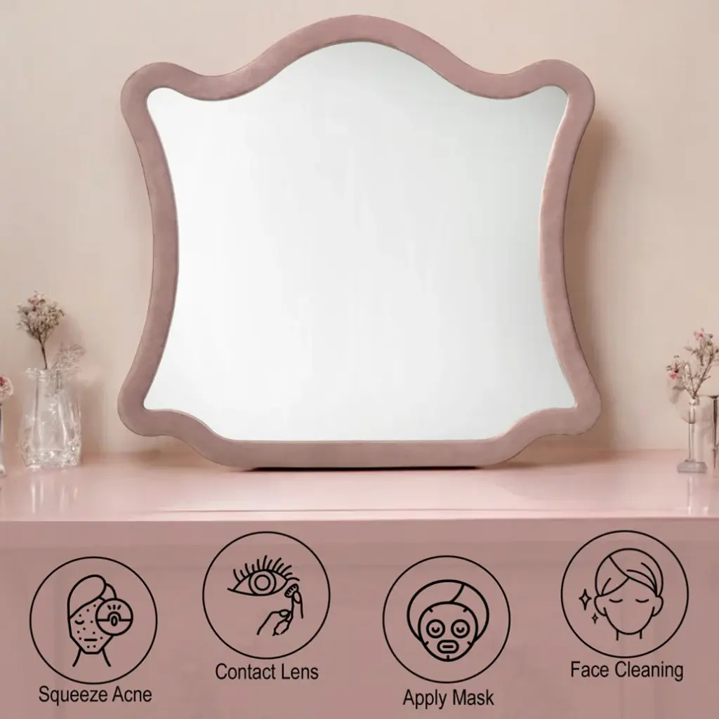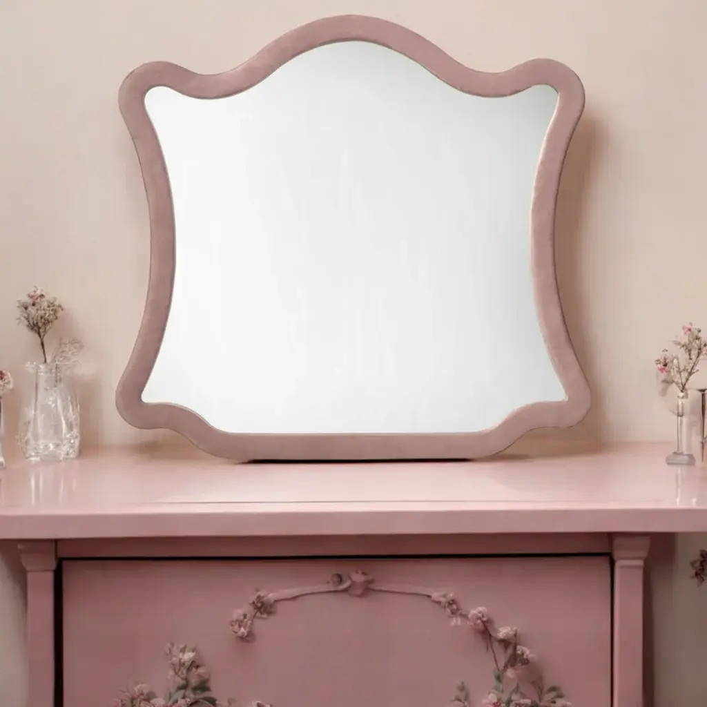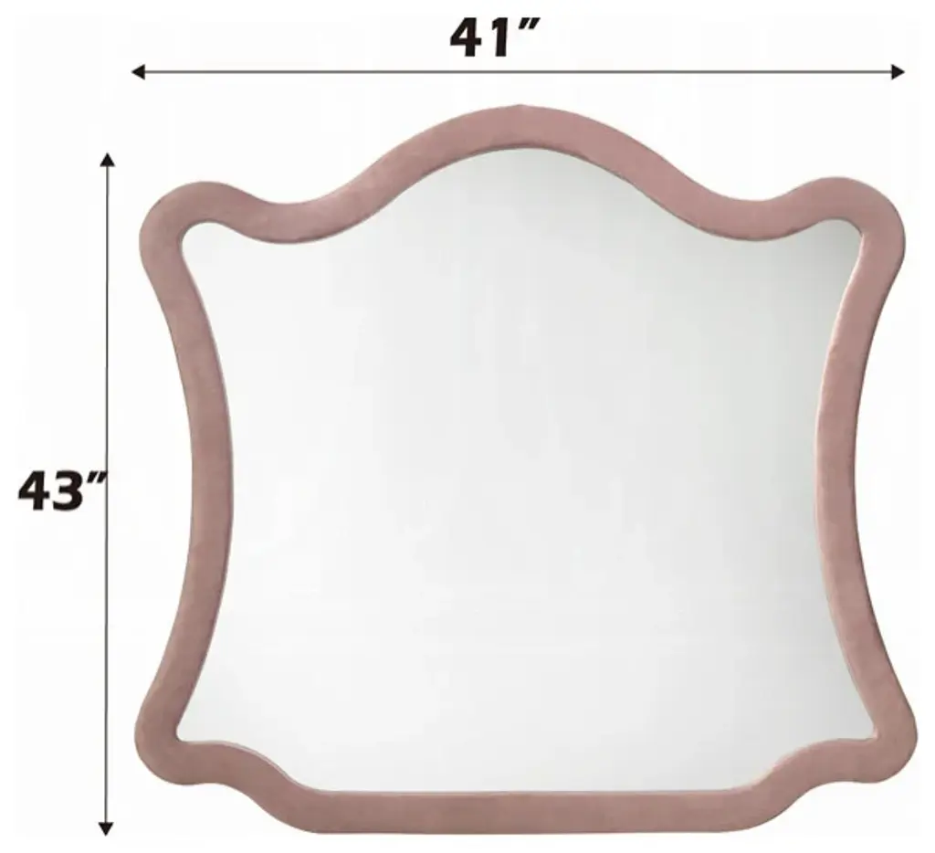 ACME Salonia Mirror, Pink VelvetACME Salonia Mirror, Pink Velvet The Salonia velvet bed will make any room more appealing with its Art Deco-inspired design. This is a beautiful, tufted platform bed, available in three gorgeous colors - black, blue, and gray. The padded bed is filled with foam to add extra comfort. Both attractive and sturdy, the Salonia elevates the style of any bedroom. Available in King & Queen sizes.Model No : BD01185Brand : Acme FurnitureUPC : 840412317675Product Dimension : 41L x 2W x 43HSalonia collectionColor : Pink VelvetACME Salonia Mirror, Pink Velvet