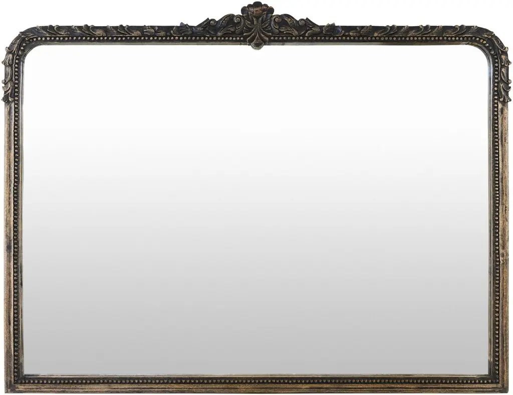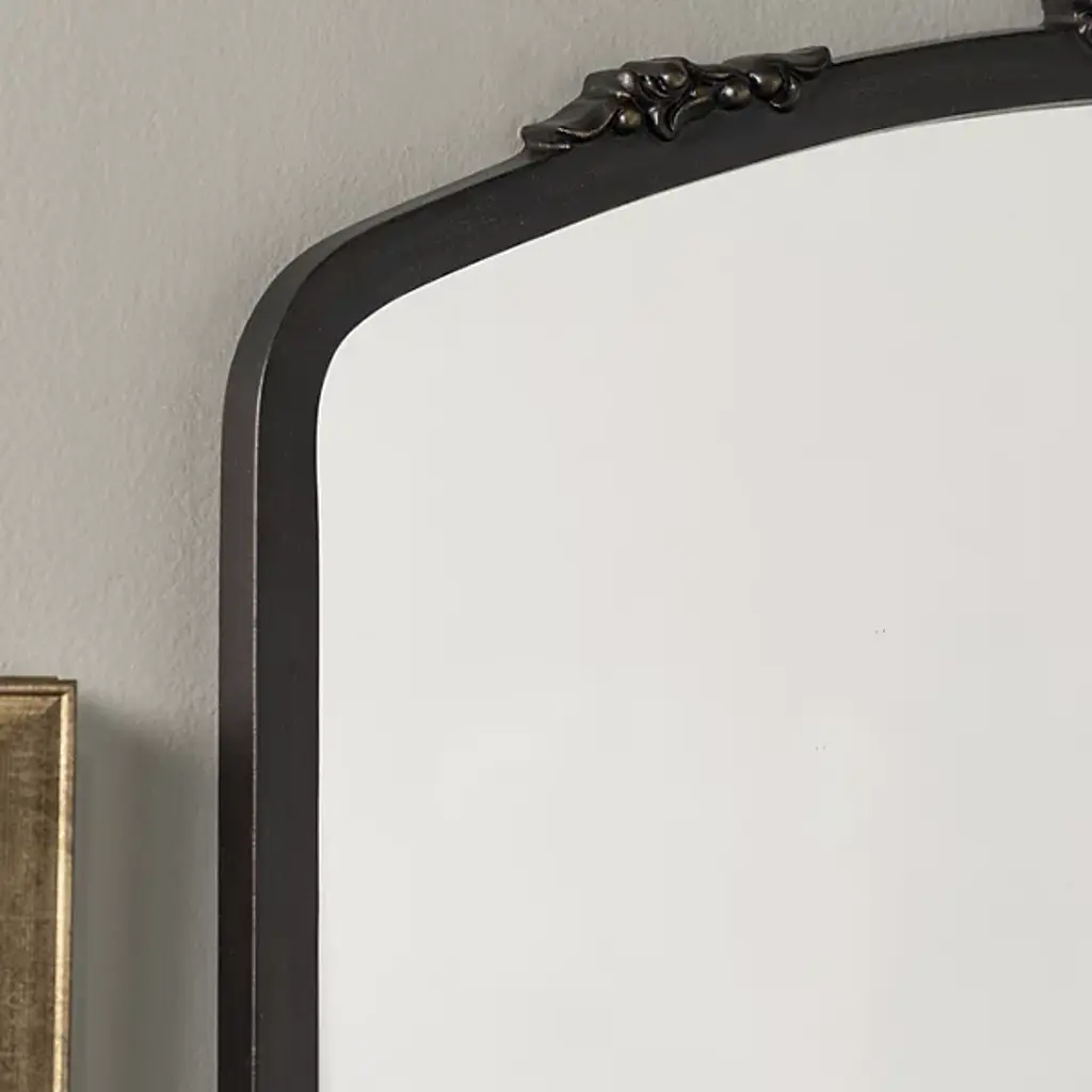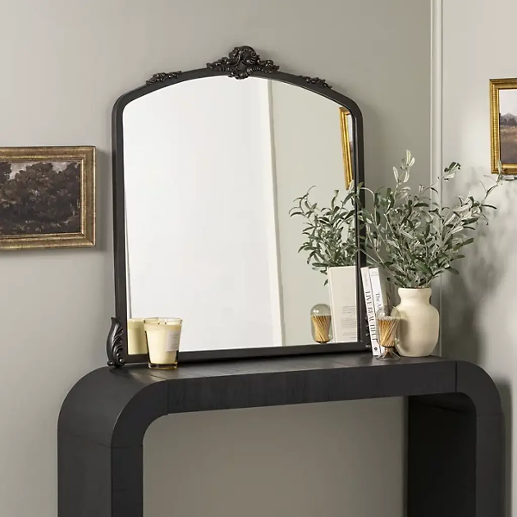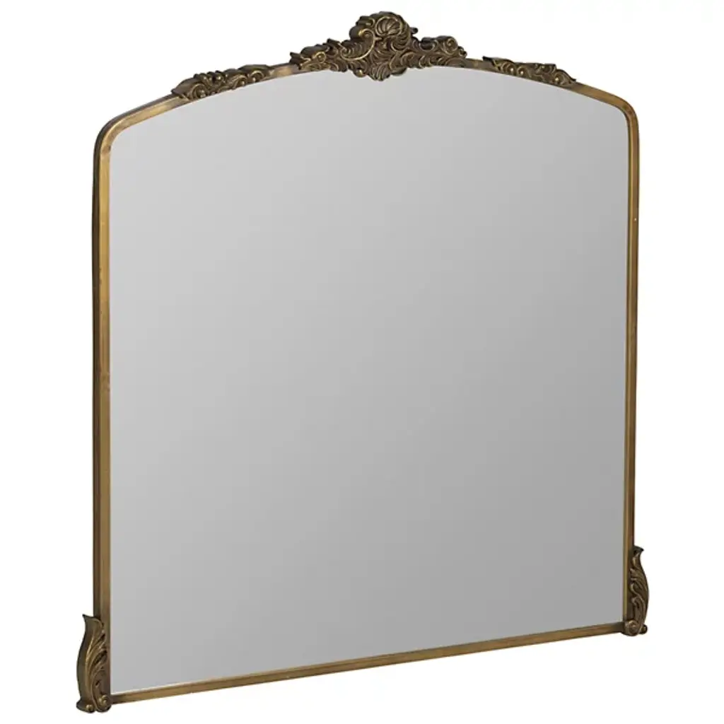 The Adeline Ornate Mantle Mirror from Cooper Classics showcases elaborate scrollwork across its upper crown. Metal and polyurethane construction enables intricate detailing in the baroque-inspired carvings. The arched frame rises to a central medallion while matching ornamental pieces anchor the base corners. The design draws from French decorative traditions while maintaining proper proportions for modern interiors.