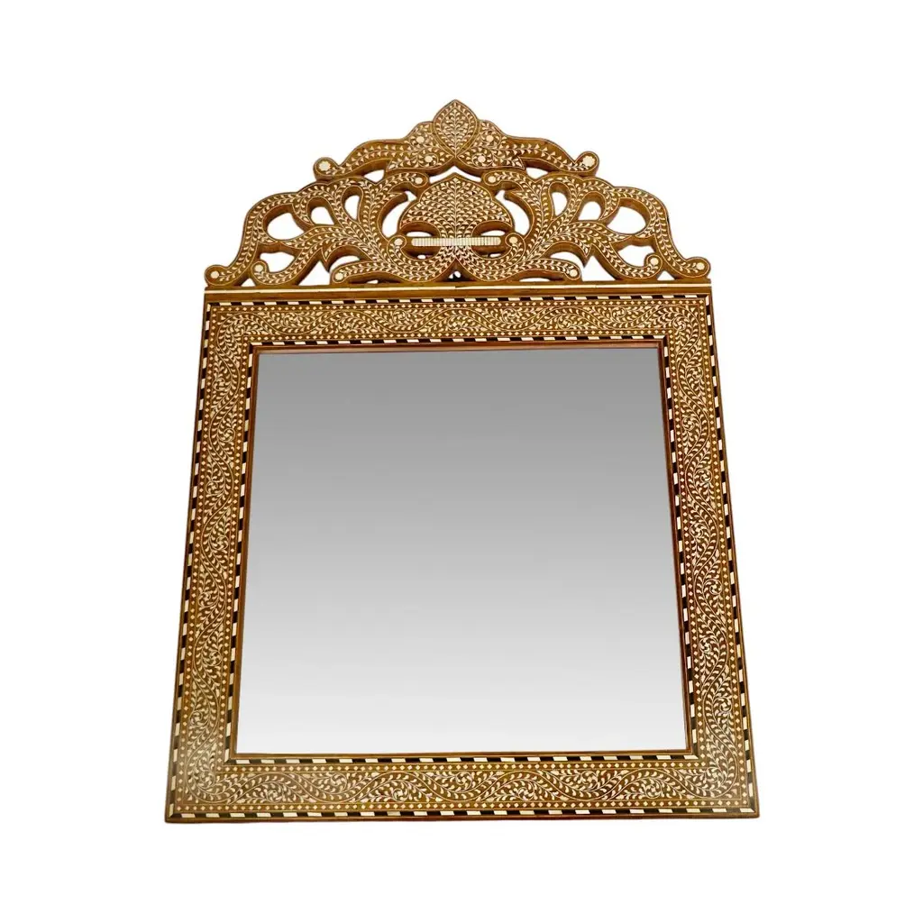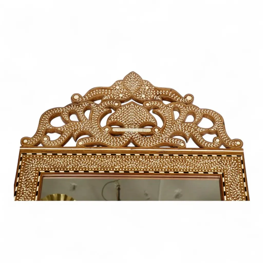 Elevate your home décor with our exquisite wooden Inlaid Mirror, a stunning blend of artistry and functionality. Crafted from High- quality wood, this mirror features intricate inlaid designs that showcase the craftsmanship and attention to detail. Each piece is unique ,highlighting the natural grain of the wood, making it a perfect focal point for any room. The mirror’s elegant frame adds a touch of sophistication, while its versatile design seamlessly complements various interior styles, from rustic to modern. Hang it i living room or bedroom to create a sense of space and light n you entryway, •Dimensions: 35" x 51 " H KEY FEATURES: 1-Handcrafted Design: Each mirror is meticulously crafted to ensure uniqueness and quality. 2- DIMENSION : 3- Elegant Inlay work : Beautiful Inlaid patterns that enhance the aesthetic appeal 4- Versatile Décor : Compliments a wide range of Interior styles. 5- Easy to Hang : Comes with all necessary Hardware for Quick and easy installation. Transform your space with the timeless beauty of our Wooden Inlaid Mirror, where artistry meets functionality.