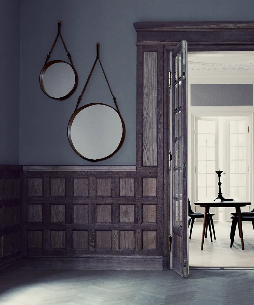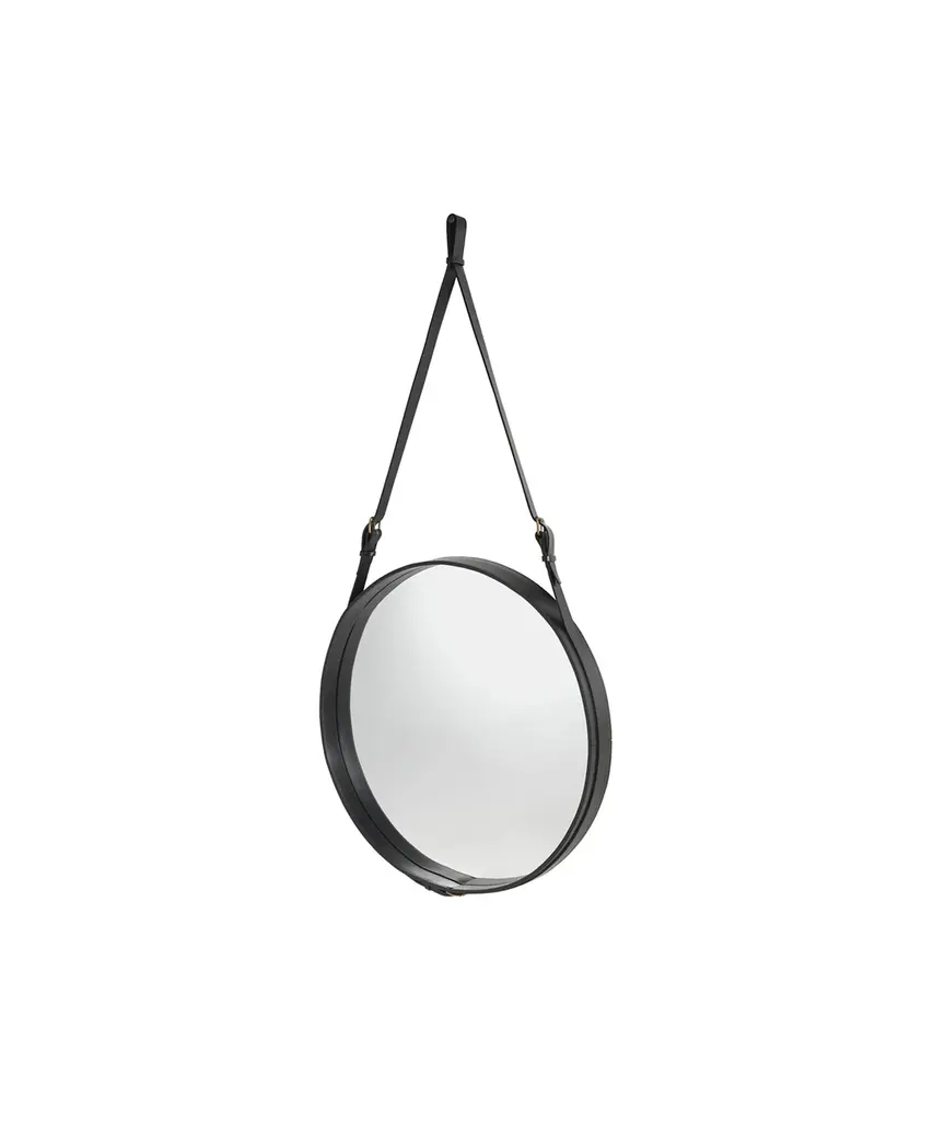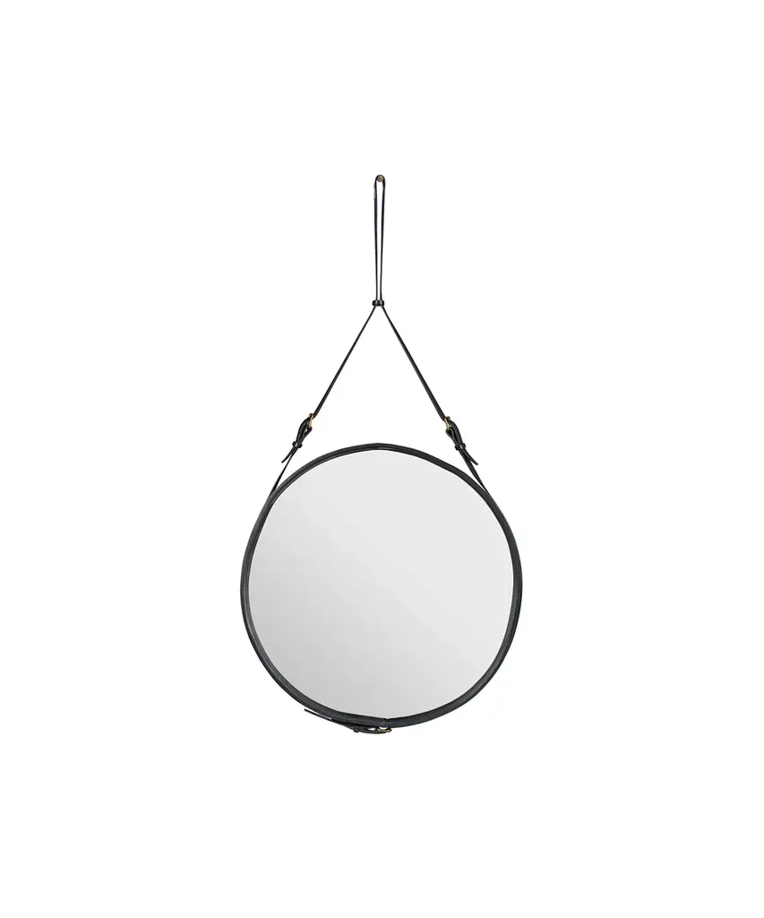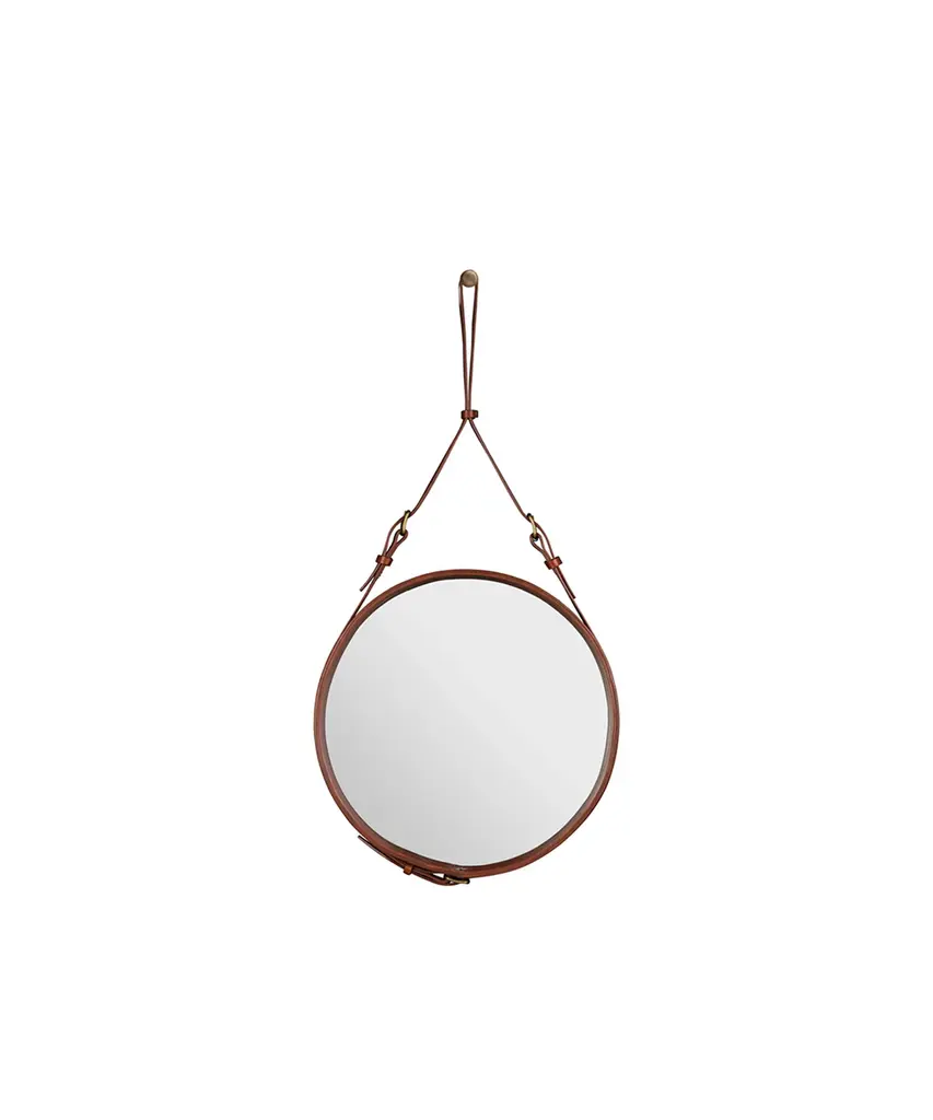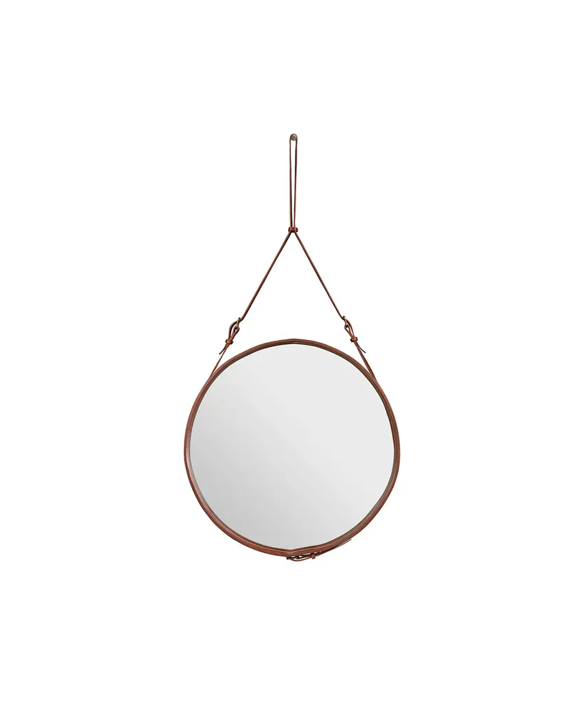 In 1950, Jacques Adnet formed a partnership with a famous French fashion house, where he developed a collection of timeless leather-covered furniture and interior accessories. Known for being an innovative thinker, Adnet was one of the first designers to combine leather with glass. Accordingly, he designed the elegant, distinctive leather mirror with equestrian-inspired detailing. Aside from its remarkable leather and burnished brass details, the mirror is available in three sizes (the strap holding the mirror is in direct proportion to its dimension). The timeless Adnet Mirror adds a sculptural value to any hallway, bathroom, or living room and the three sizes can be combined to create an outstanding expression. Produced by Danish design purveyor and publisher, Gubi.