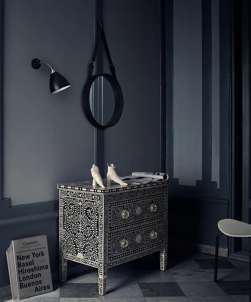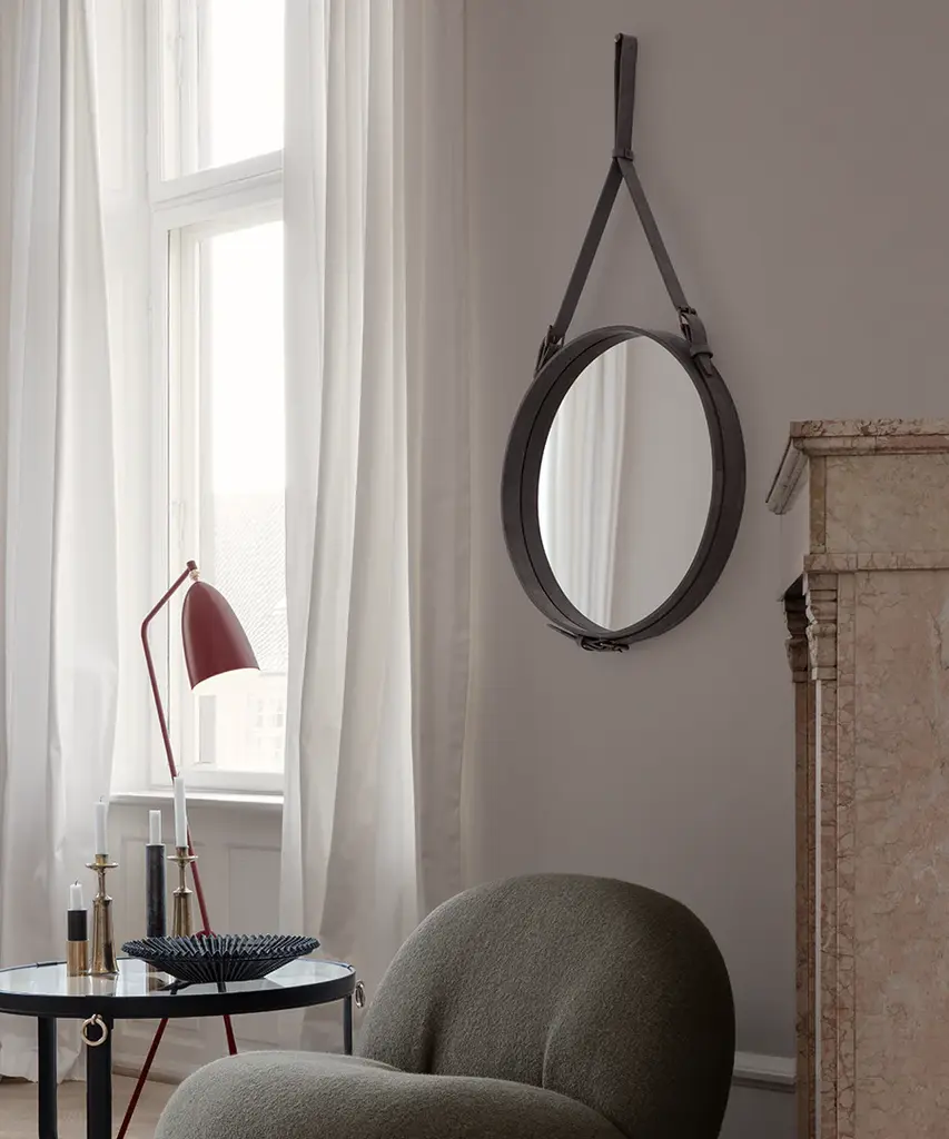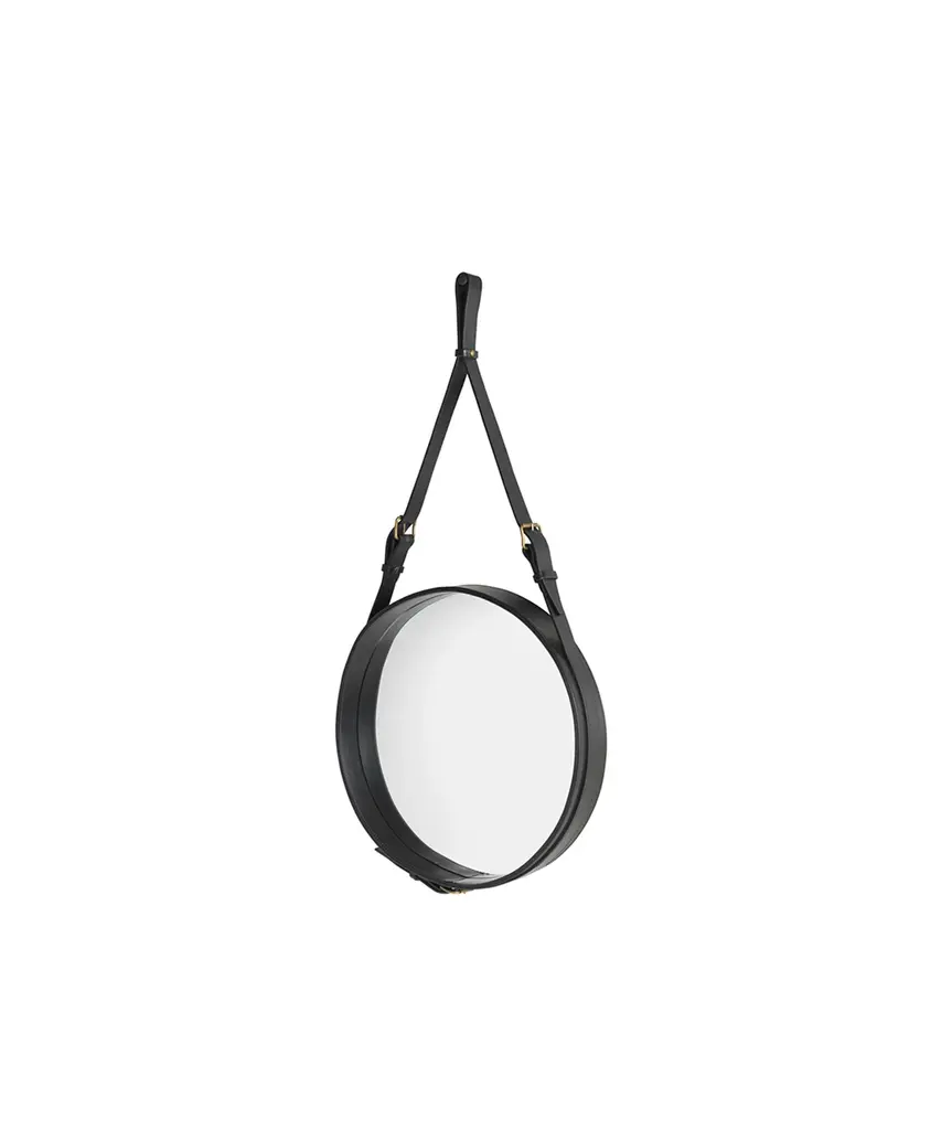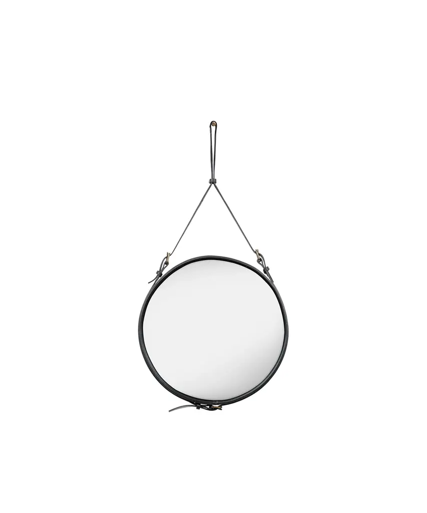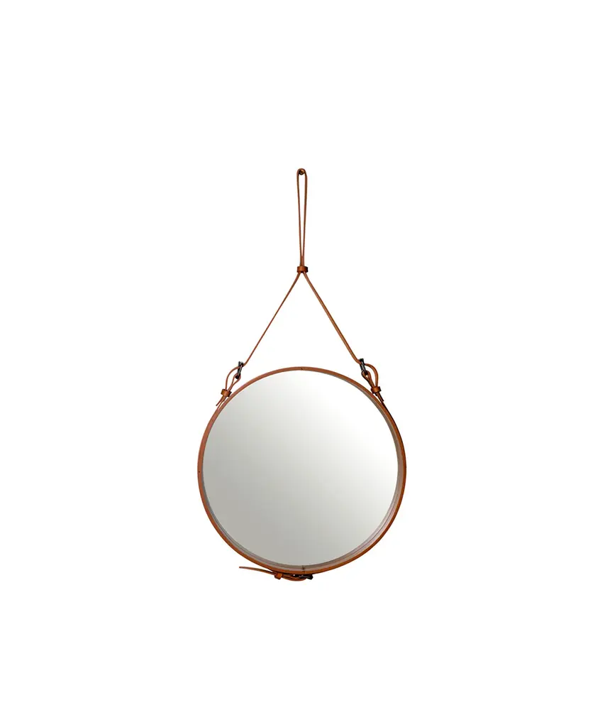 In 1950, Jacques Adnet formed a partnership with a famous French fashion house, where he developed a collection of timeless leather-covered furniture and interior accessories. Known for being an innovative thinker, Adnet was one of the first designers to combine leather with glass. Accordingly, he designed the elegant, distinctive leather mirror with equestrian-inspired detailing. Aside from its remarkable leather and burnished brass details, the mirror is available in three sizes (the strap holding the mirror is in direct proportion to its dimension). The timeless Adnet Mirror adds a sculptural value to any hallway, bathroom, or living room and the three sizes can be combined to create an outstanding expression. Produced by Danish design purveyor and publisher, Gubi.