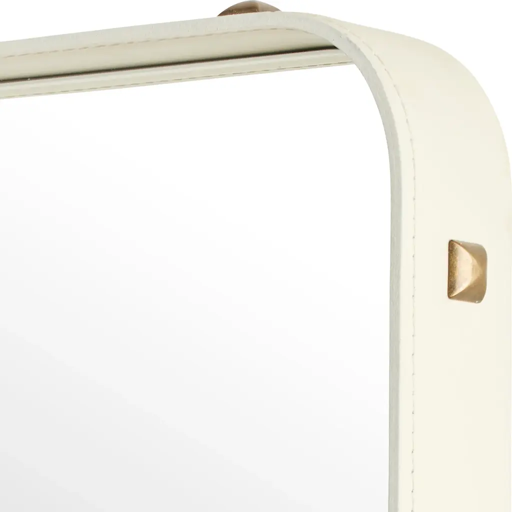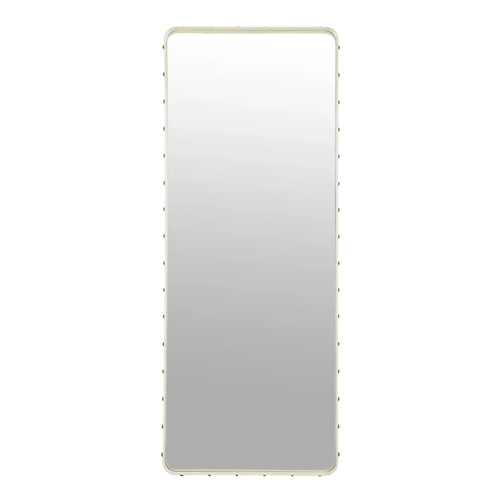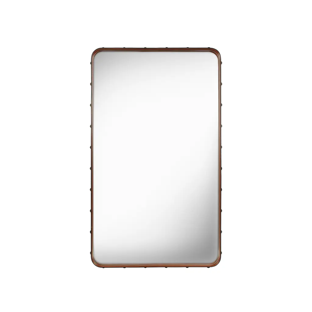 Designer icon extraordinaire Jaques Adnet first teamed with a top 50s Paris couturier for his Adnet Rectangulaire Mirror. Calling on the savoir-faire of the fashion world assured the quality and refinement of the leather-framed mirror studded with burnished brass rivets on the edges, a characteristic detailing of Adnet's work. In 3 sizes, the mirror can be hung either horizontally or vertically, or even be spontaneously leaned against a wall, adding depth and allure to any surroundings.
