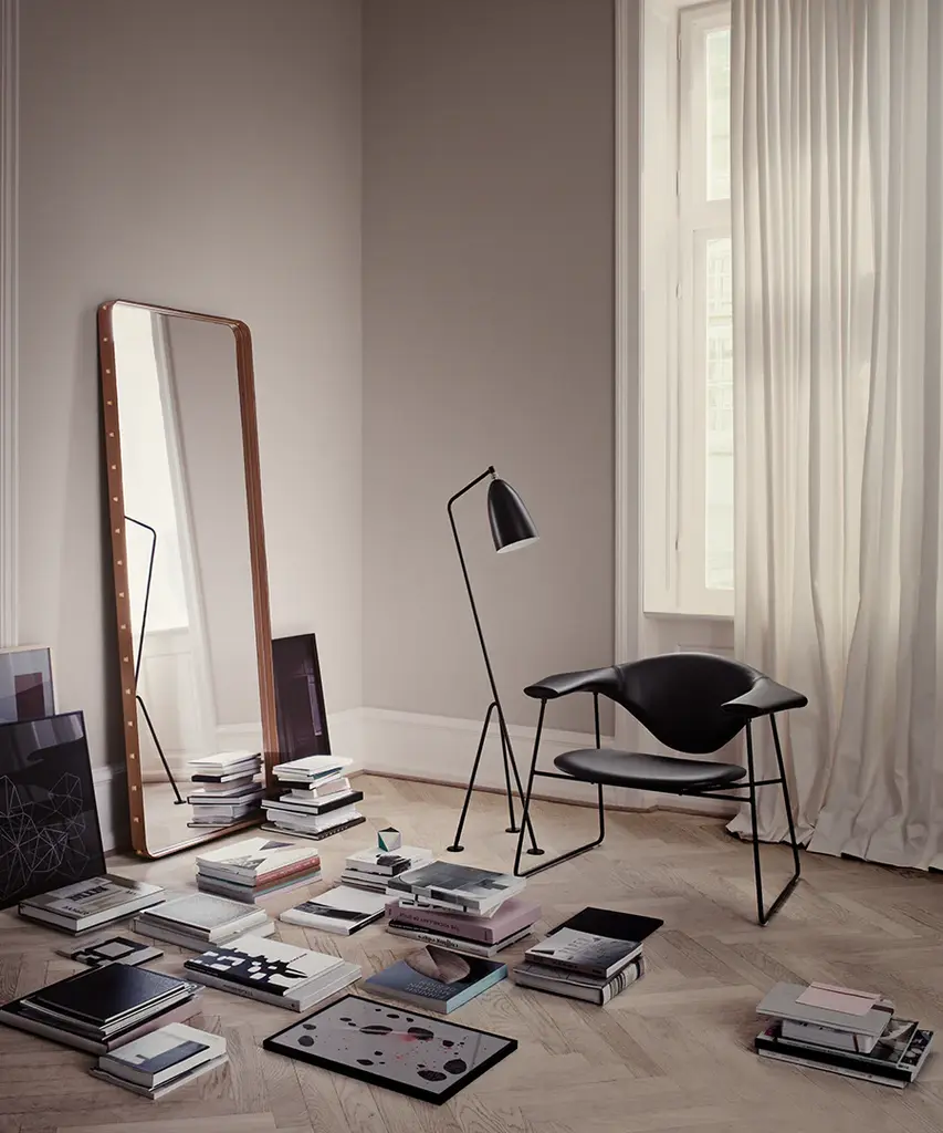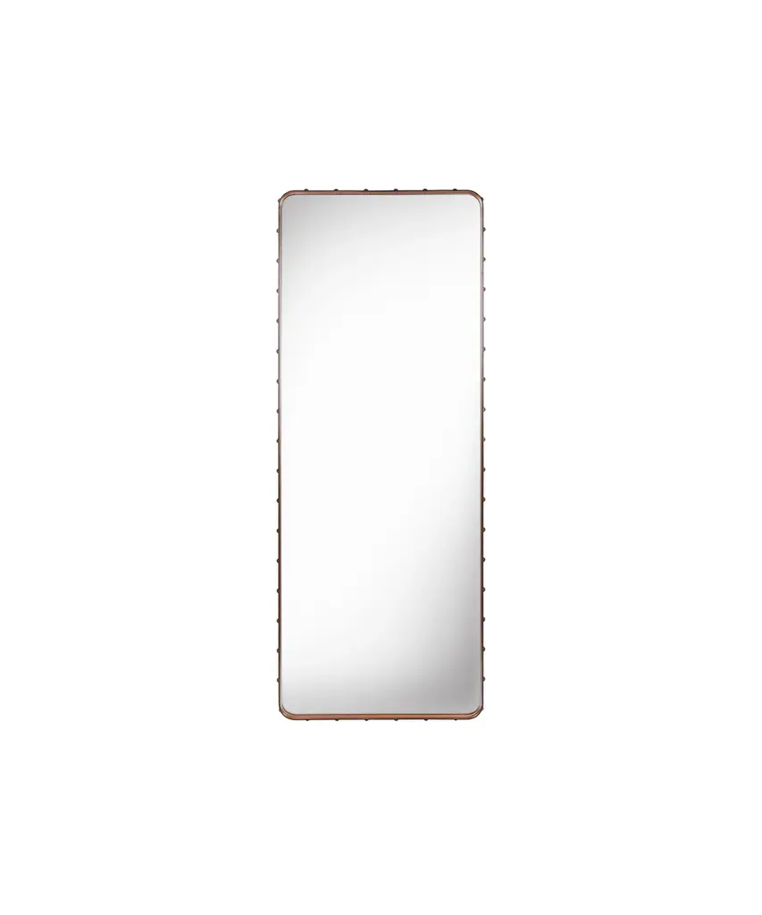 In 1950, Jacques Adnet formed a partnership with a famous French fashion house, where he developed a collection of timeless leather-covered furniture and interior accessories. Known for being an innovative thinker, Adnet was one of the first designers to combine leather with glass. Accordingly, he designed the elegant, distinctive leather mirror with equestrian-inspired detailing. Aside from its remarkable leather and burnished brass details, the mirror is available in three sizes (the strap holding the mirror is in direct proportion to its dimension). The timeless Adnet Mirror adds a sculptural value to any hallway, bathroom, or living room and the three sizes can be combined to create an outstanding expression. Produced by Danish design purveyor and publisher, Gubi.