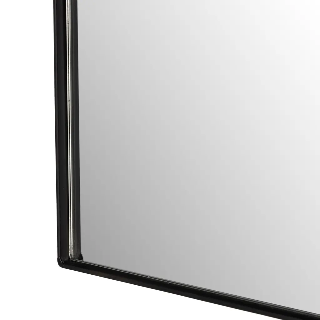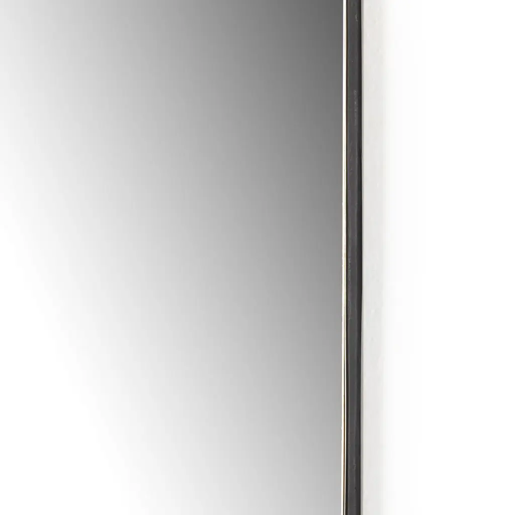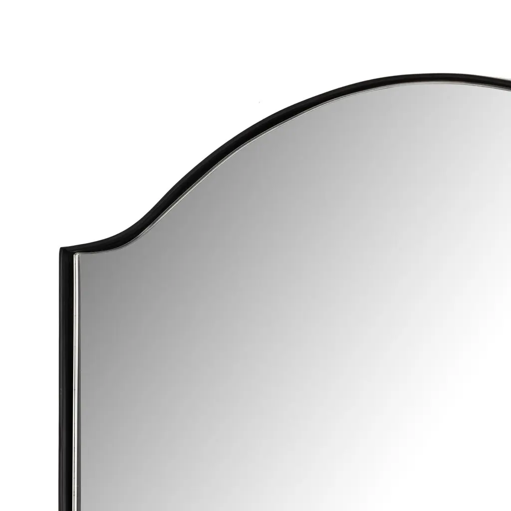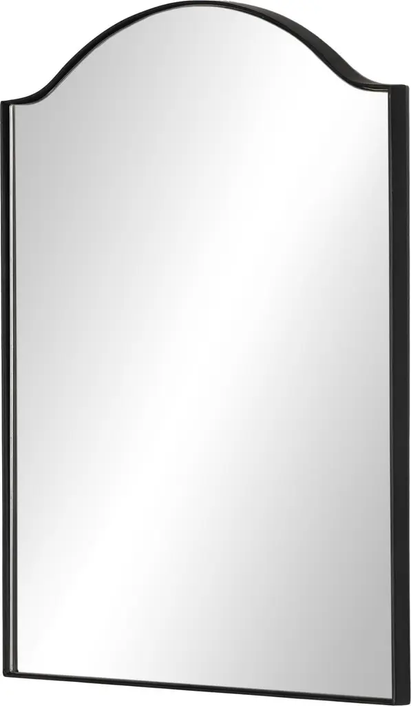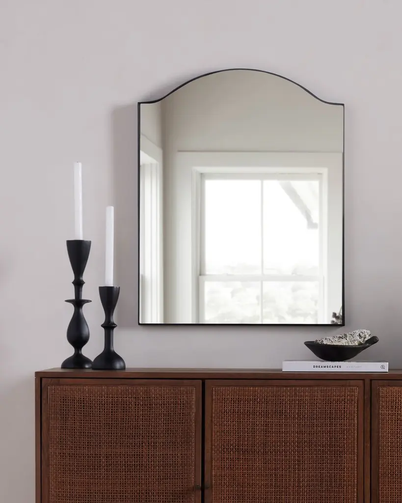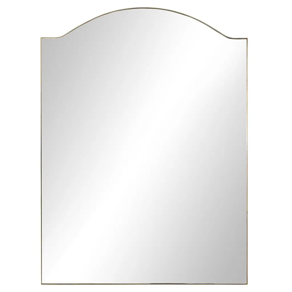 This wall mirror's nearly square proportions, along with its curved top and slender antiqued brass frame, make it a quietly commanding addition to a room.