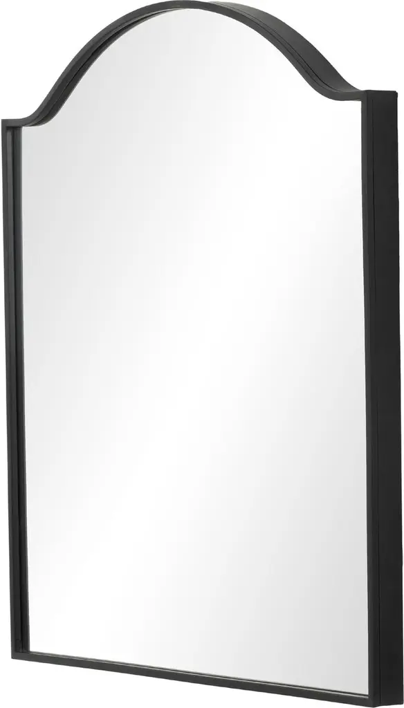 This wall mirror's nearly square proportions, along with its curved top and slender antiqued brass frame, make it a quietly commanding addition to a room.