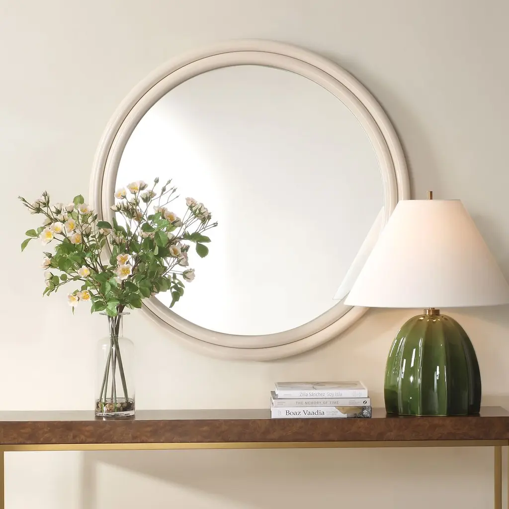 The Adriana round mirror is a tribute to timeless elegance, capturing the essence of classic design. Its gracefully rounded profile exudes simplicity and sophistication, creating a harmonious Silvan that enchants any space. The mirror's high-gloss finish adds a touch of warmth, inviting admiration and reflection. This piece is not just a mirror; it's a window into a world where beauty and simplicity coexist in perfect harmony.