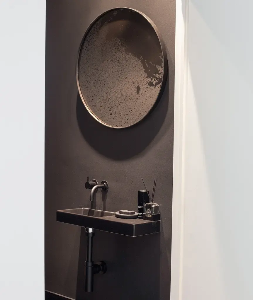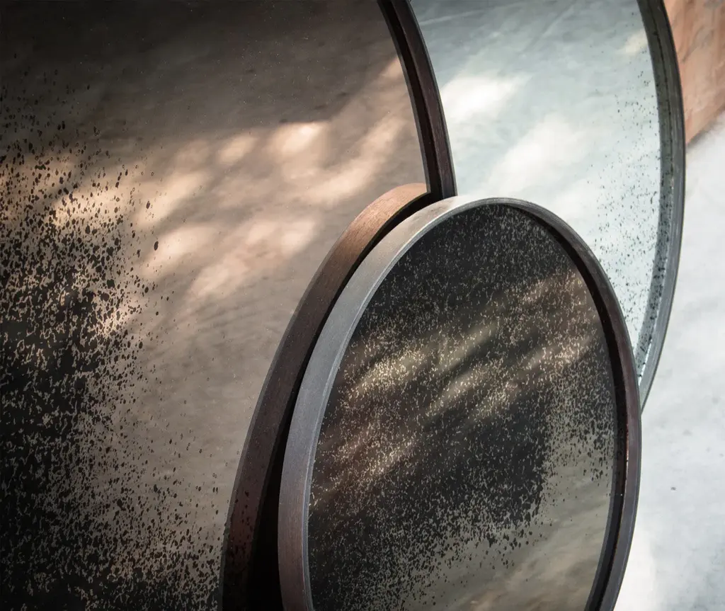 This aged round mirror finds itself in the middle ground between functionality and art. Adorning the living room as wall art or serving a practical purpose in a bathroom or dressing, the unique piece gives the functional object an artful twist. Available in two colors and three sizes.