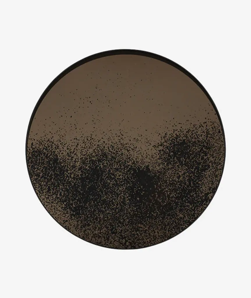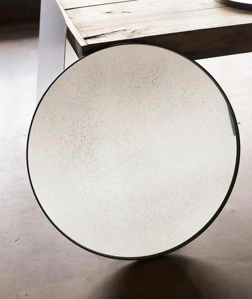 This aged round mirror finds itself in the middle ground between functionality and art. Adorning the living room as wall art or serving a practical purpose in a bathroom or dressing, the unique piece gives the functional object an artful twist. Available in two colors and three sizes.