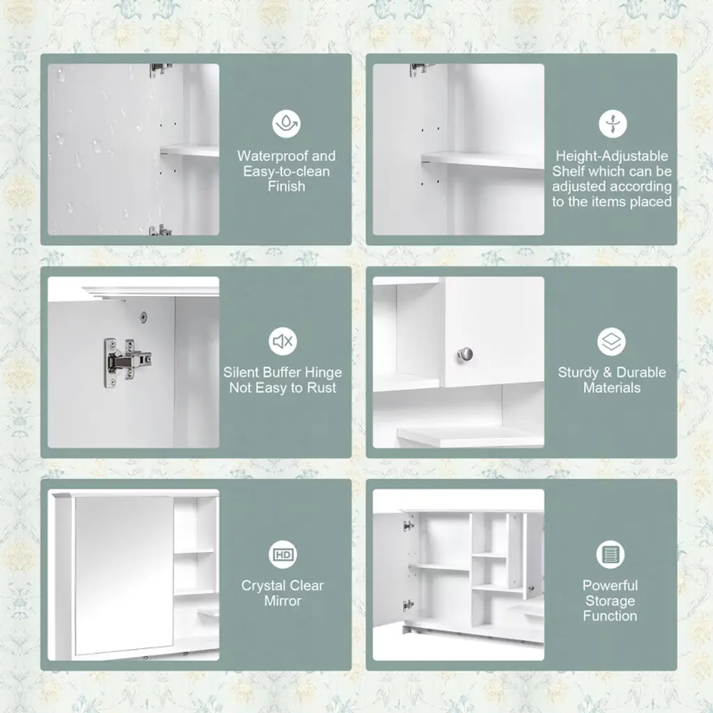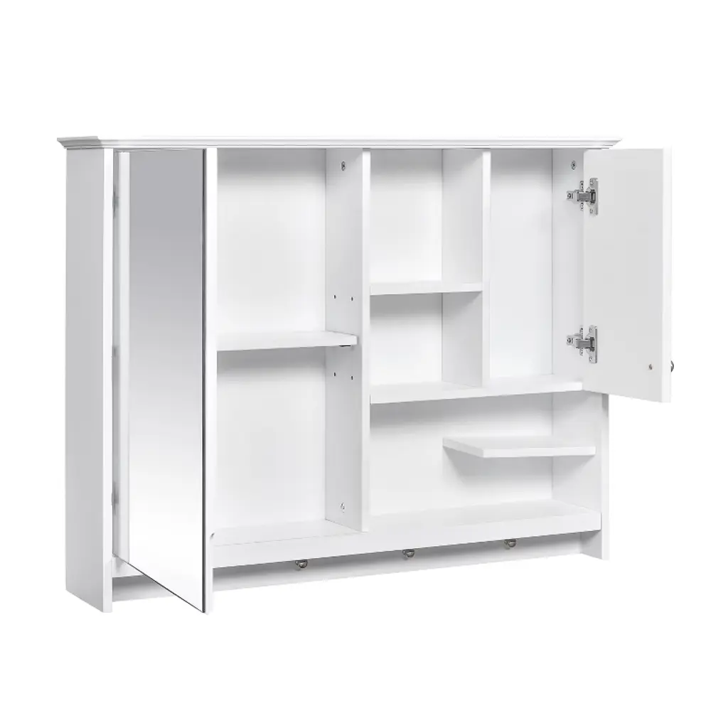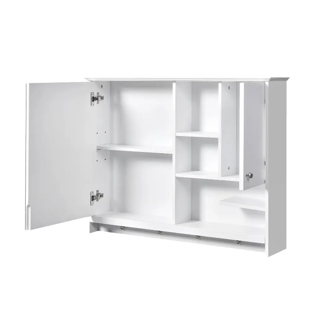 This 36-inch modern and simple wall-mounted mirror cabinet, with its high-definition mirror, adjustable shelves and open storage shelves, cleverly combines practicality and aesthetics, adding a touch of refinement and elegance to your bathroom space. The high-definition mirror provides clear and bright imaging, making your dressing experience more comfortable; the adjustable shelves flexibly adapt to various storage needs, keeping the countertop neat and tidy; the open shelves are convenient for access to commonly used items, and the intimate towel hanging buttons make the details more attentive. It uses high-quality MDF board, which is moisture-proof and mildew-proof, durable, and the simple and smooth line design can easily be integrated into various decoration styles. It is an indispensable and practical choice in modern bathroom space.