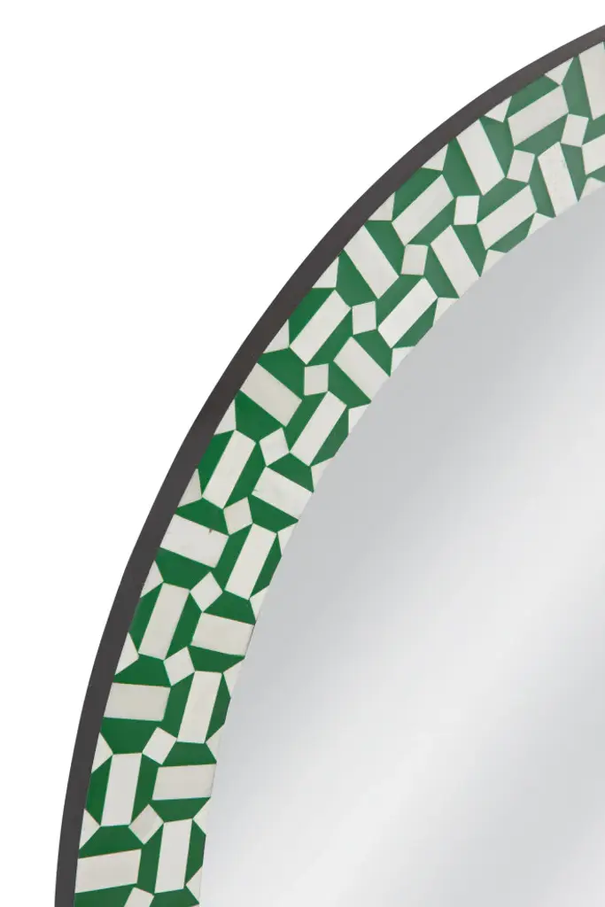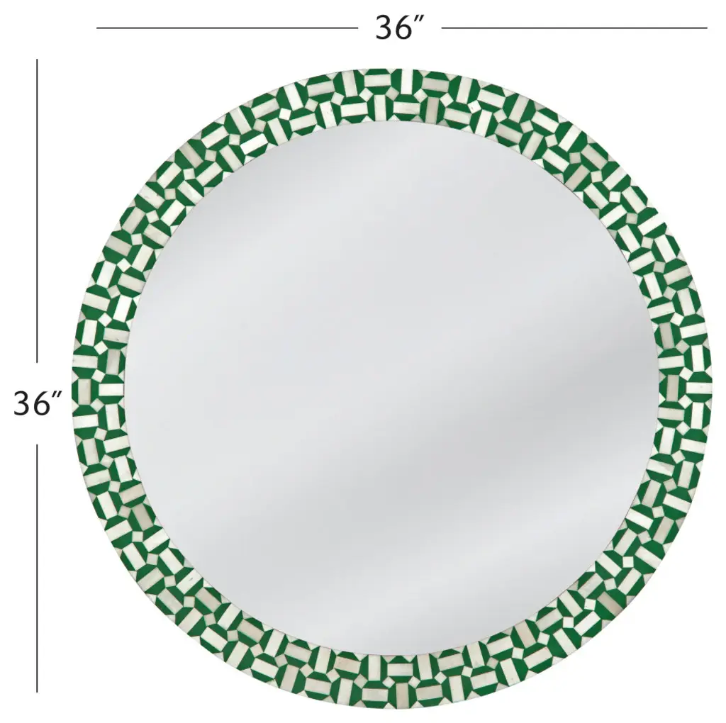 The Alanis Wall Mirror showcases a chic round design, accented with an eye-catching geometric pattern in a vibrant green finish. Its boho-modern aesthetic adds a trendy flair to any space, while the green and cream bone inlay creates a striking contrast for visual appeal. Elevate your decor with this stylish mirror that effortlessly enhances the ambiance of your room, offering a fresh and inviting atmosphere.Features:Seamless blend of boho and modern aestheticsRound silhouette for stylish reliabilityBone accents add a natural element to any spaceCrafted with attention to detail for timeless appealFor over a century, Bassett Mirror has been synonymous with style and quality, transforming homes with its sophisticated and timeless designs. With a wide-ranging collection of furniture, lighting, mirrors, and art, Bassett Mirror seamlessly blends modern style with classic appeal. From rustic modern to luxe glam, each piece is thoughtfully crafted to inspire and elevate any space. Committed to exceptional value and customer care, Bassett Mirror makes it easy for homeowners to create beautiful, personalized interiors with confidence.