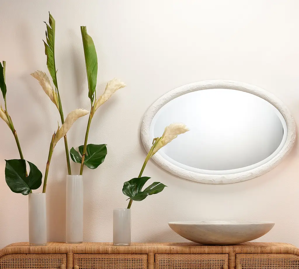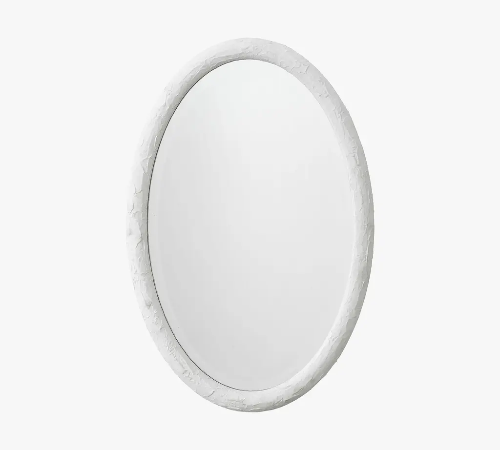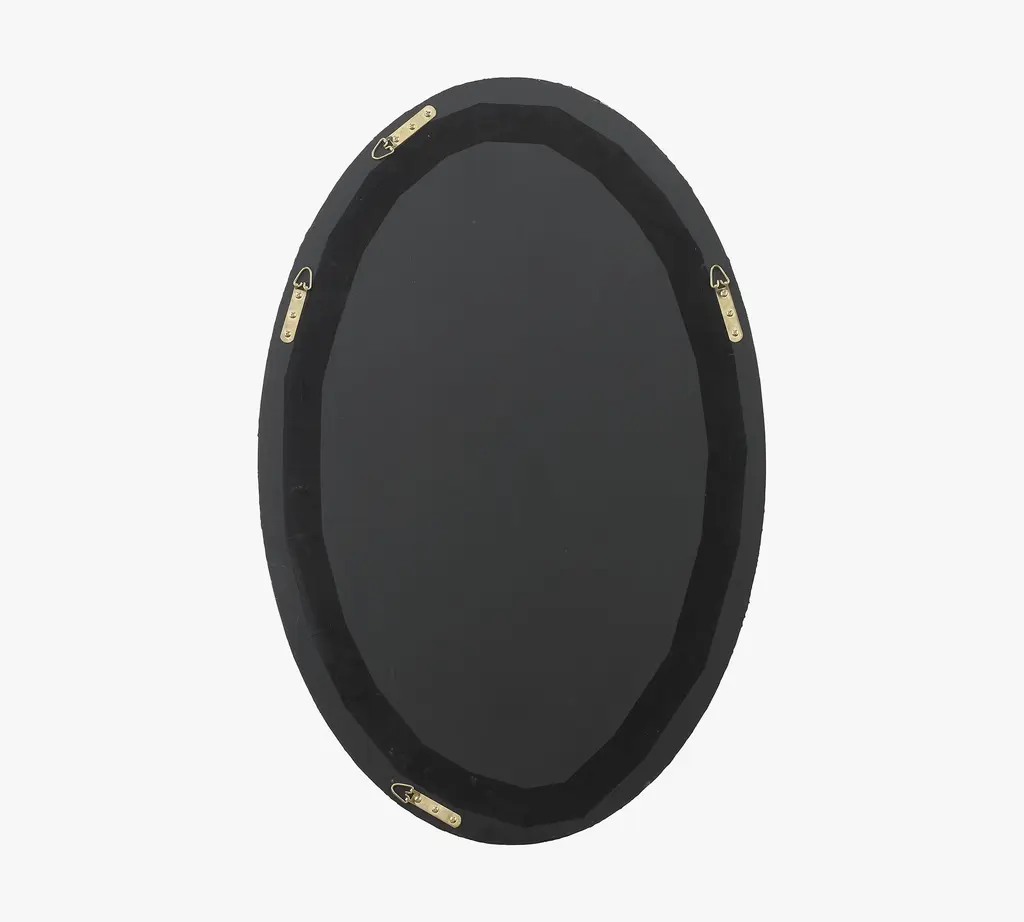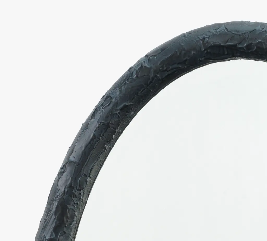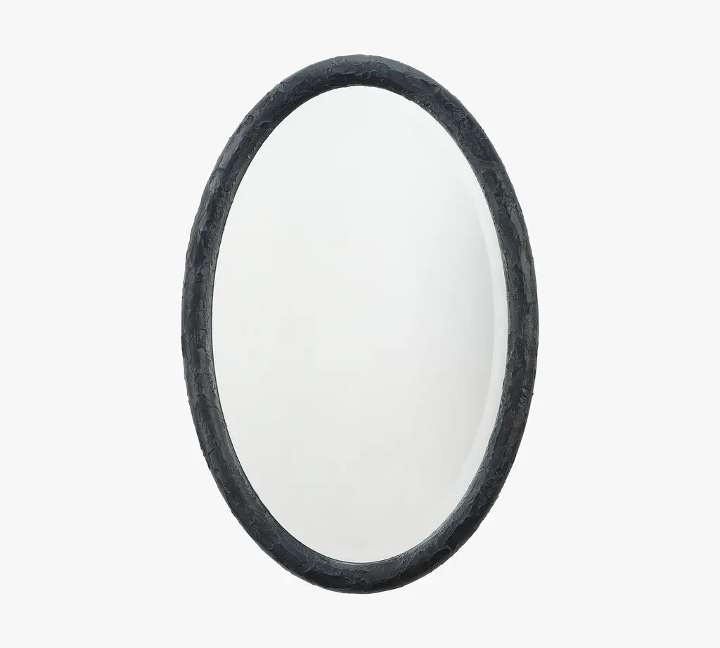 A richly textural charcoal finish enlivens this simple oval mirror. Crafted of resin, it features intriguing organic patterns for dimension and visual interest while still keeping the look clean. Beveled glass adds elegant flair to the mirror, which can be hung horizontally or vertically to suit your space.