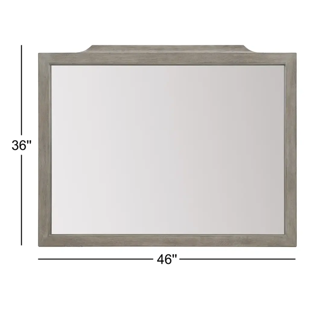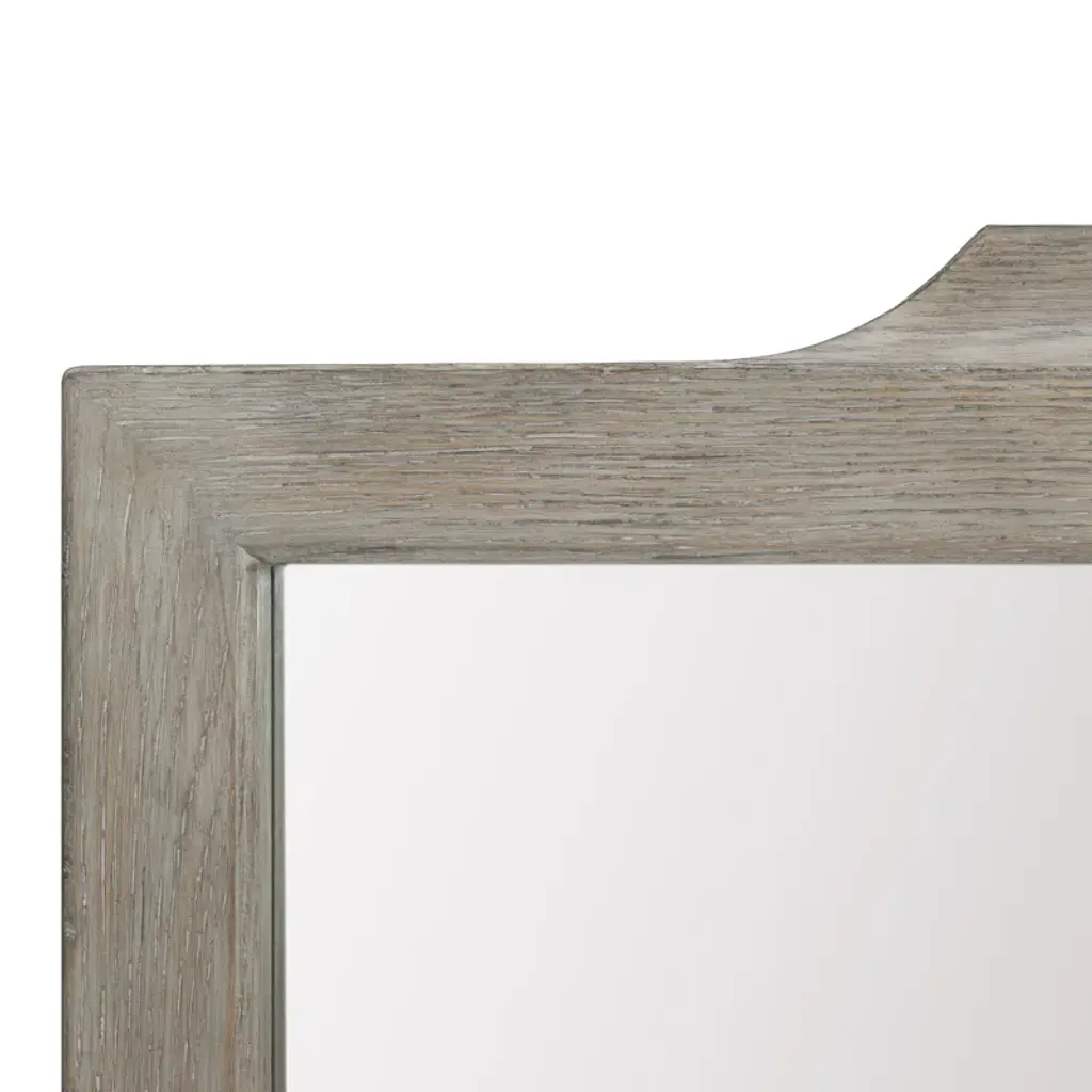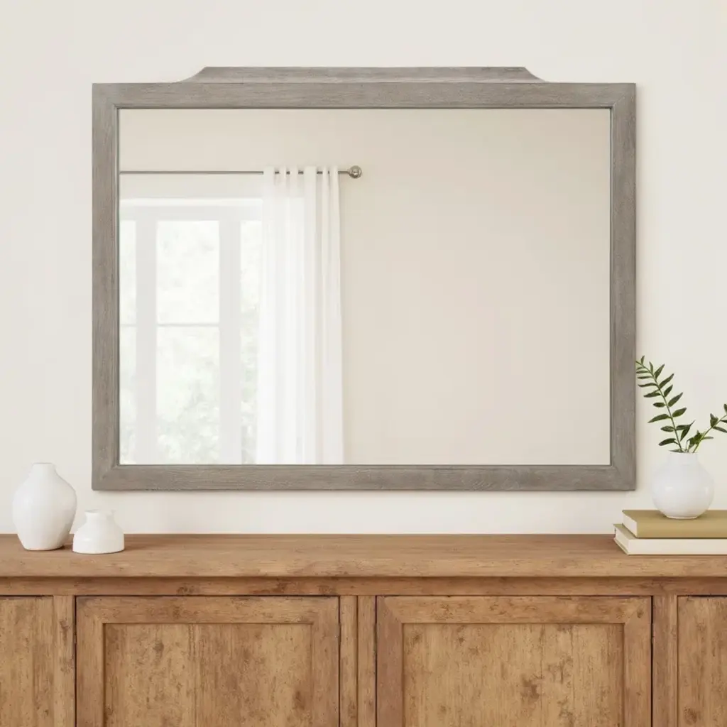 The simple lines give a classic beauty to the Albion mirror. A wood frame in a Pewter finish is highlighted with a curved and sloping detail at the top. The design includes inset non-beveled mirrored glass.