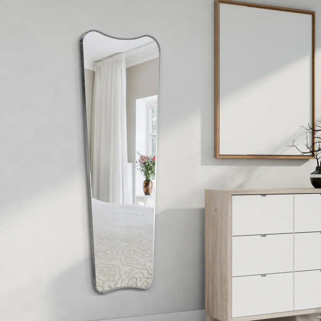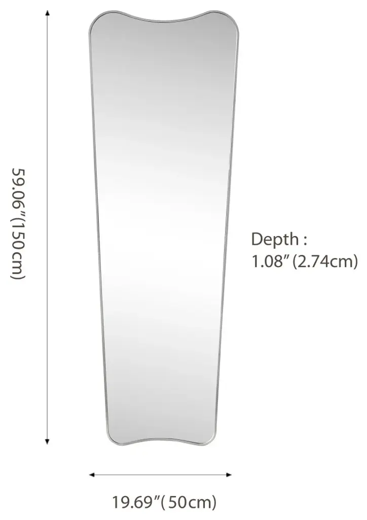 The classic curves of this modern dressing mirror add an Art Deco vibe to any space. This versatile wall-hung or wall-leaning design is strengthened by a narrow metal frame. Its vertical orientation is ideal for a closet, bedroom or entry area.Features:• Mirrored glass has a minimalist nickel metal frame• Sleek, contemporary design provides a full height view that visually expands your space• Add a touch of glam to a bedroom or living room with the sculptured curves of this versatile mirror• Mounting Options: Designed for single-orientation hanging with hooks• Hanging device: MDF backboard• with • Mirror Orientation: Vertical• Body Material: Metal• 59.06 inches high x 19.69 inches wide x 1.08 inches deepAbout us:You see an ordinary mirror.We see an enhancement to help with making your fashionable statement.A perfectly smooth-edged frame with LED lighting and uniform surface casts a flaring reflection of the subject and surroundings. Our vast mirror catalog includes a variety of designs, shapes and sizes.JONATHAN Y Lighting - a fashion revolution in home decor.