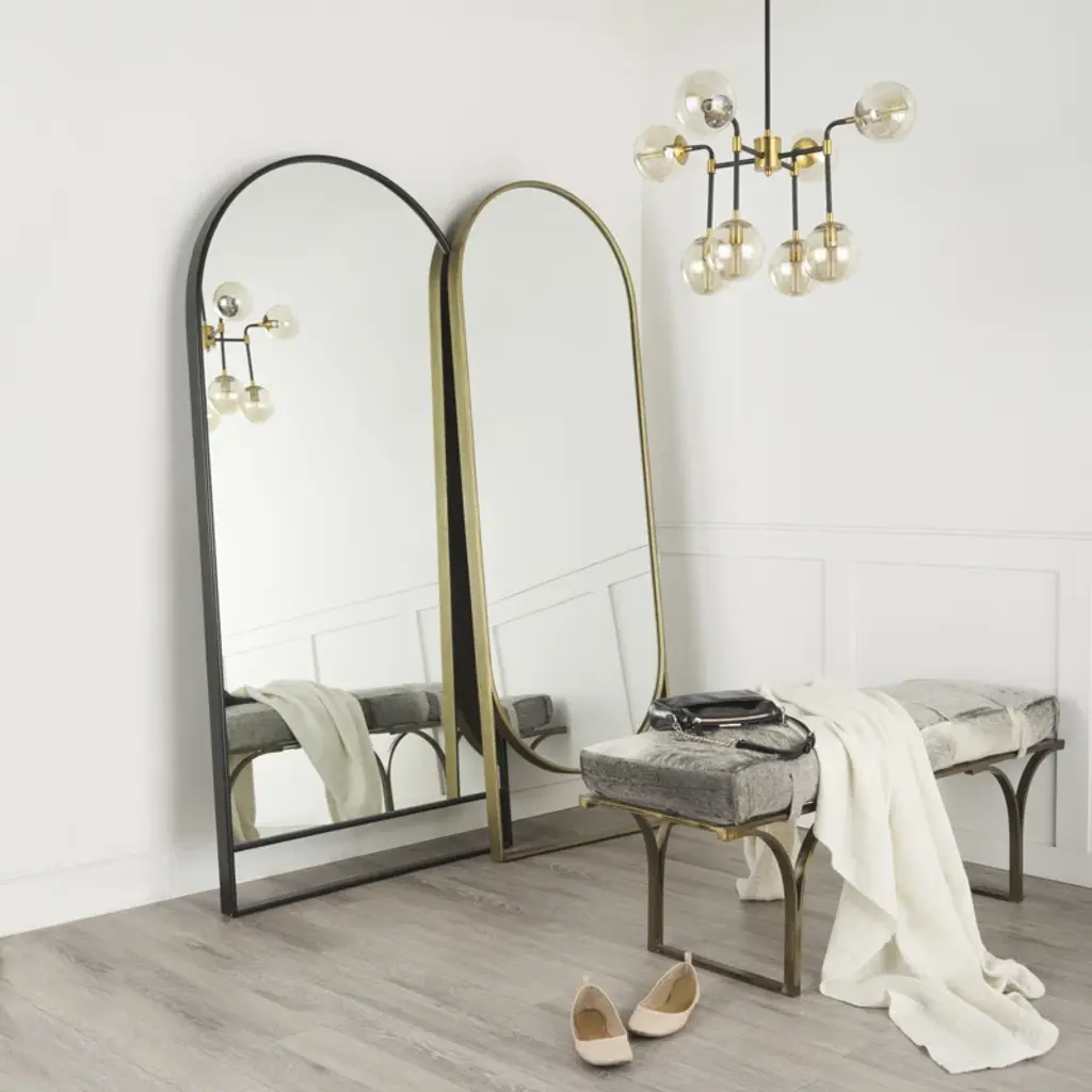 Crafted from premium metal framing, which is sturdy and durable in nature. The mirror has a thin metal frame finished in a simple yet elegant antique gold color. The mirror has unique lines toward the bottom of the mirror, that add visual interest and design to the seemingly simple mirror.