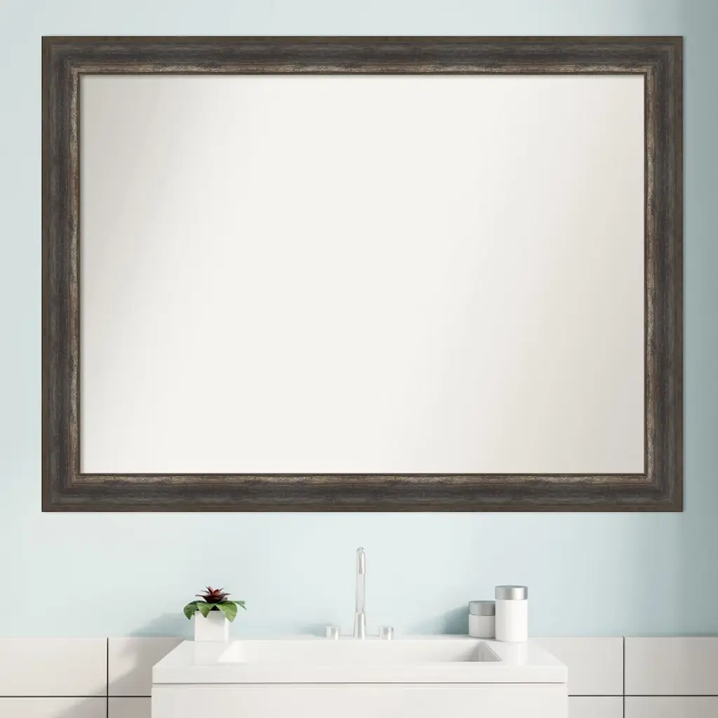 Give your bathroom the finishing touch with this Non-Beveled bathroom mirror. The Alta Rustic Char frame is a brown, grey, and bronze-toned frame reminiscent of charred, distressed wood with each edge finished in brushed shiny pewter. The frame is 2.5 in. wide and stands 1 in. off the wall. It's Individually made using traditional custom framing techniques, it has the quality you expect from your local frame shop. It holds its value with premium finishing that can be appreciated up close. Because of our attention to detail and focus on artistry, architects, interior designers, and homeowners alike choose this mirror to create beautiful living spaces.