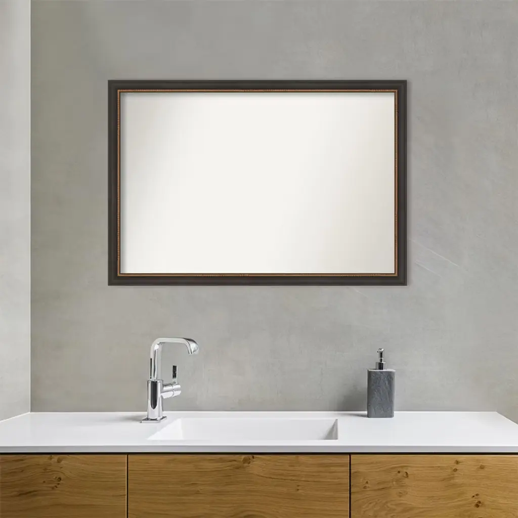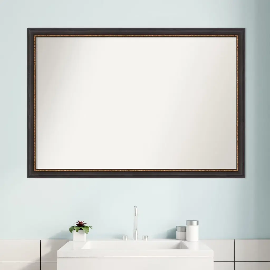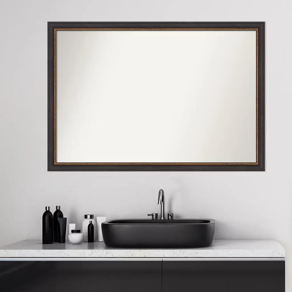 Give your bathroom the finishing touch with this 100% real wood Non-Beveled bathroom mirror. The Ashton Black frame is a slightly mottled matte black frame with a lifted outer ridge that curves to an inner gold beaded edge.. The frame is 1.5 in. wide and stands 1.25 in. off the wall. It's Individually made using traditional custom framing techniques, it has the quality you expect from your local frame shop. It holds its value with premium finishing that can be appreciated up close. Because of our attention to detail and focus on artistry, architects, interior designers, and homeowners alike choose this mirror to create beautiful living spaces.