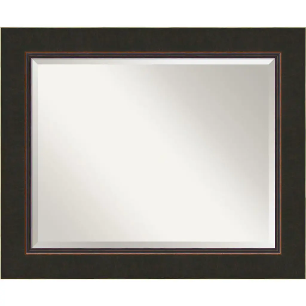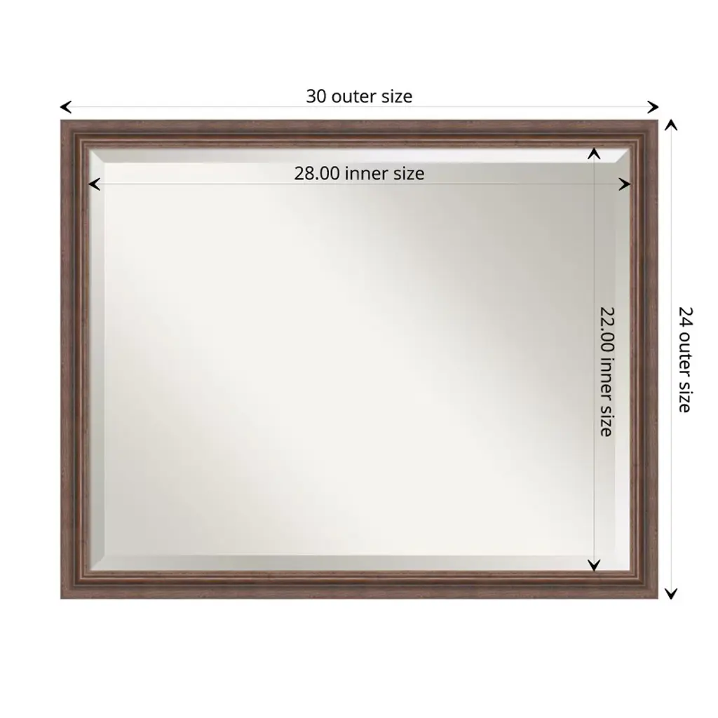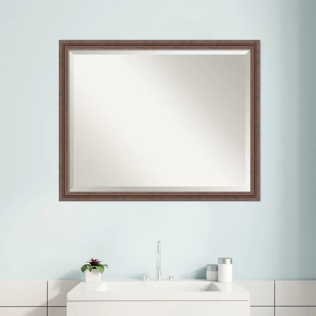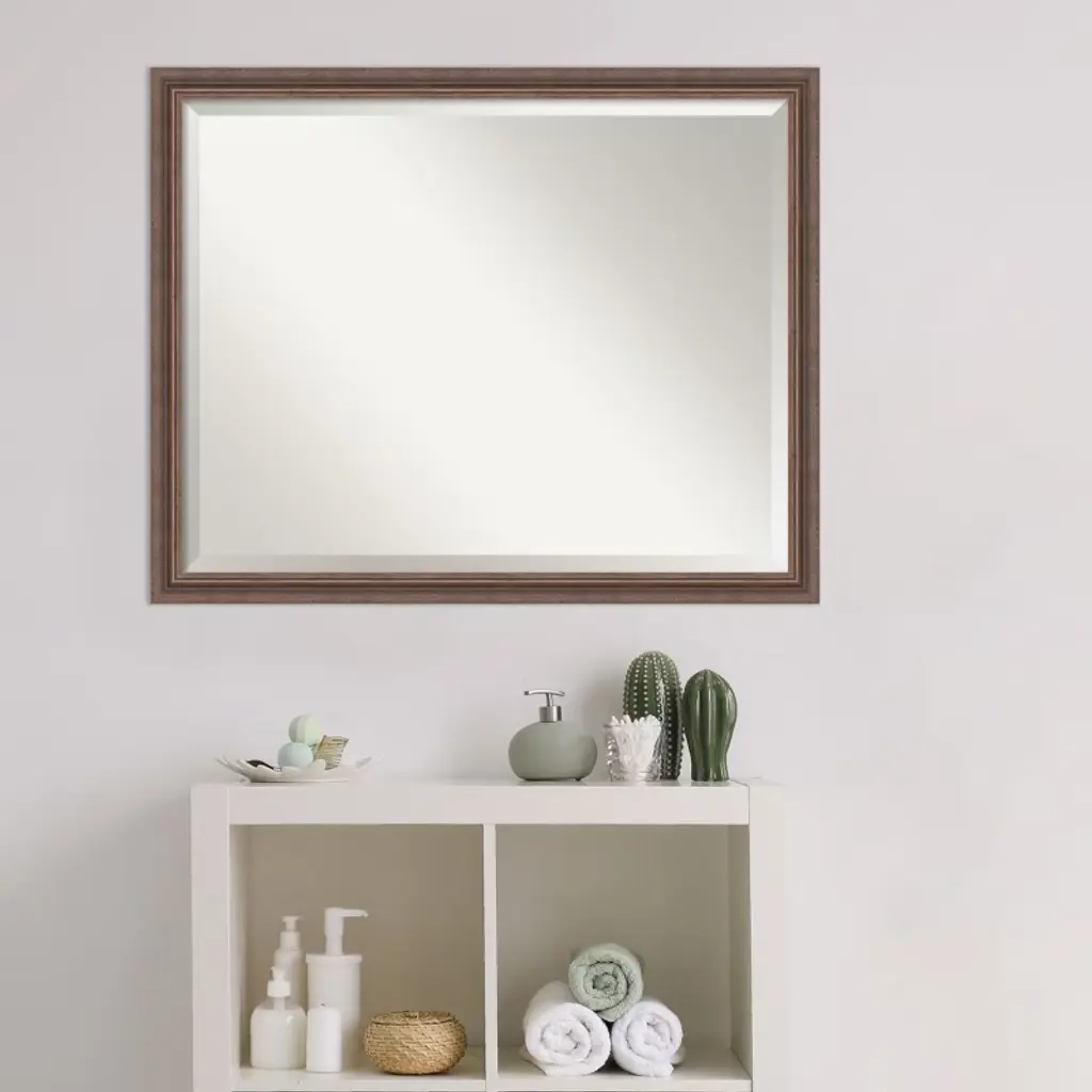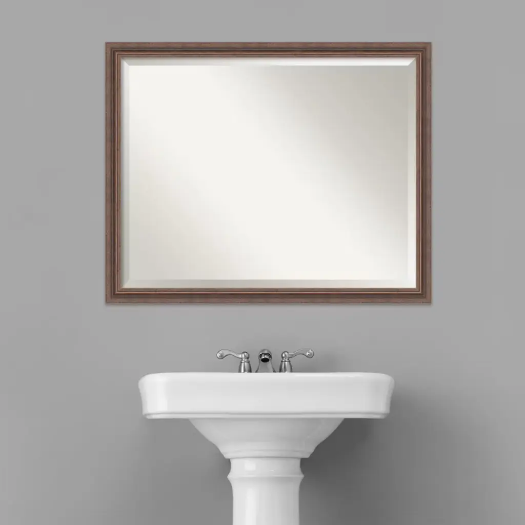 Give your bathroom the finishing touch with this 100% real wood Beveled bathroom mirror. The Distressed Rustic Brown frame is a rustic frame with weathered blue-grey scraping over a medium brown wood tone finish and a smooth raised inner curve.. The frame is 1.5 in. wide and stands 0.75 in. off the wall. It's Individually made using traditional custom framing techniques, it has the quality you expect from your local frame shop. It holds its value with premium finishing that can be appreciated up close. Because of our attention to detail and focus on artistry, architects, interior designers, and homeowners alike choose this mirror to create beautiful living spaces.