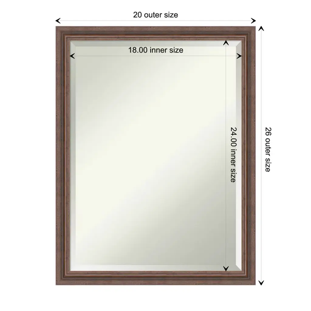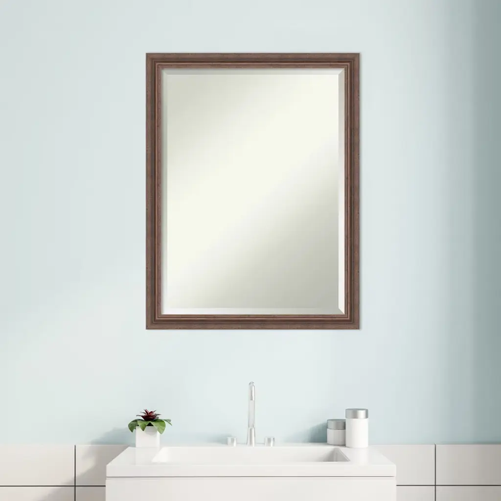 Give your bathroom the finishing touch with this 100% real wood Beveled bathroom mirror. The Distressed Rustic Brown frame is a rustic frame with weathered blue-grey scraping over a medium brown wood tone finish and a smooth raised inner curve.. The frame is 1.5 in. wide and stands 0.75 in. off the wall. It's Individually made using traditional custom framing techniques, it has the quality you expect from your local frame shop. It holds its value with premium finishing that can be appreciated up close. Because of our attention to detail and focus on artistry, architects, interior designers, and homeowners alike choose this mirror to create beautiful living spaces.