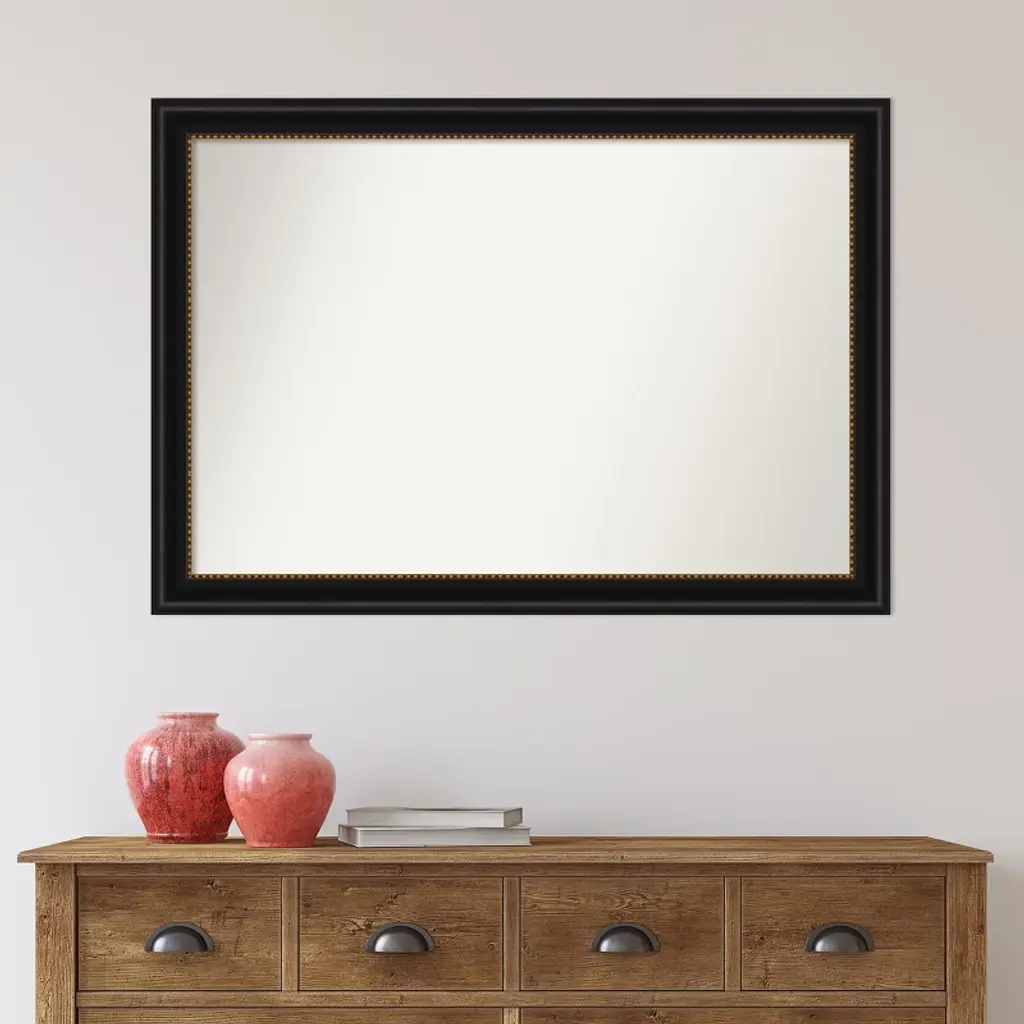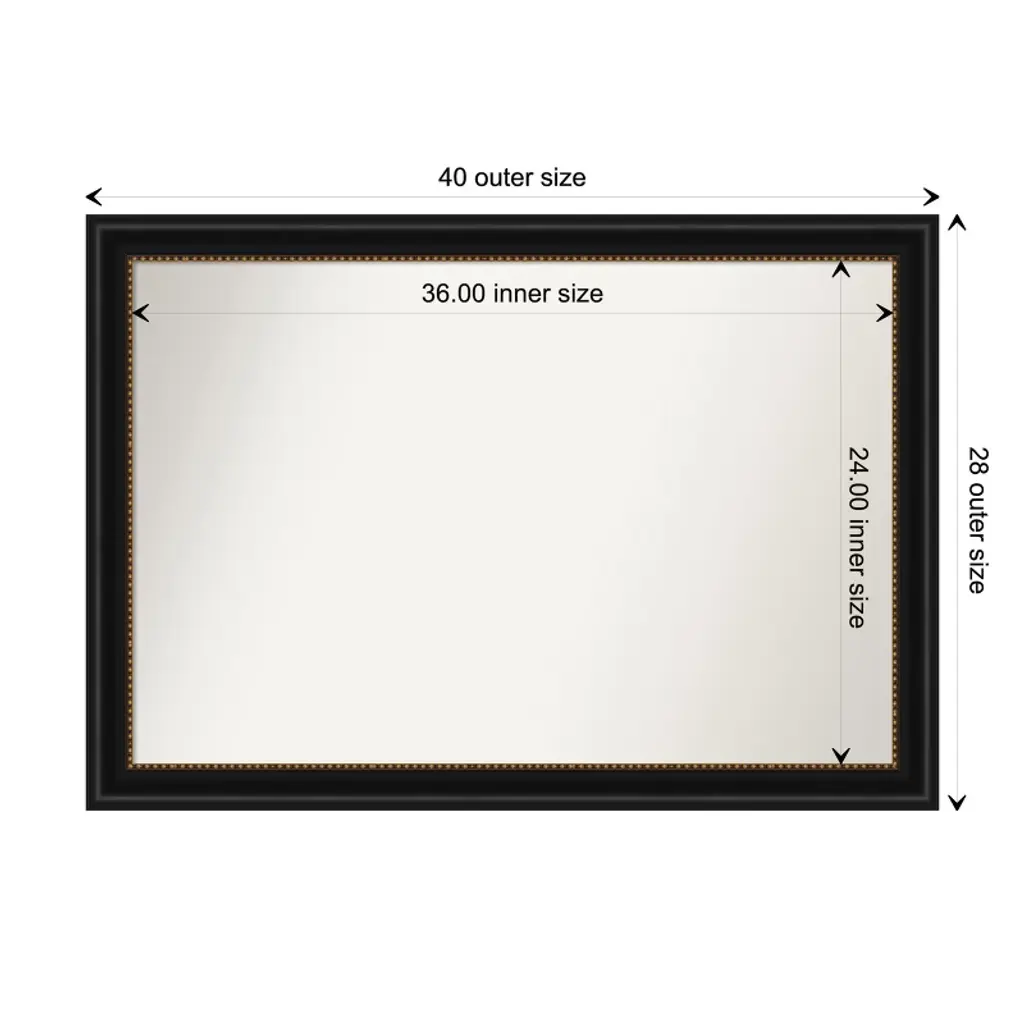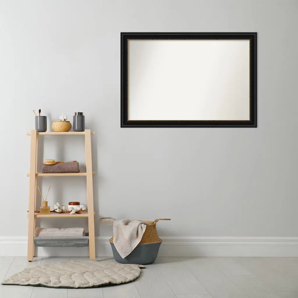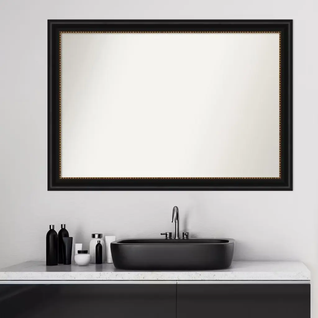 Give your bathroom the finishing touch with this Non-Beveled bathroom mirror. The Manhattan Black frame is a black scooped frame with antique gold beaded inner edge. The frame is 2.25 in. wide and stands 1 in. off the wall. It's Individually made using traditional custom framing techniques, it has the quality you expect from your local frame shop. It holds its value with premium finishing that can be appreciated up close. Because of our attention to detail and focus on artistry, architects, interior designers, and homeowners alike choose this mirror to create beautiful living spaces.