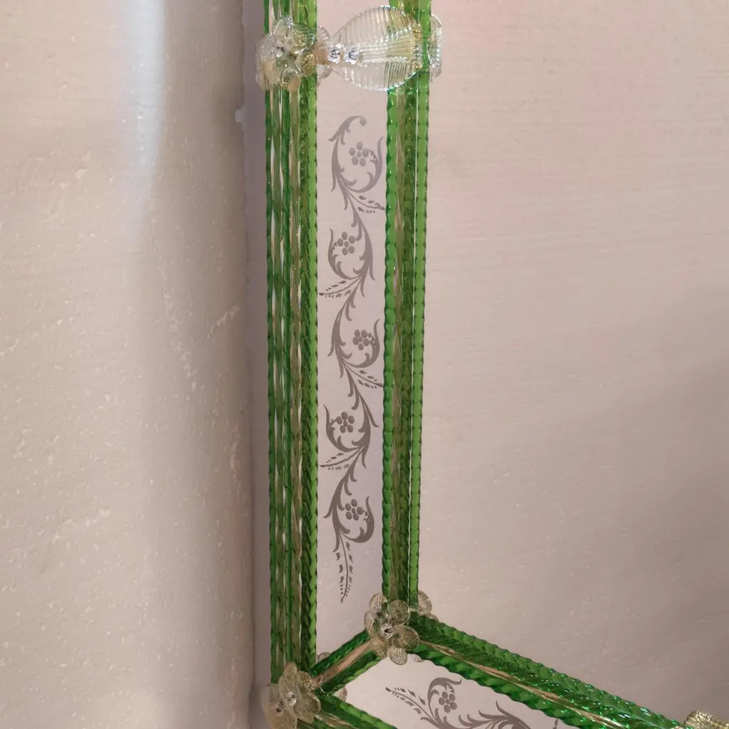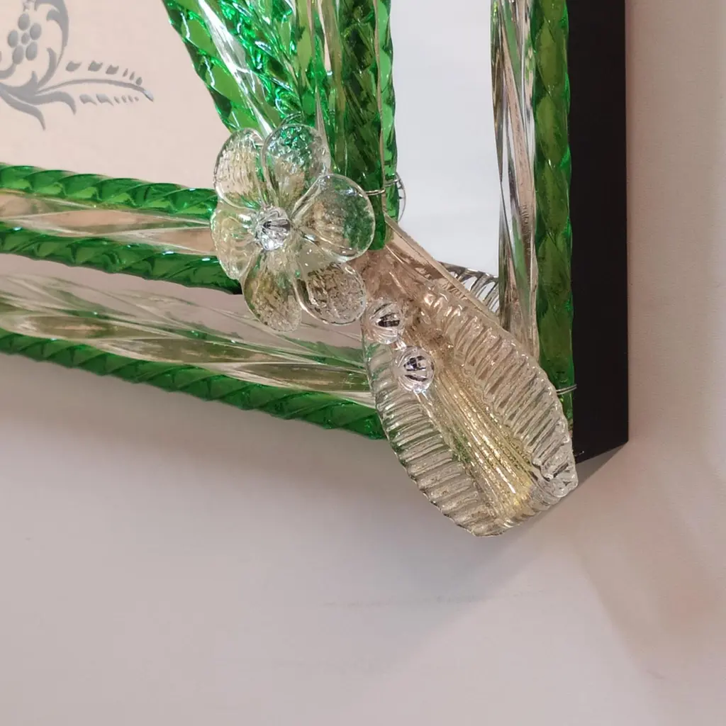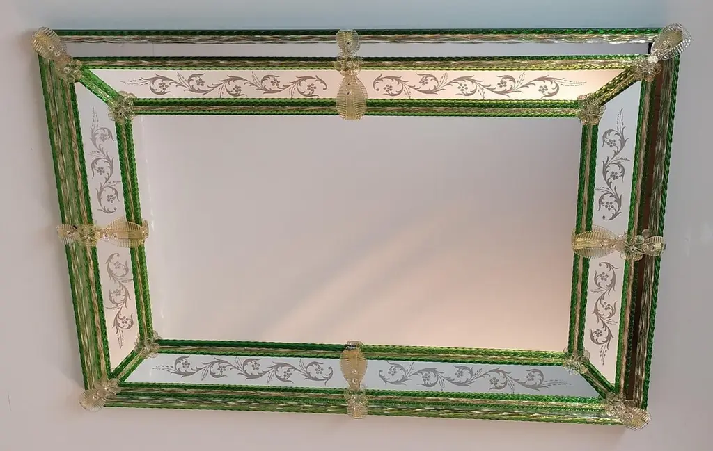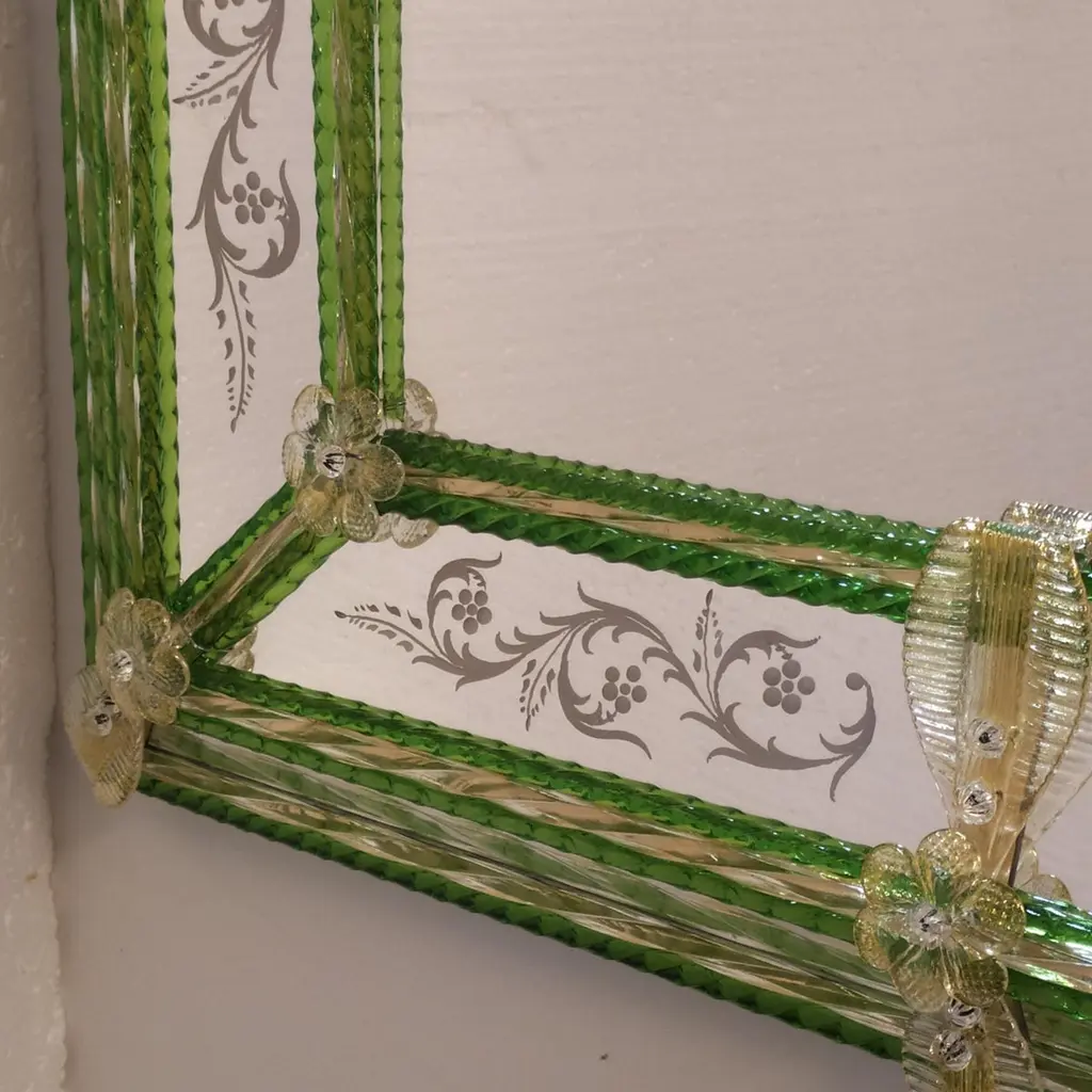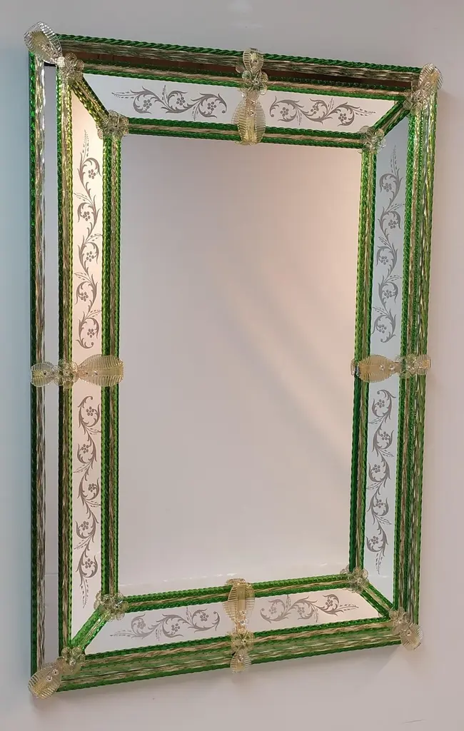 "Amazzonia" Rectangular Venetian mirror with two inclinations, in Murano glass, in classic style, made by the expert hands of the Murano masters, with an emerald green and gold colored frame in Murano glass on a gold background, the engravings on the bands adorning this luxurious mirror are completely handmade, and the finishes composed of roses and leaves of various sizes are in 24Kt gold crystal which embellish this wonderful mirror, made in the Fratelli Tosi workshop on the island of Murano since 1900.