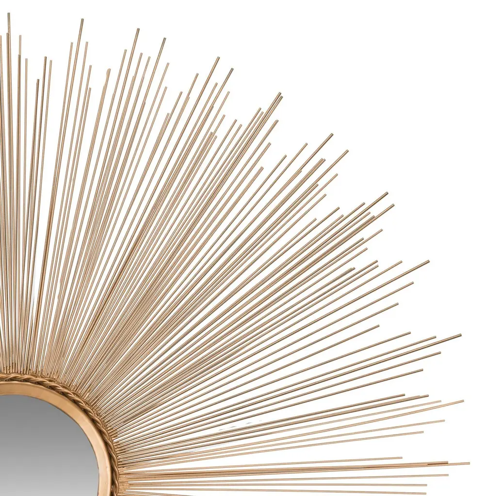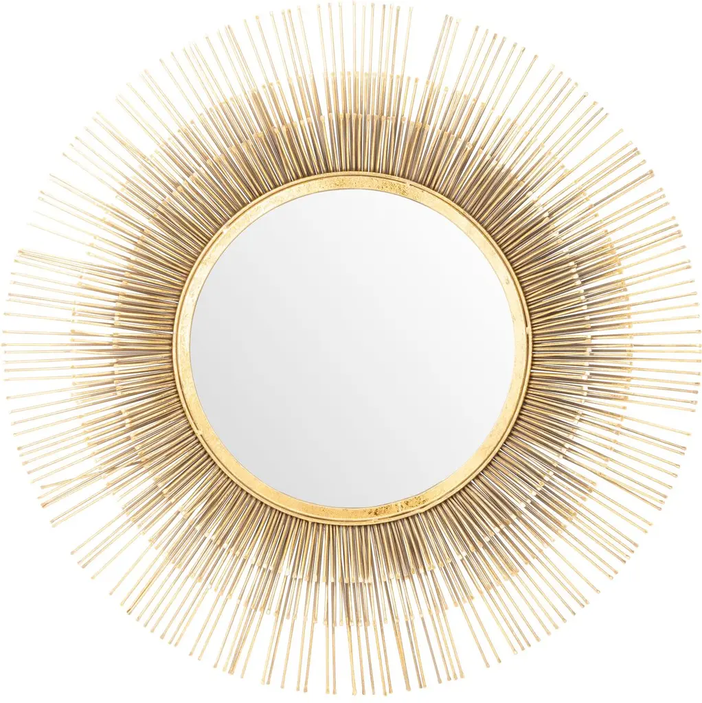 This mirror, crafted from iron, wood, and mirrored glass, is perfect for any contemporary setting. It offers a modern twist on the classic sunburst design, making it a stylish addition to any room.