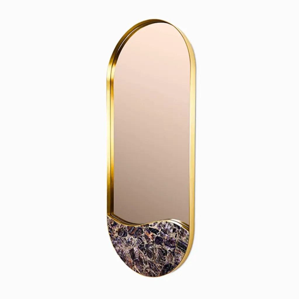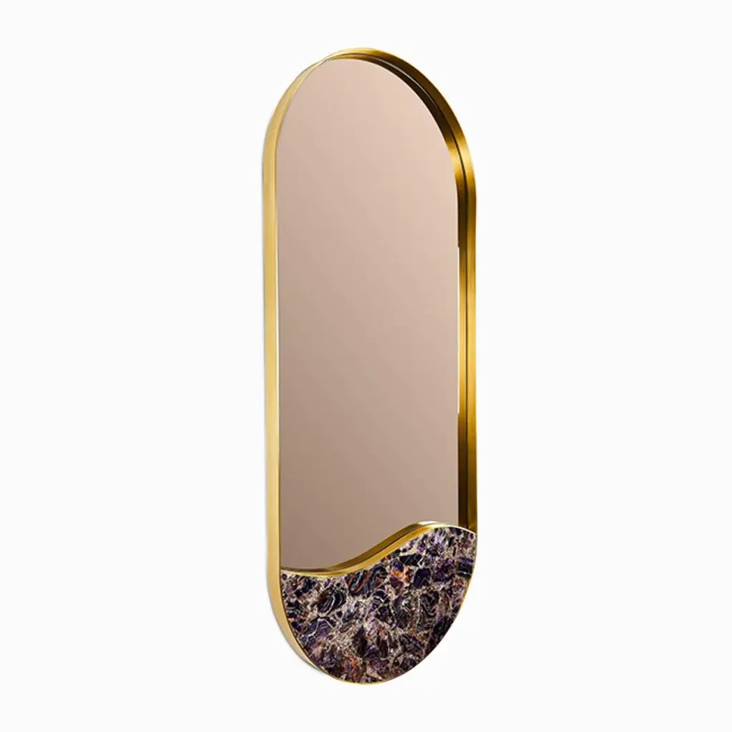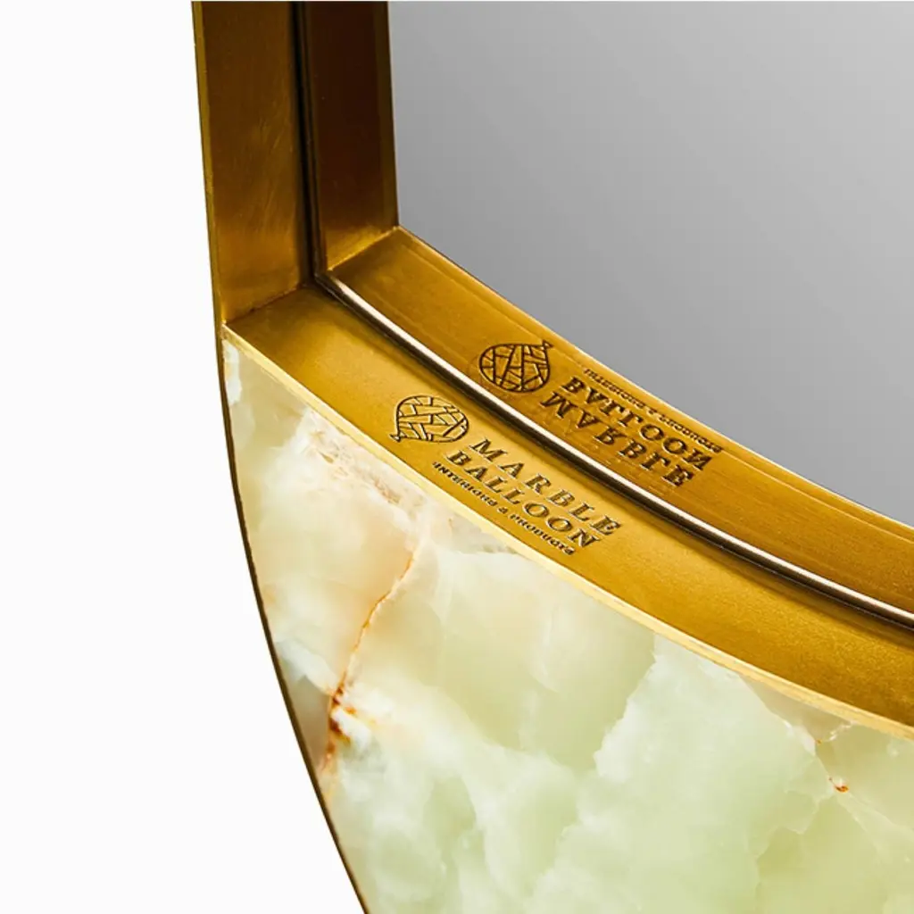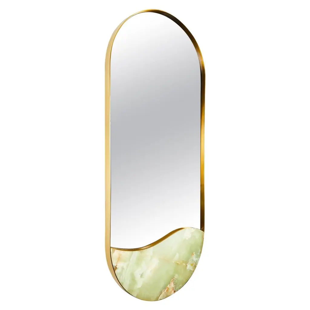 Onyx Kura mirror by Marble BalloonDimensions: W 50 x D 5 x H 120 cmMaterials: Brass, Onyx Inspired by the flow of Aras River, it combines 100% brass frame with semi-precious stone details. Semi-precious stones are available in either green onyx or amethyst.Marble balloon is an interior design and high-end furniture brand based in Istanbul. Marble balloon is devoted to create refined and sophisticated designs bringing the premium quality materials and finest craftsmanship together. Adhering to a design philosophy cherishing organic and asymmetrical forms whilst challenging the nature of marbles implying fluidity, incorporating only the extraordinary marbles and natural stones into handcrafted and timeless creations.