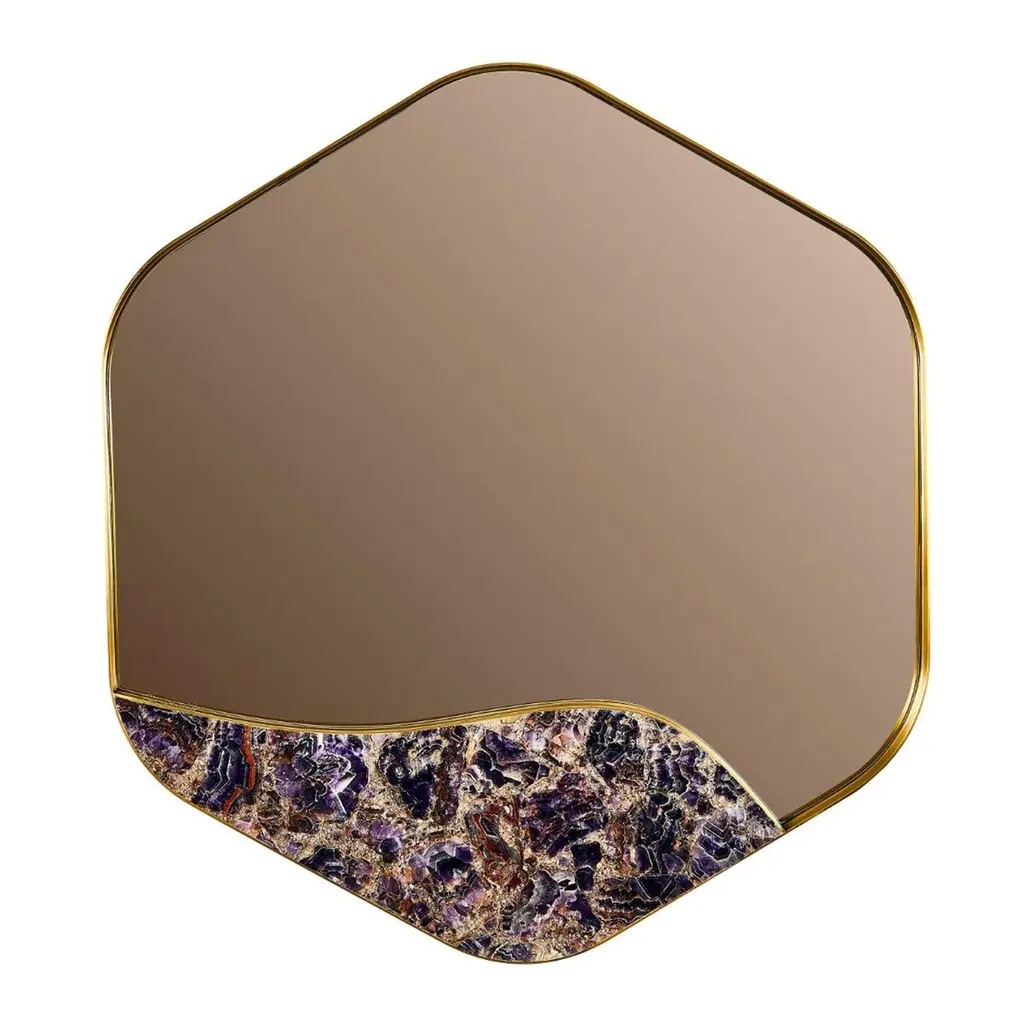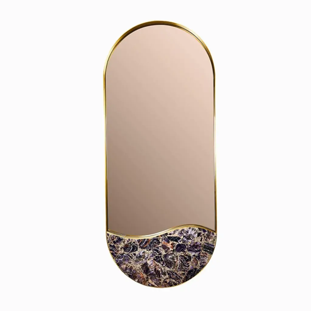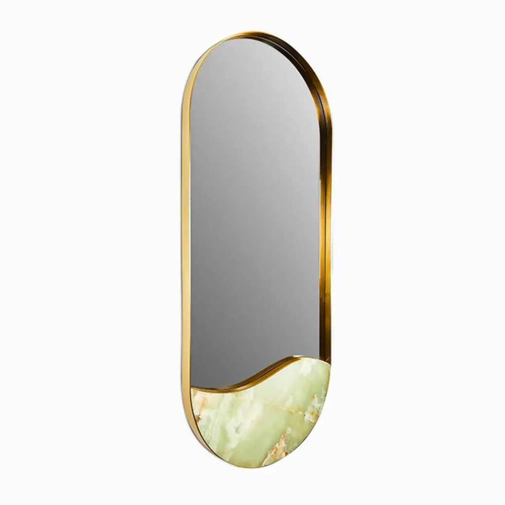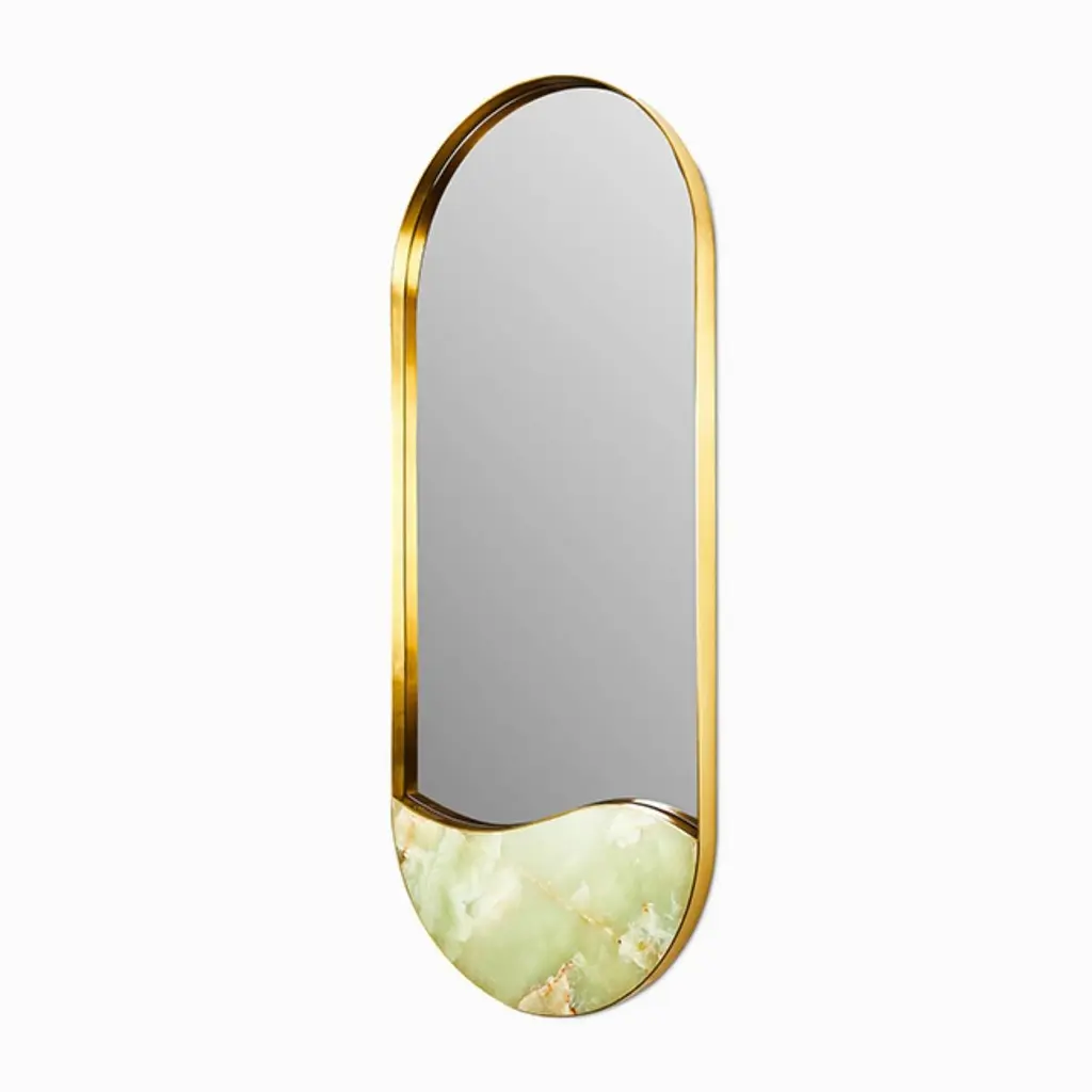 Onyx Kura mirror by Marble BalloonDimensions: W 50 x D 5 x H 120 cmMaterials: Brass, Onyx Inspired by the flow of Aras River, it combines 100% brass frame with semi-precious stone details. Semi-precious stones are available in either green onyx or amethyst.Marble balloon is an interior design and high-end furniture brand based in Istanbul. Marble balloon is devoted to create refined and sophisticated designs bringing the premium quality materials and finest craftsmanship together. Adhering to a design philosophy cherishing organic and asymmetrical forms whilst challenging the nature of marbles implying fluidity, incorporating only the extraordinary marbles and natural stones into handcrafted and timeless creations.
