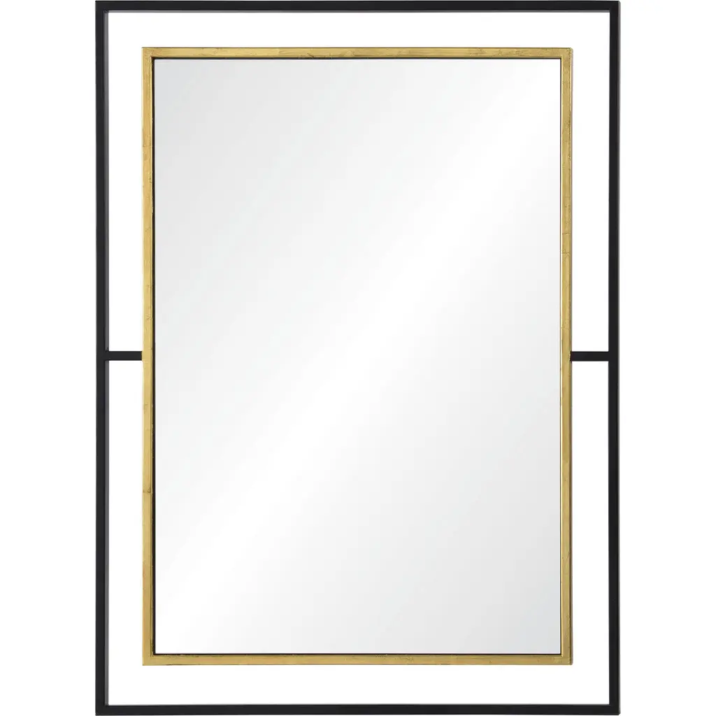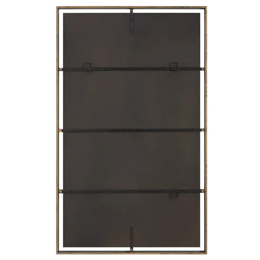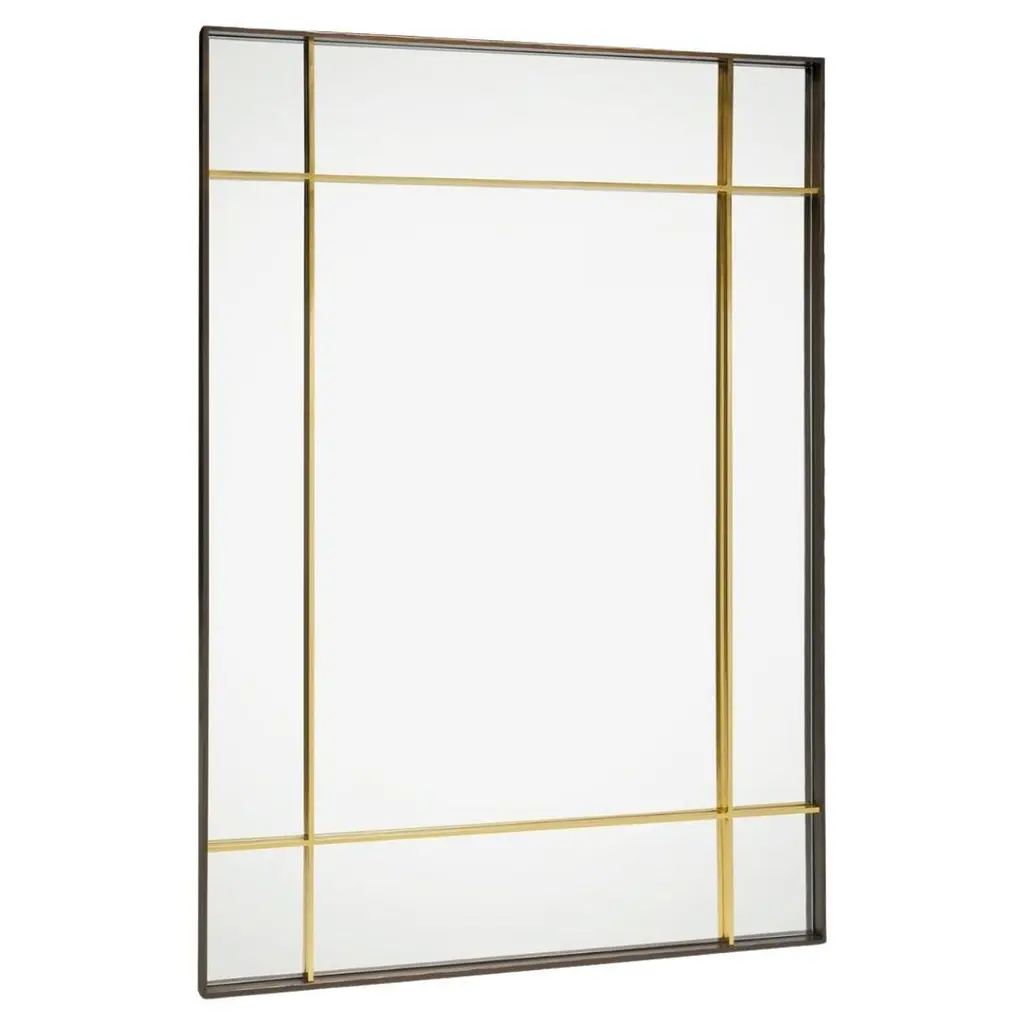 This mirror displays a 3-dimensional design with an outer iron frame finished in aged bronze, surrounding a floating mirror held by warm gold clips. May be hung horizontally or vertically.