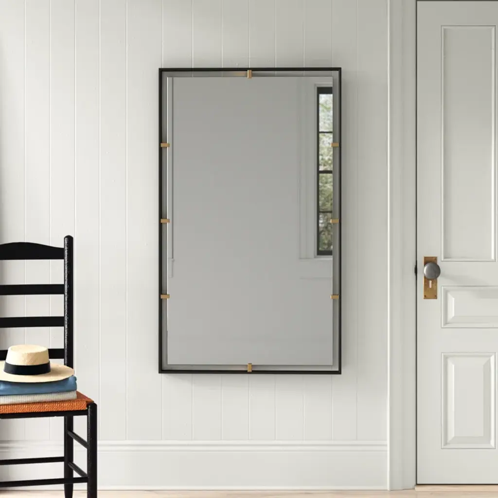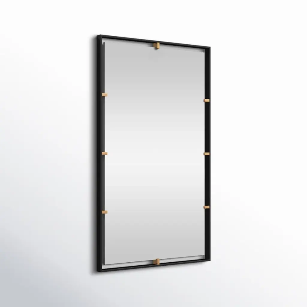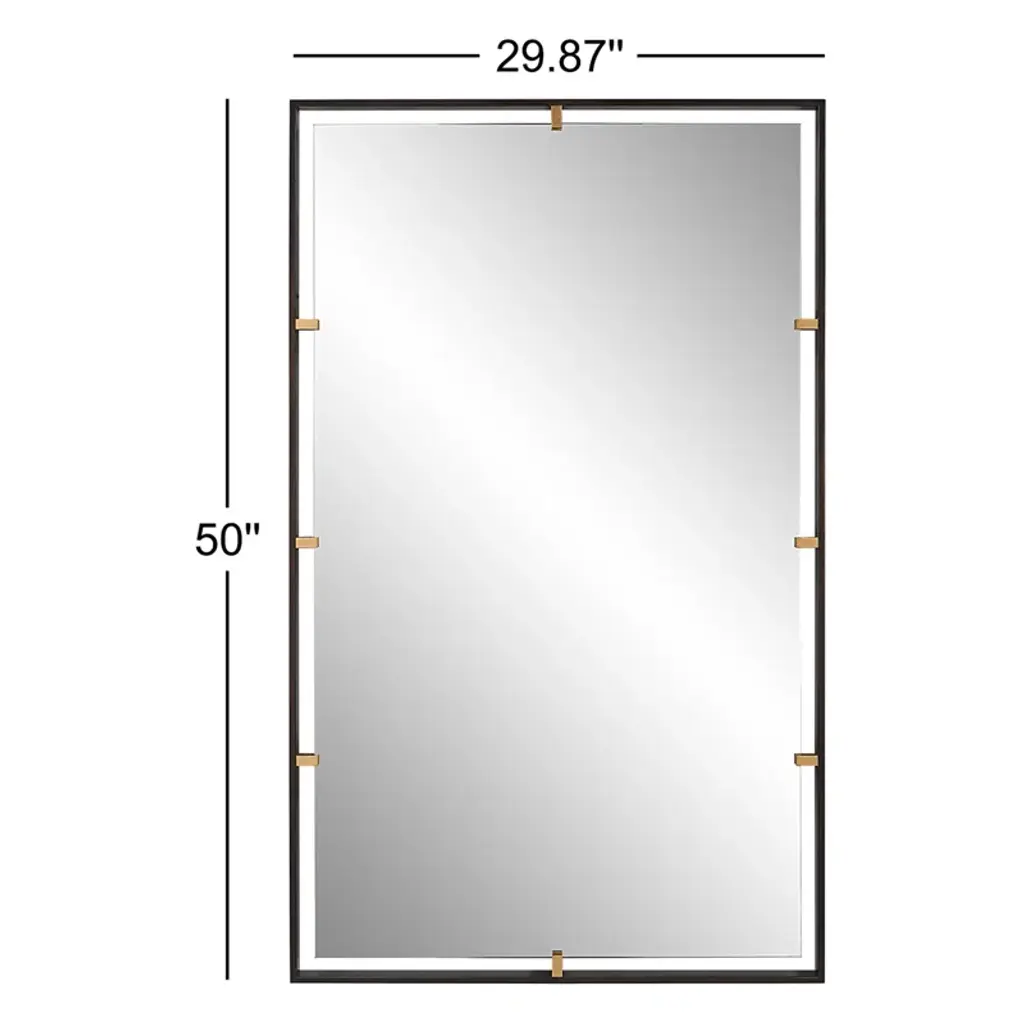This mirror displays a 3-dimensional design with an outer iron frame finished in aged bronze, surrounding a floating mirror held by warm gold clips. May be hung horizontally or vertically.