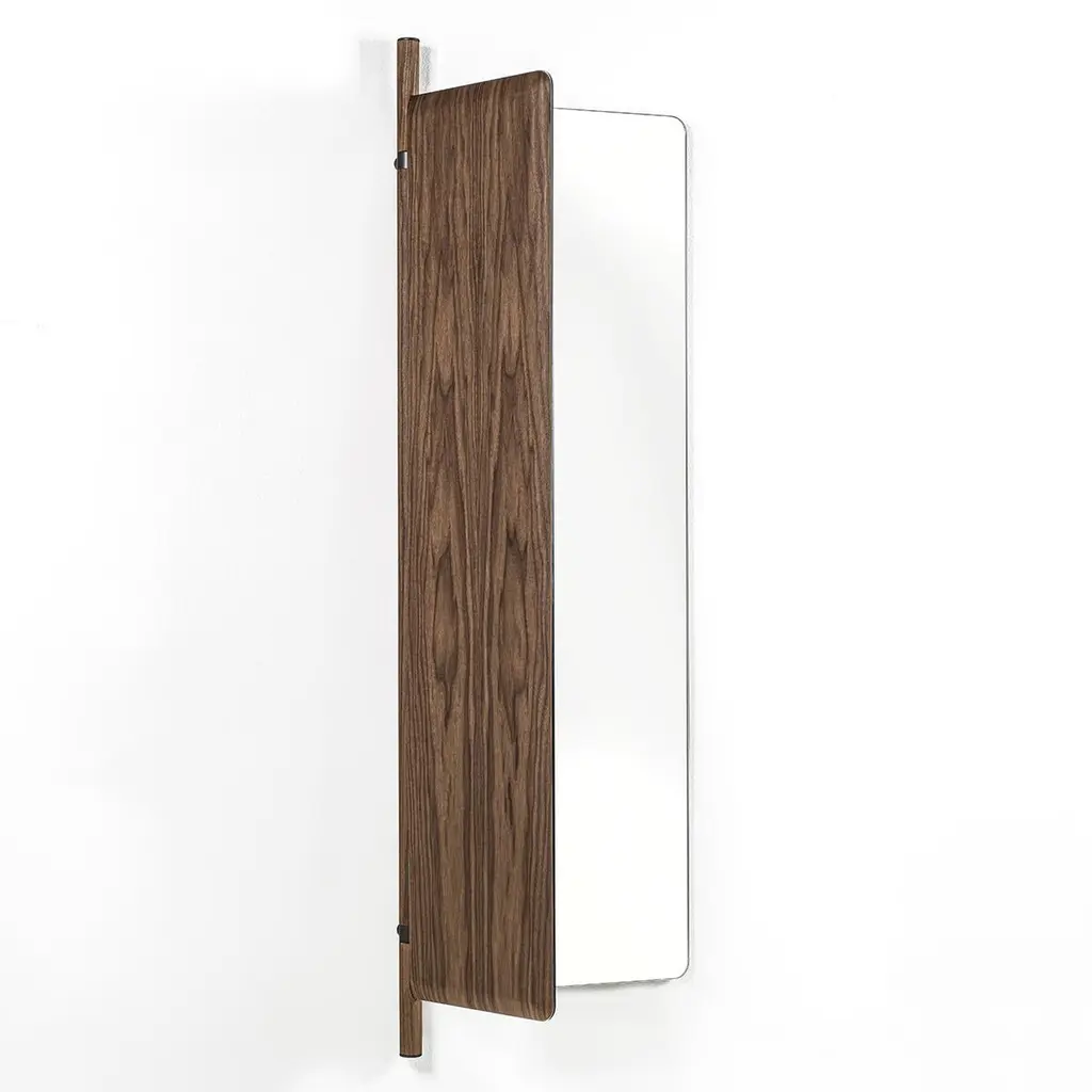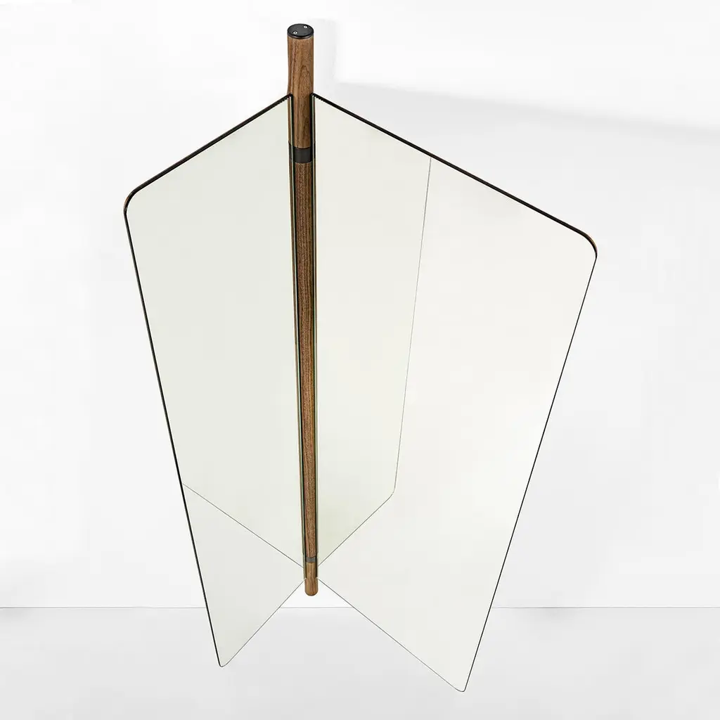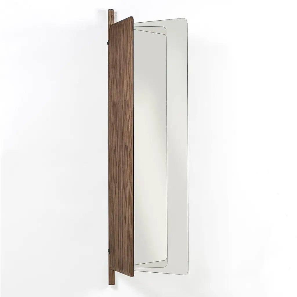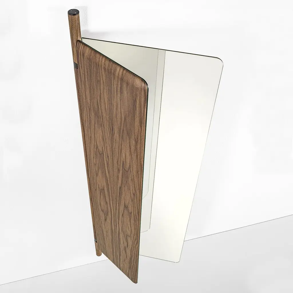Mirror Amnesia composed of 2 folding glass mirros with solid walnut back.With a central pole in solid walnut with metal parts in grey finish included.92cm when opened and and 57cm when folded.