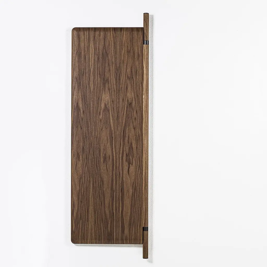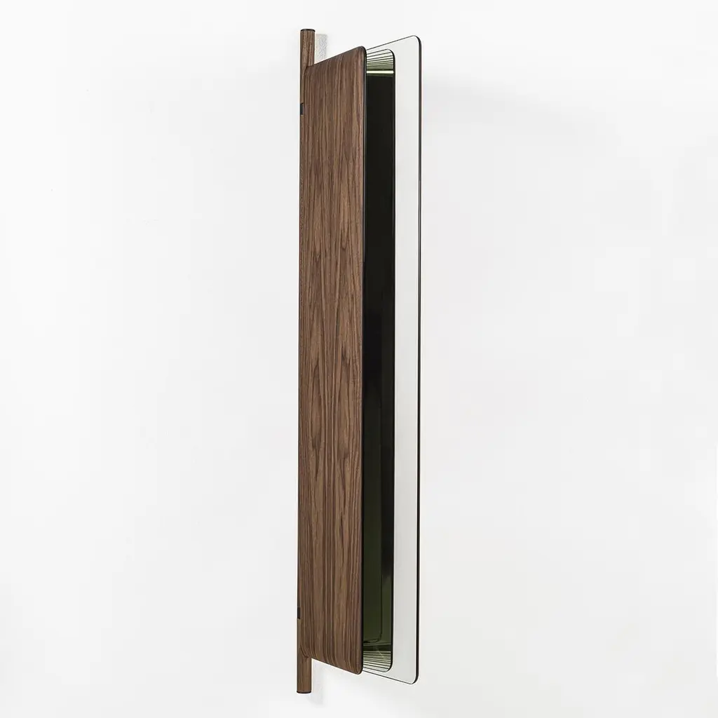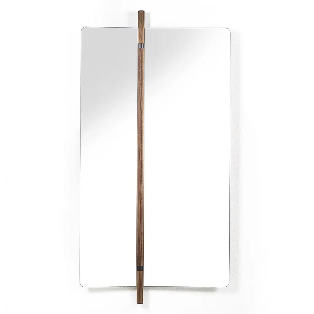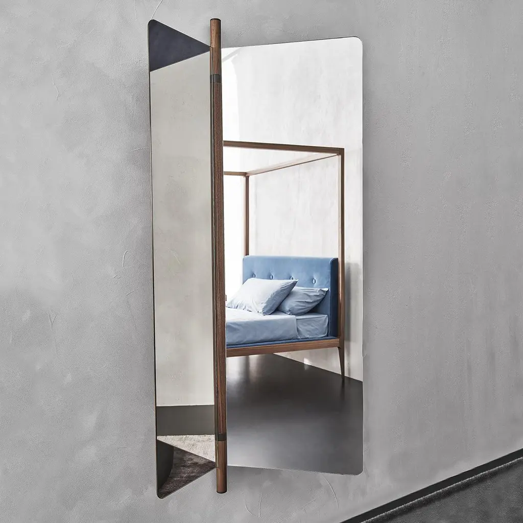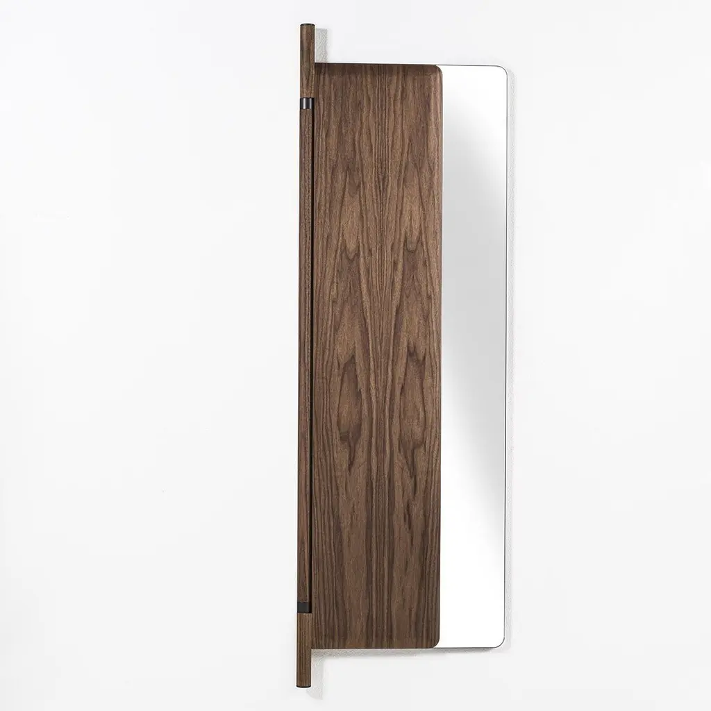 Mirror Amnesia composed of 2 folding glass mirros with solid walnut back.With a central pole in solid walnut with metal parts in grey finish included.92cm when opened and and 57cm when folded.