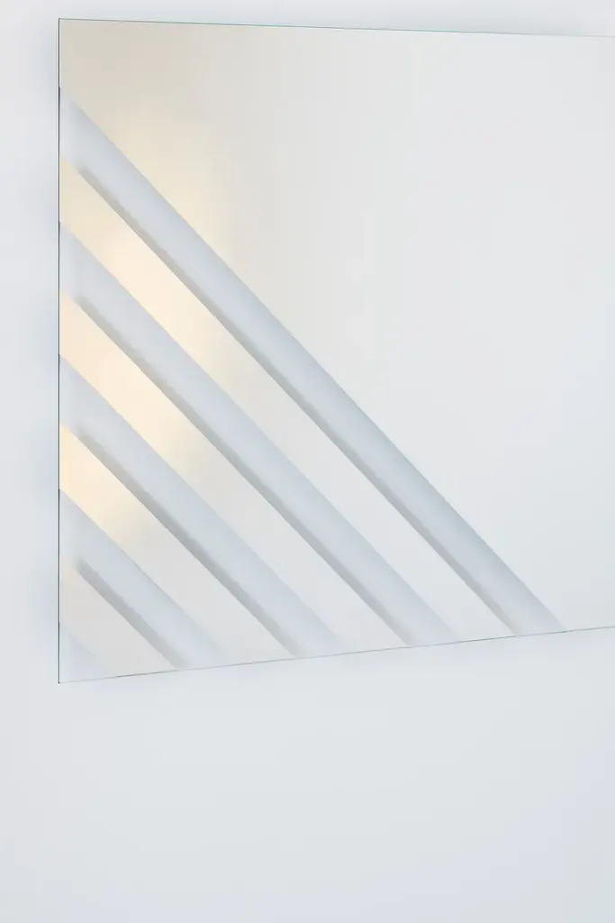 Re-launch of the first collection of mirrors designed by Nanda Vigo for Glas Italia, initially presented in 1974.It is a collection of mirrors in negative-positive (transparent parts alternate with mirrored parts) in various shapes and sizes, available in a neutral finish or in unique amber-colored glass. The hanging system allows you to install the mirrors in various inclinations.