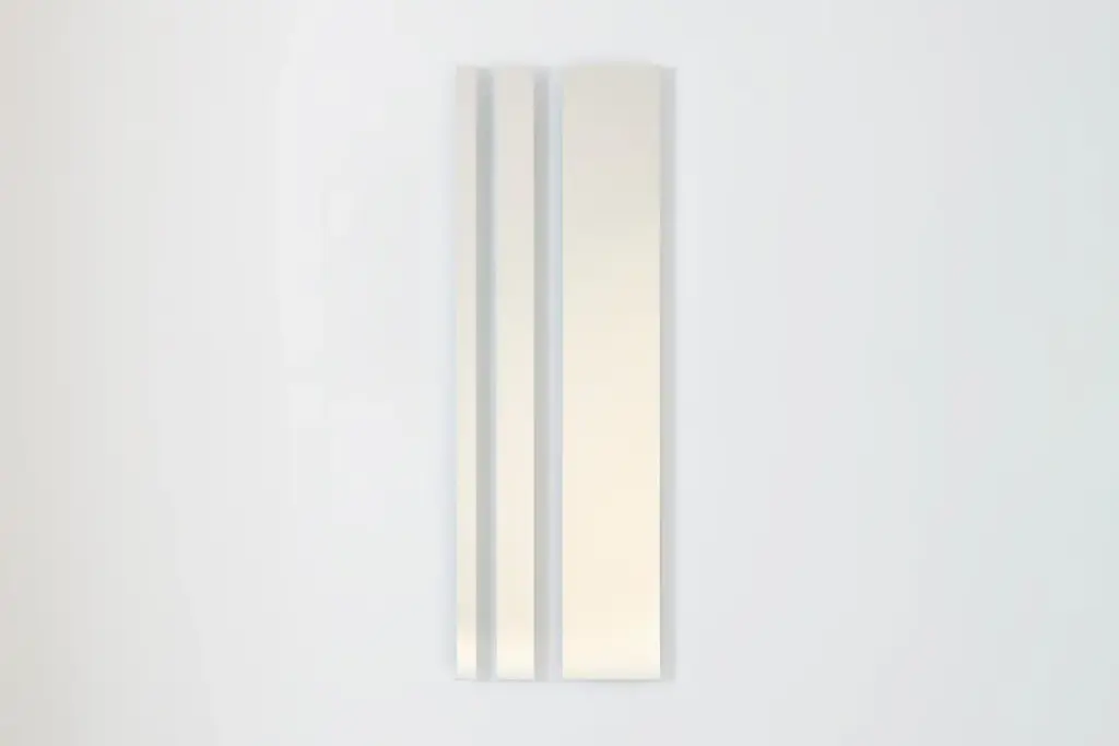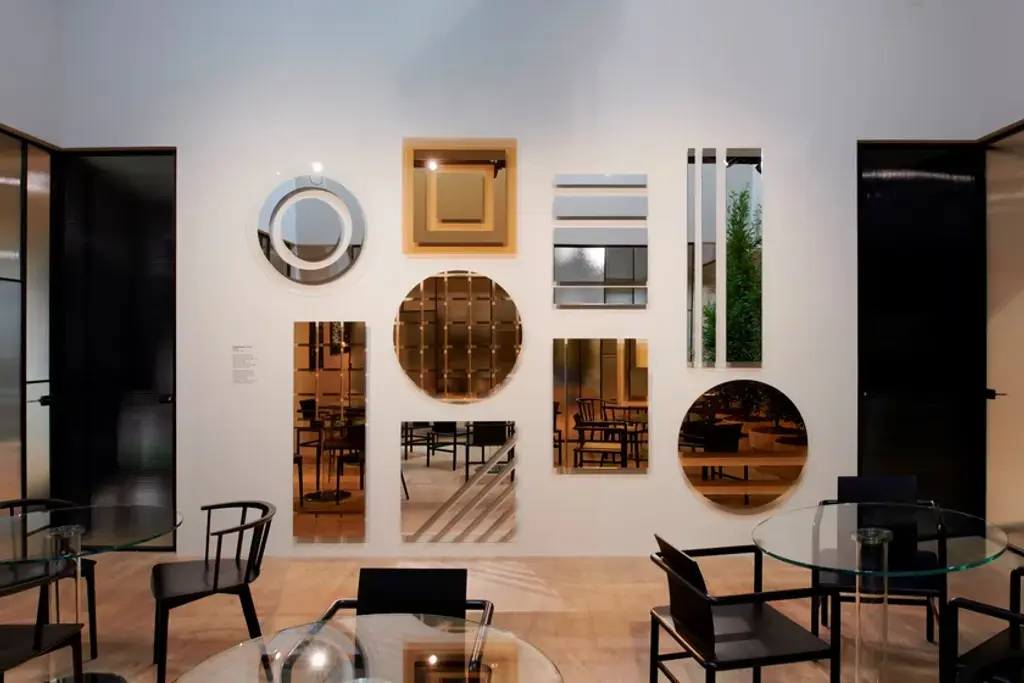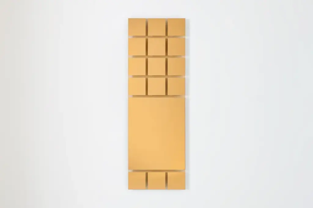 Re-launch of the first collection of mirrors designed by Nanda Vigo for Glas Italia, initially presented in 1974.It is a collection of mirrors in negative-positive (transparent parts alternate with mirrored parts) in various shapes and sizes, available in a neutral finish or in unique amber-colored glass. The hanging system allows you to install the mirrors in various inclinations.