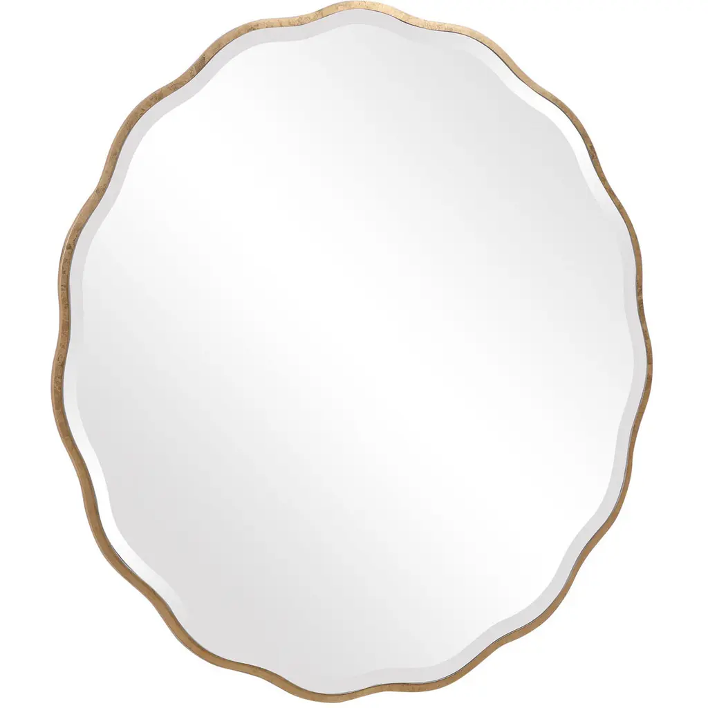 Showcasing A Feminine Scalloped Edge, This Shaped Wood Mirror Adds Whimsical Flair To Any Design. The Mirror Is Finished In Aged Gold And Has A 1 1/4" Bevel.