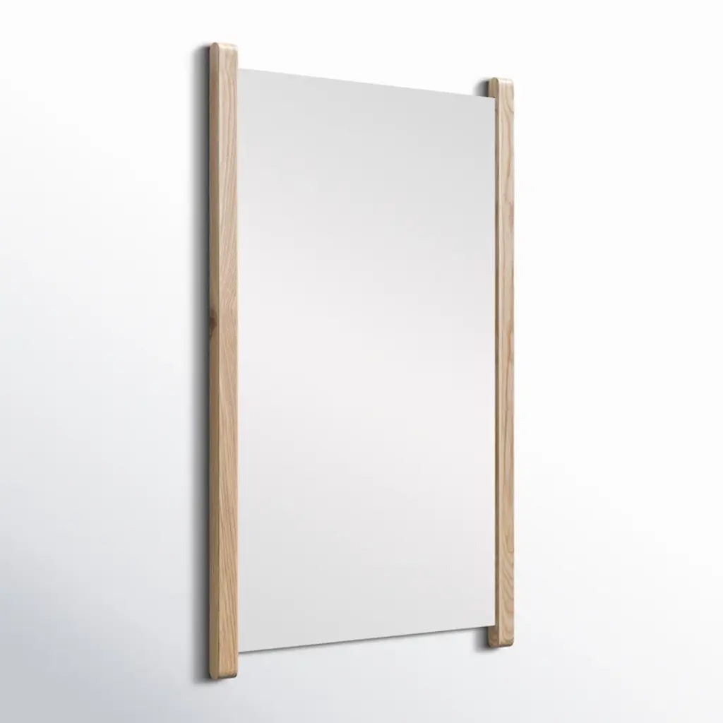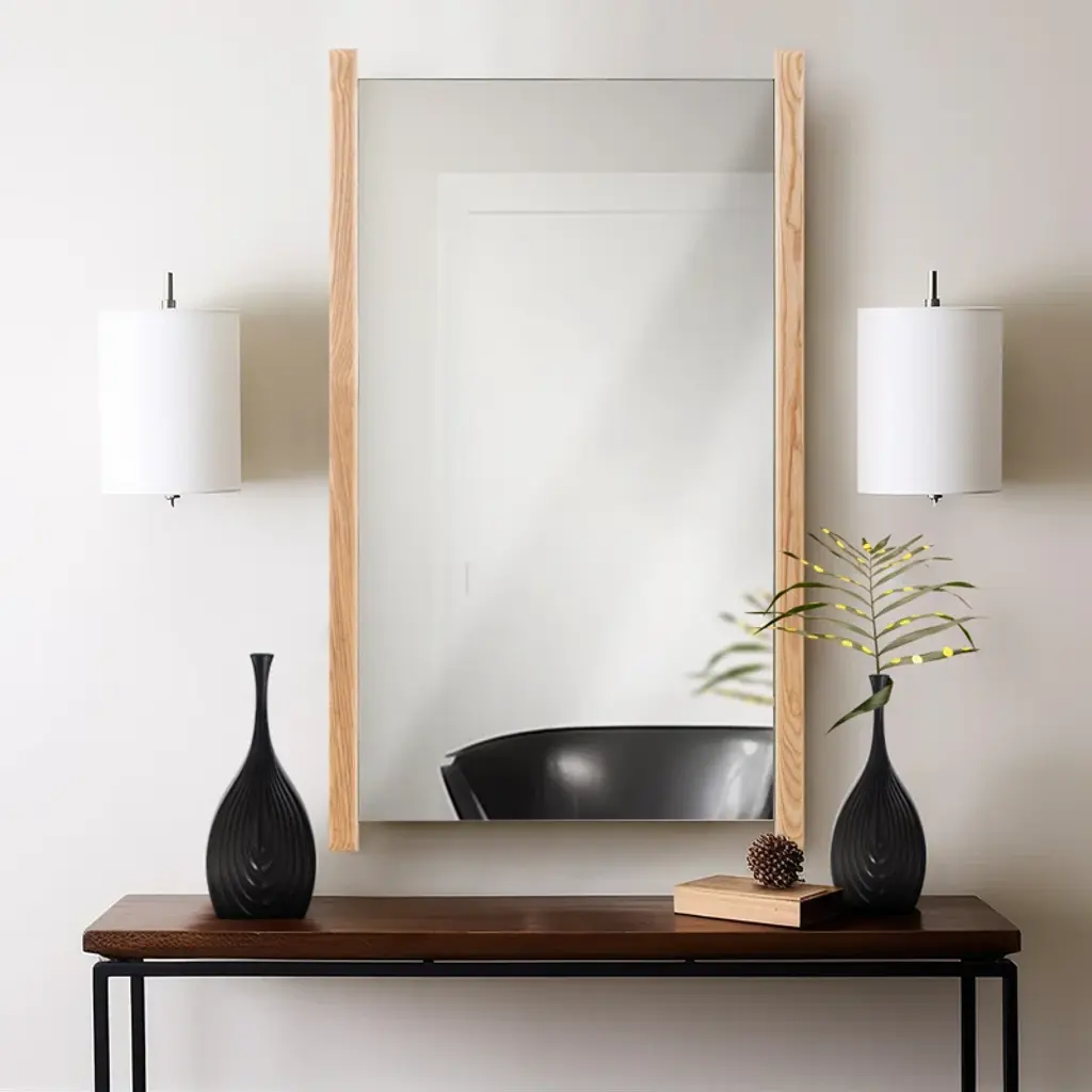 The wooden side frames lend a touch of natural warmth and texture, creating a perfect juxtaposition with the frameless top and bottom edges. This innovative design not only adds visual interest but also allows the mirror to seamlessly integrate into a wide range of decor styles. Whether hung individually as statement pieces or grouped together to form an eye-catching composition, our Evandale vanity mirror invites you to explore the fusion of materials and aesthetics, providing a timeless and adaptable solution for enhancing your living space.