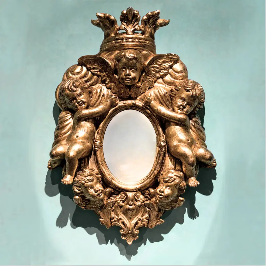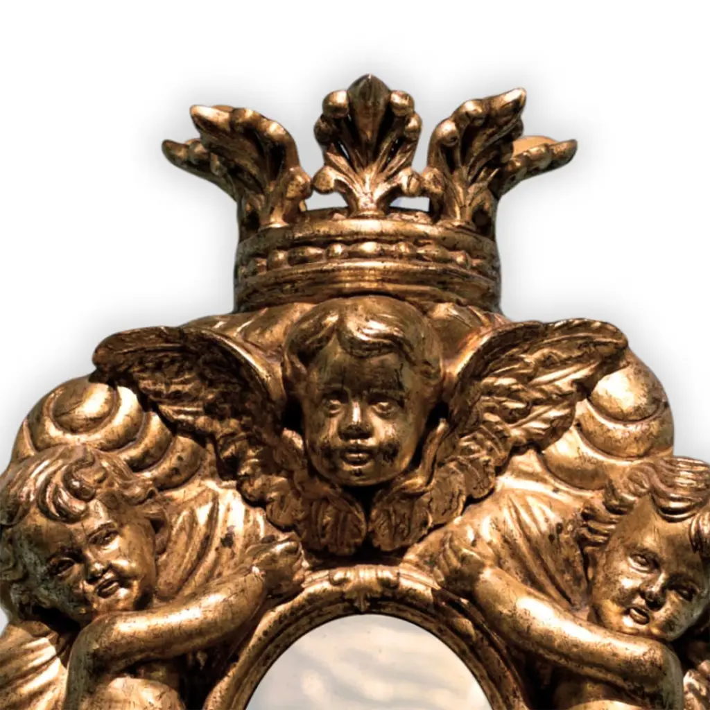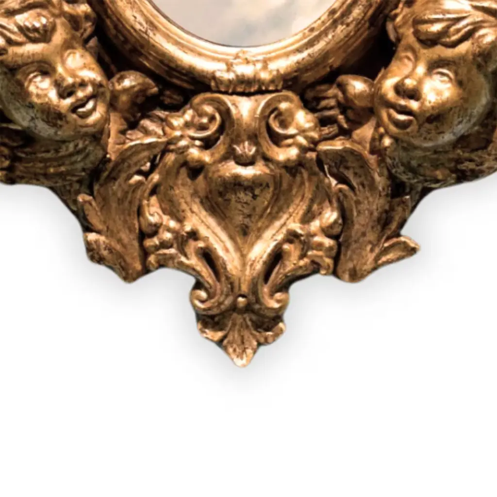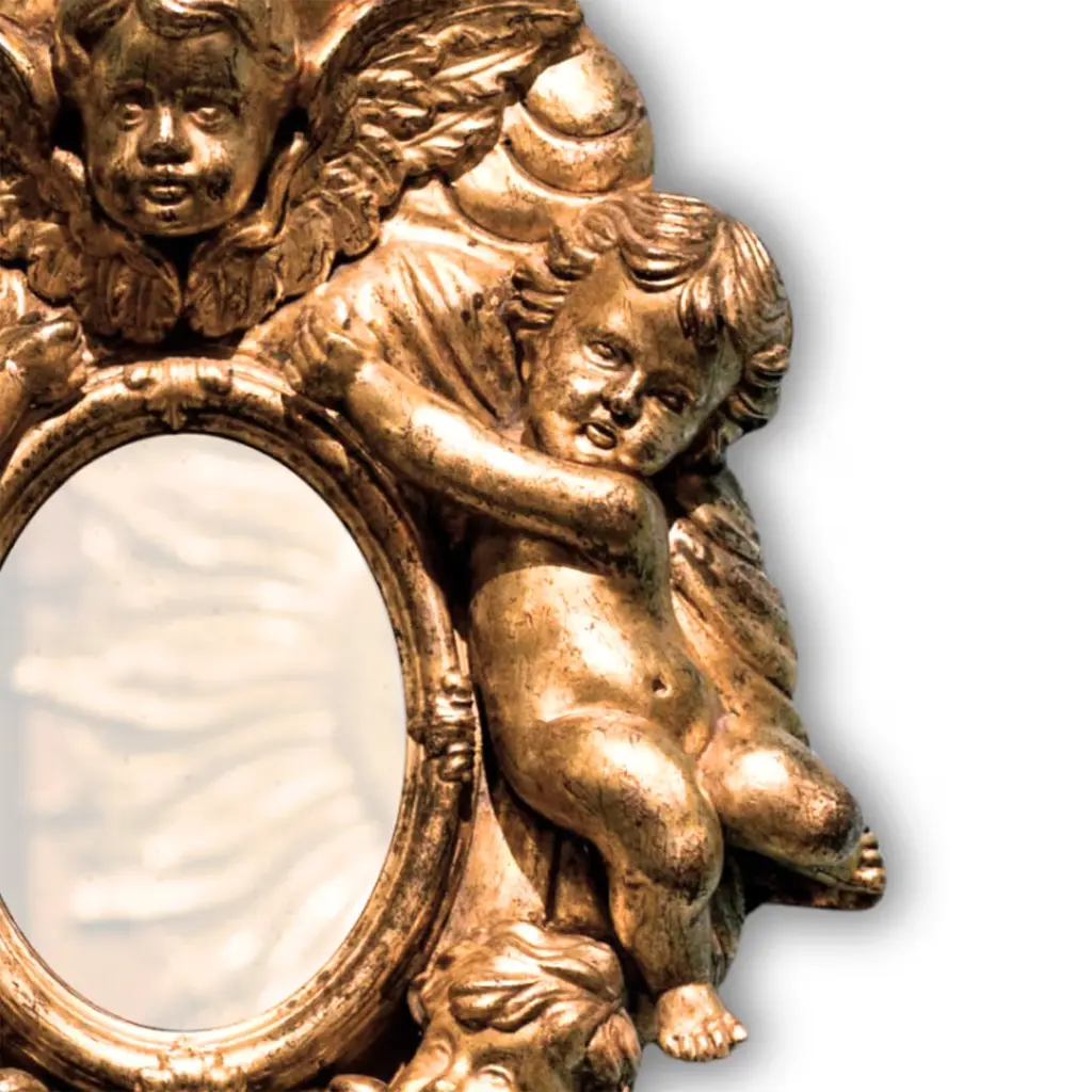 This majestic oval mirror features an intricately carved wooden frame depicting an angelic choir with hand-sculpted angel figures and ornamental details. The frame uses the traditional Italian "Mecca" technique: pure silver leaf over a chalk and bole base, burnished, worn, oxidized, antiqued, and painted with Mecca—a vibrant orange paint from natural resins. Patinated with natural waxes and earth pigments, the frame showcases two side angels and cherub heads at the top and bottom.