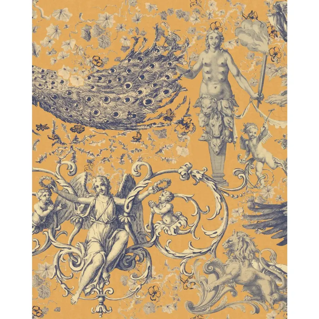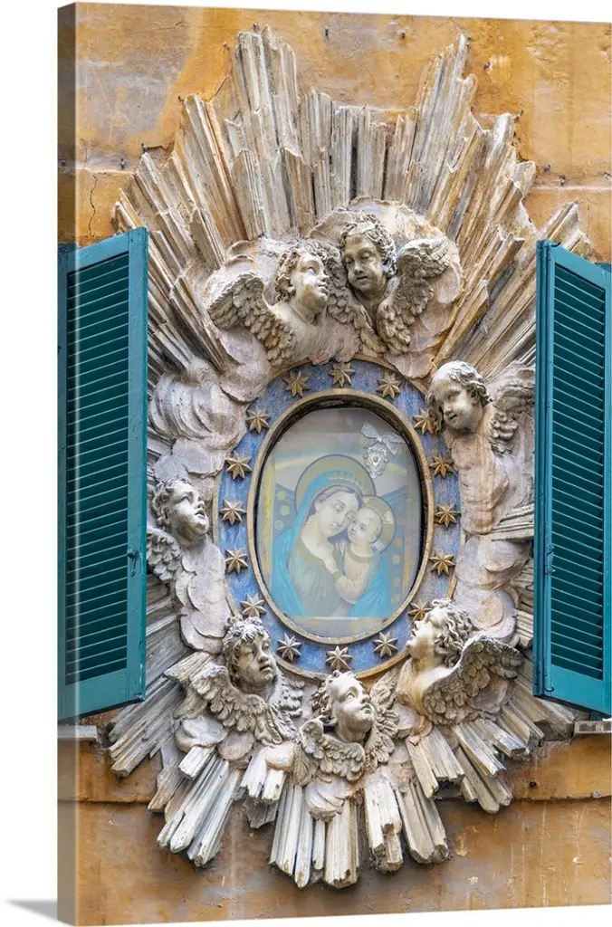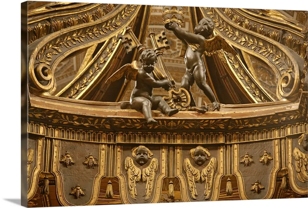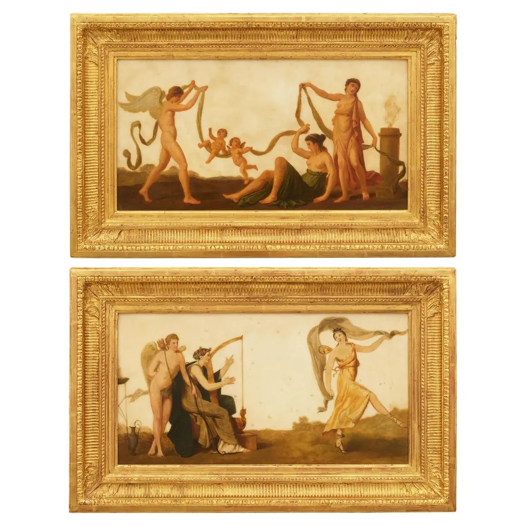 This majestic oval mirror features an intricately carved wooden frame depicting an angelic choir with hand-sculpted angel figures and ornamental details. The frame uses the traditional Italian "Mecca" technique: pure silver leaf over a chalk and bole base, burnished, worn, oxidized, antiqued, and painted with Mecca—a vibrant orange paint from natural resins. Patinated with natural waxes and earth pigments, the frame showcases two side angels and cherub heads at the top and bottom.