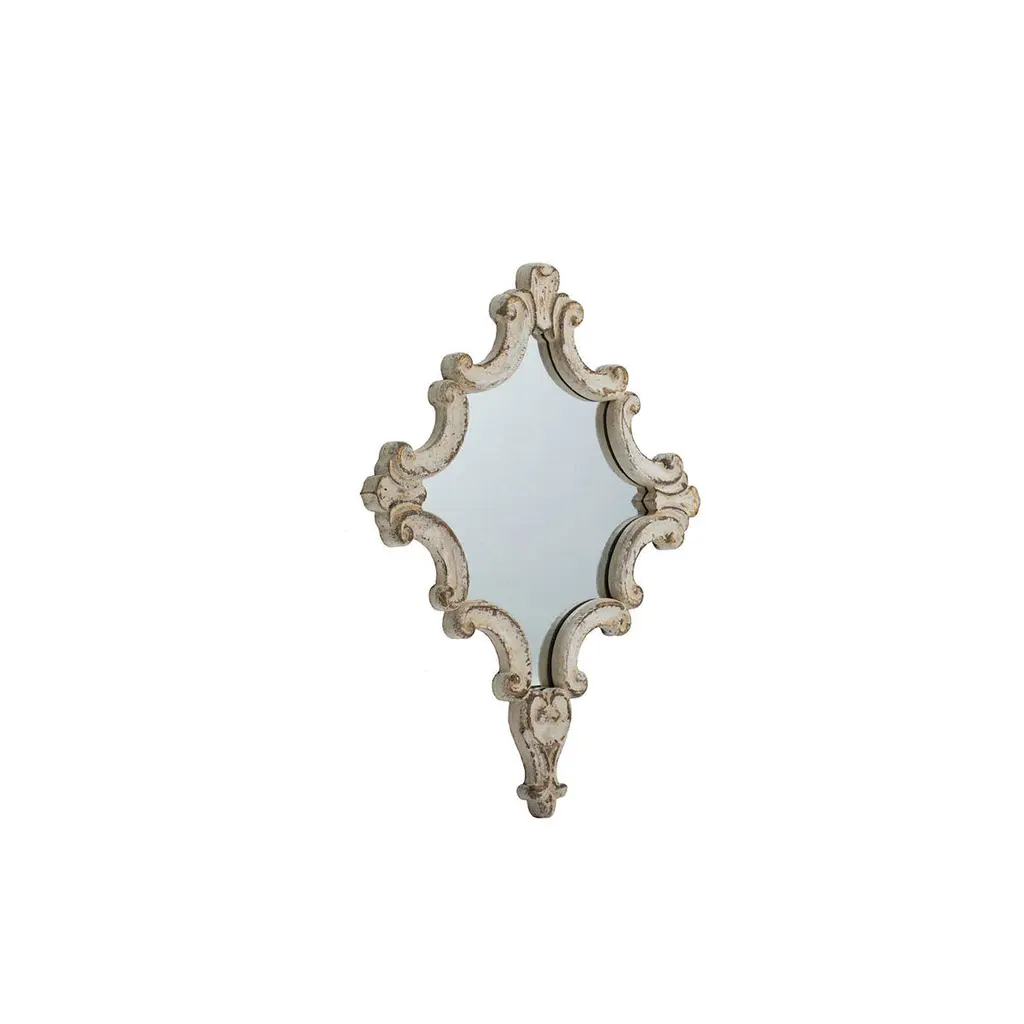 This diamond-shaped mirror showcases a regal, traditional charm with scrollwork along the frame.