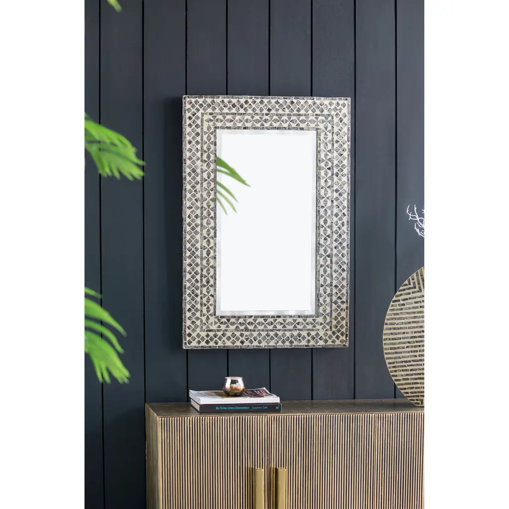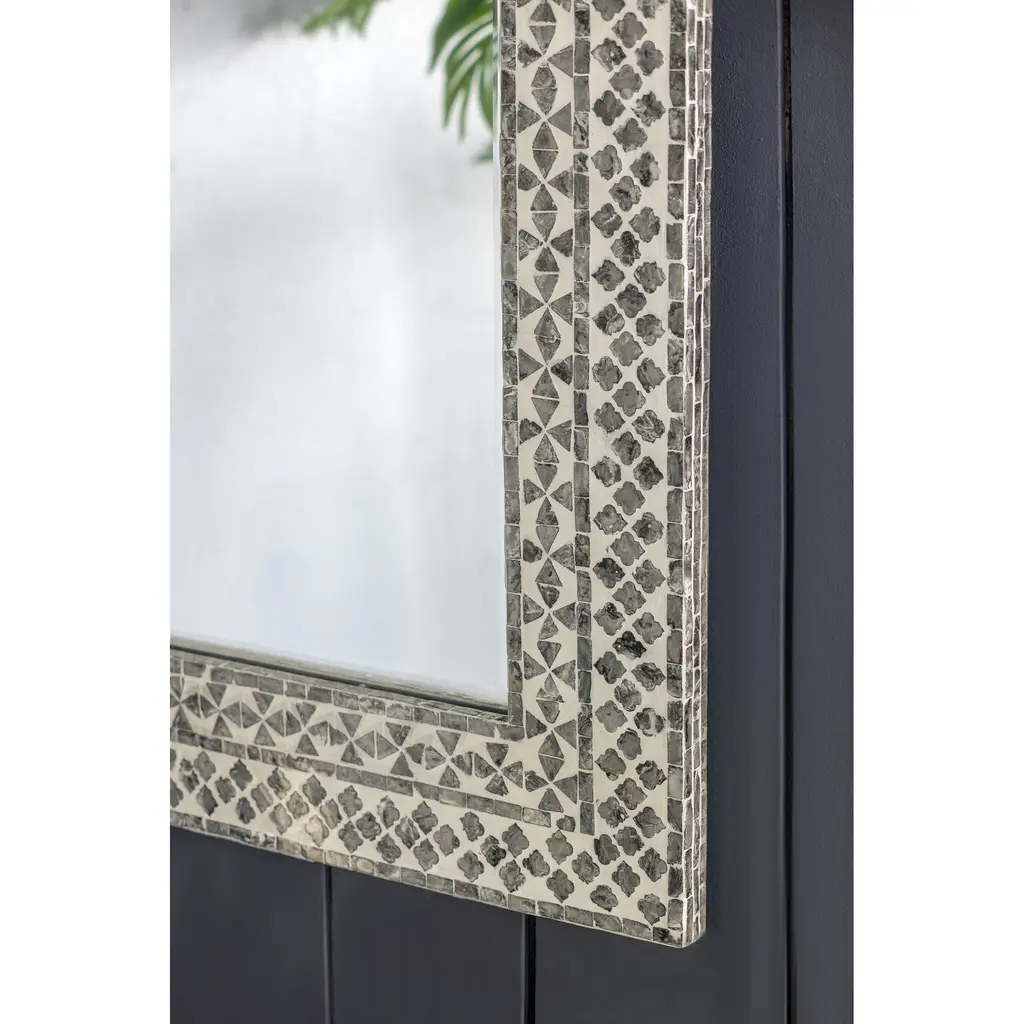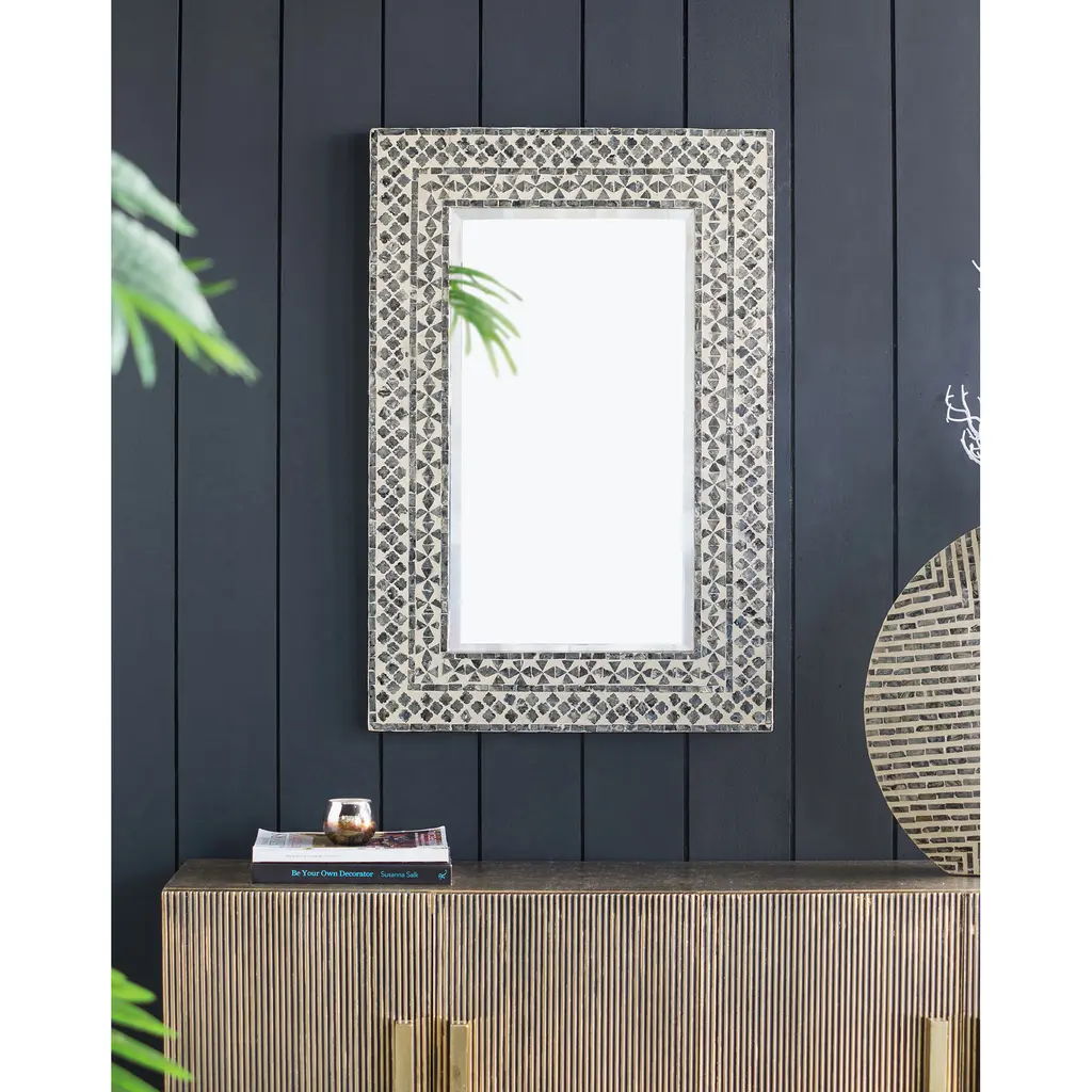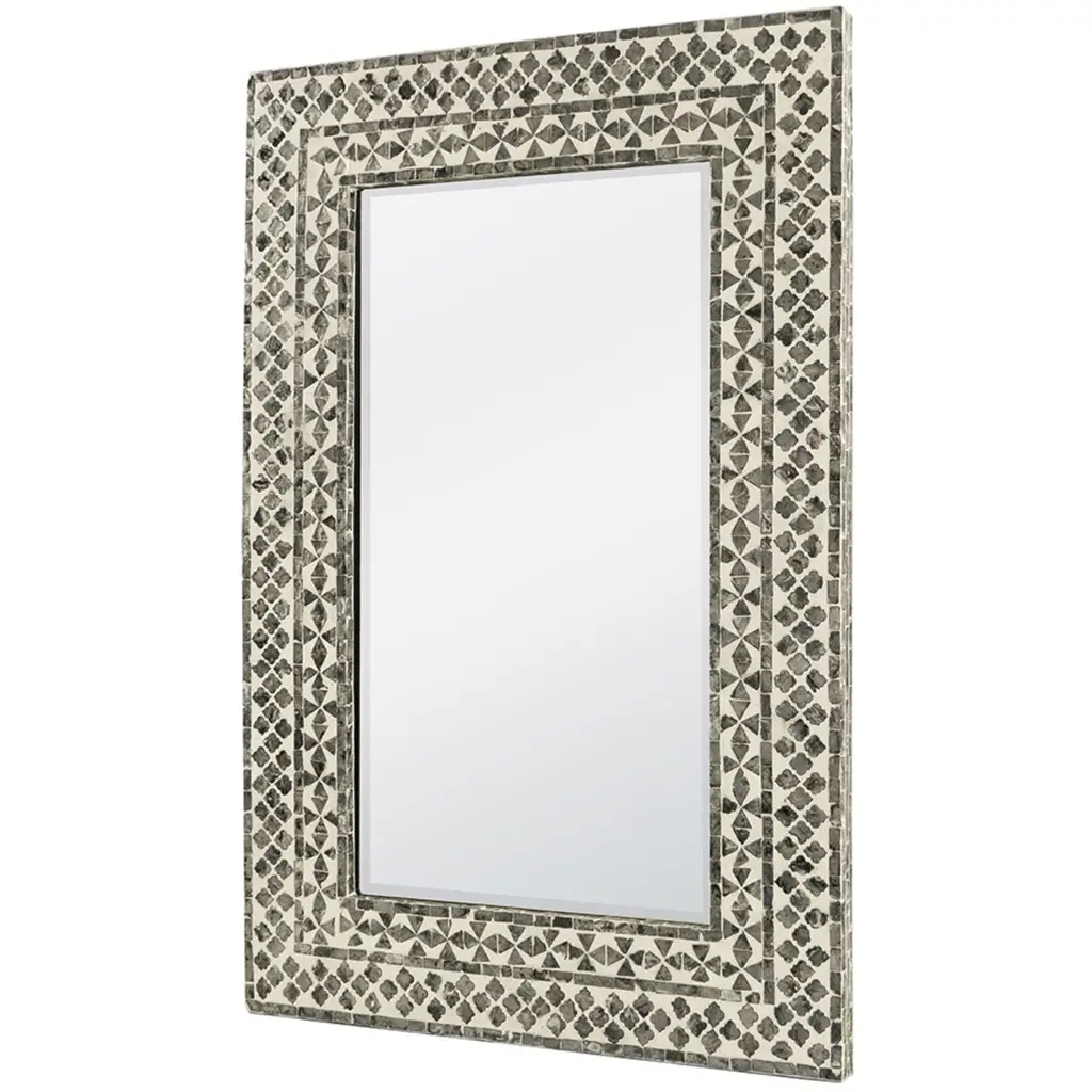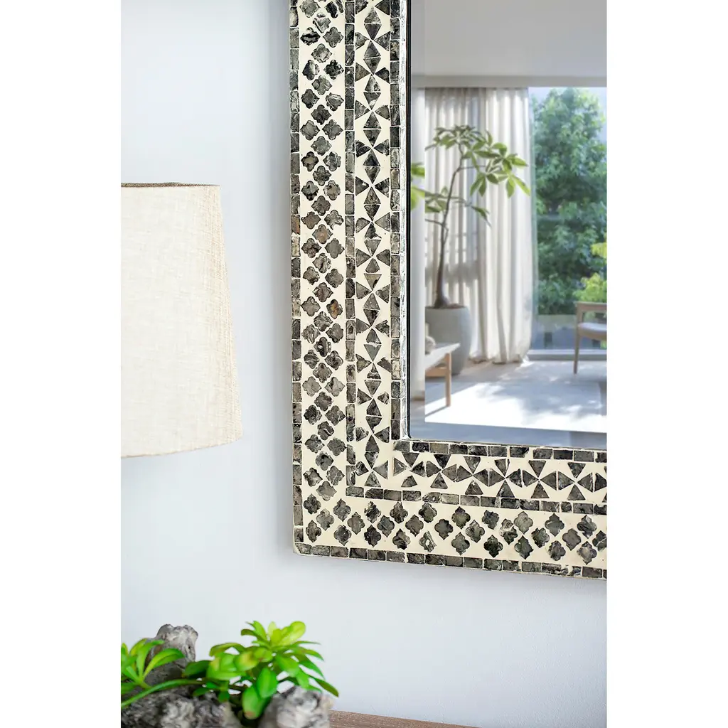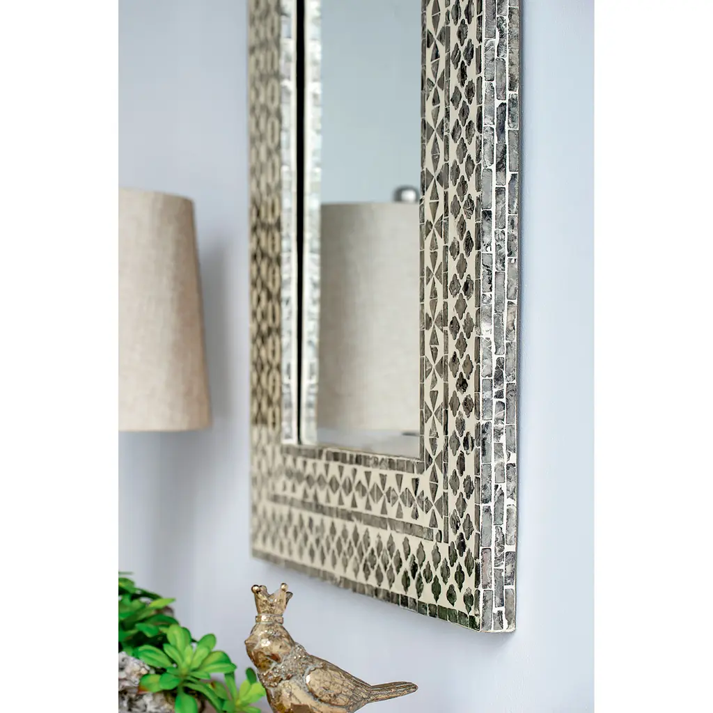 This rectangular Capiz framed mirror with beveled glass brings impeccable style to hallway, bedroom and entryway walls. Geometric patterning along the outer frame complements the angular glass at the center. A vibrant accent piece with obvious utility, this mirror immediately ups the style of any modern space.