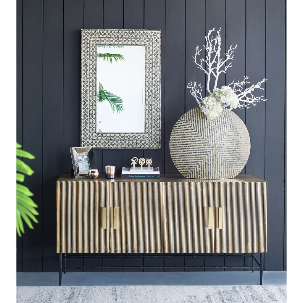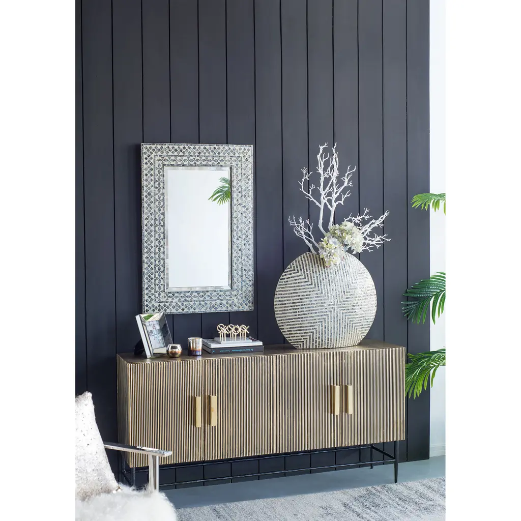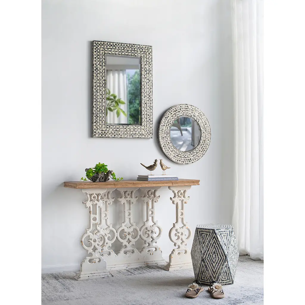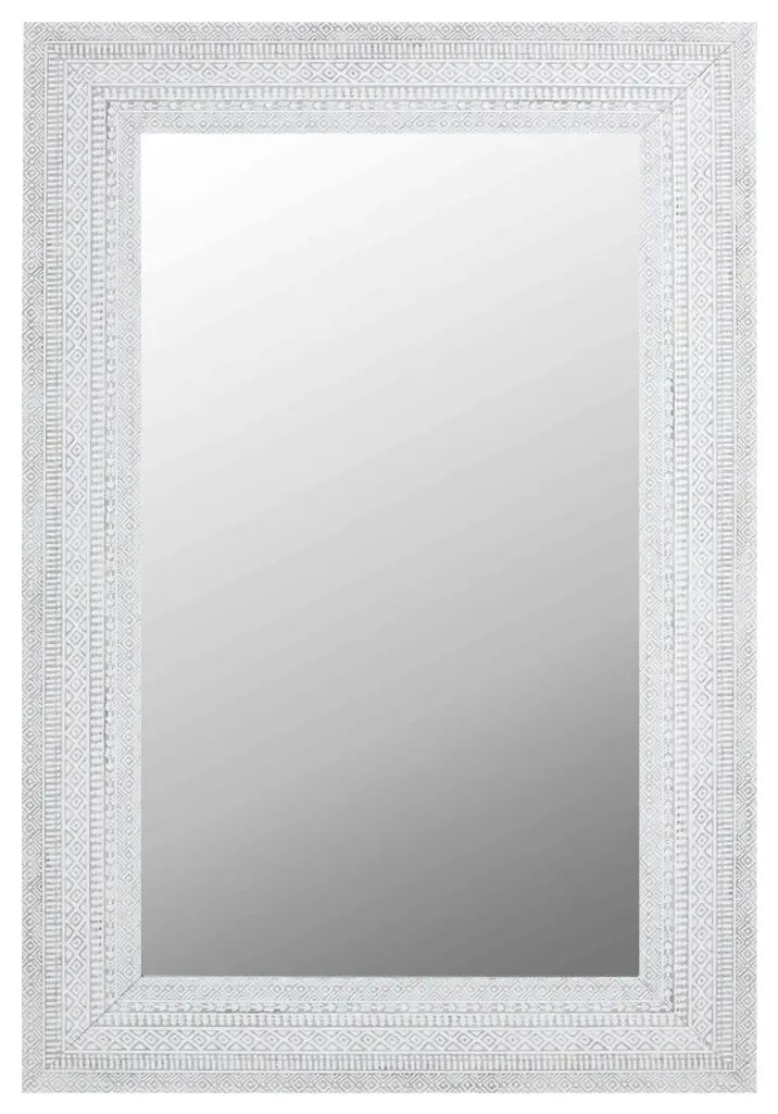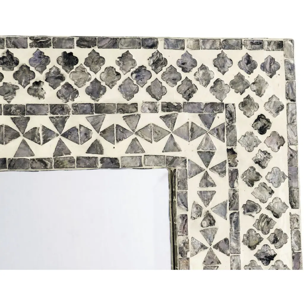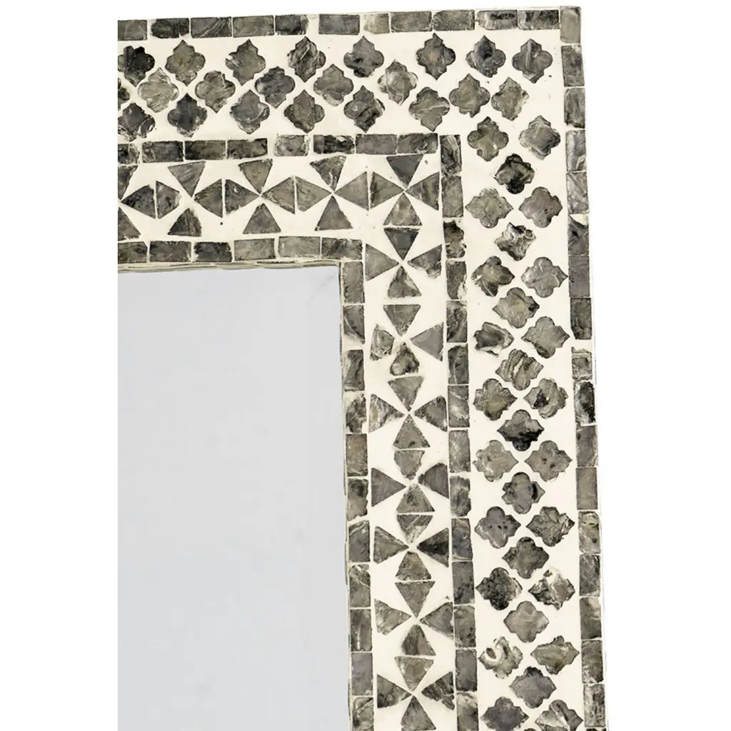 This rectangular Capiz framed mirror with beveled glass brings impeccable style to hallway, bedroom and entryway walls. Geometric patterning along the outer frame complements the angular glass at the center. A vibrant accent piece with obvious utility, this mirror immediately ups the style of any modern space.