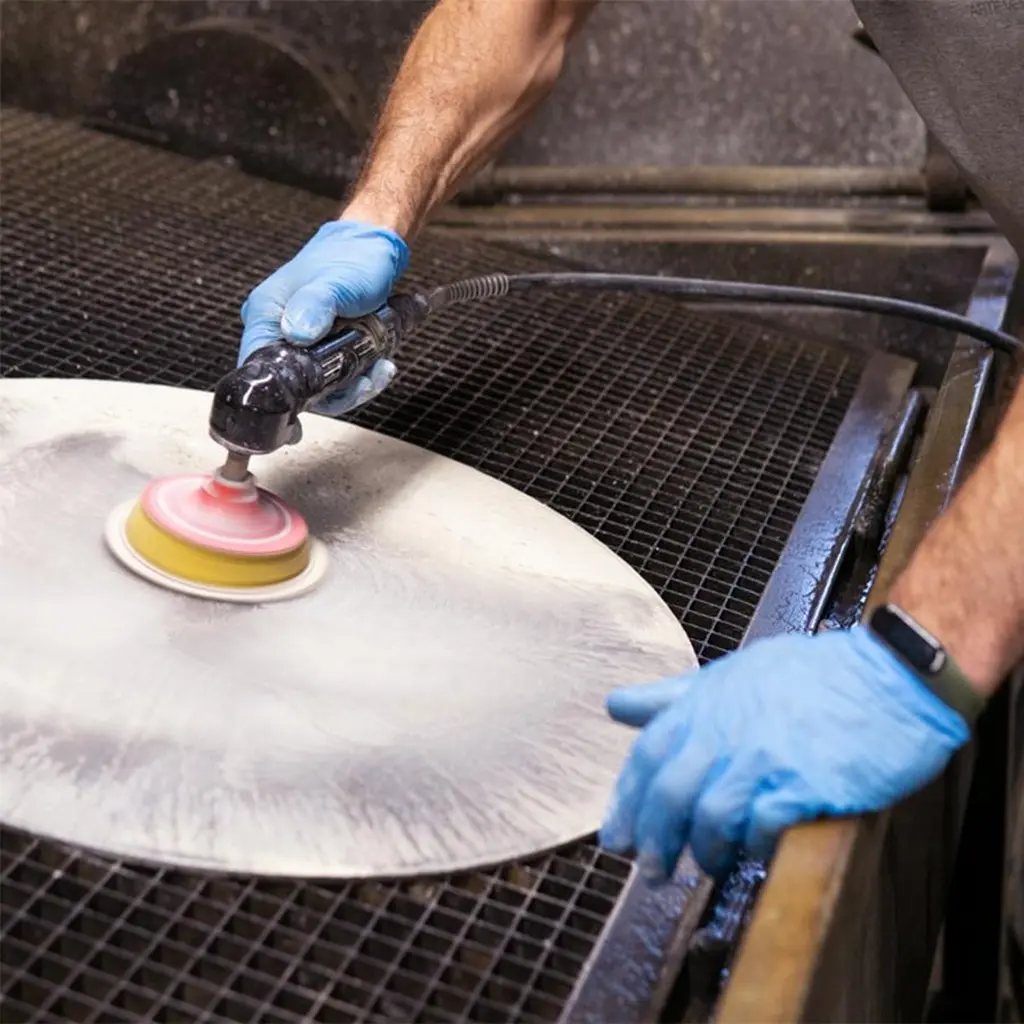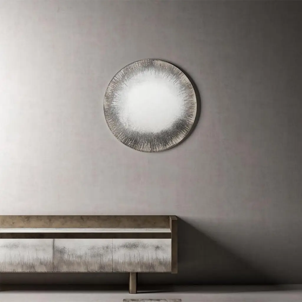 Mirror Antigua Round with wooden back frame wityh antique brasspaint finished edge. 6mm thickness mirror with acid etched extra clear glass finished with polished edge and diamond grinding wheel engraving on the etched side. Mirror with silvered back fading from heavy antique to light antique.