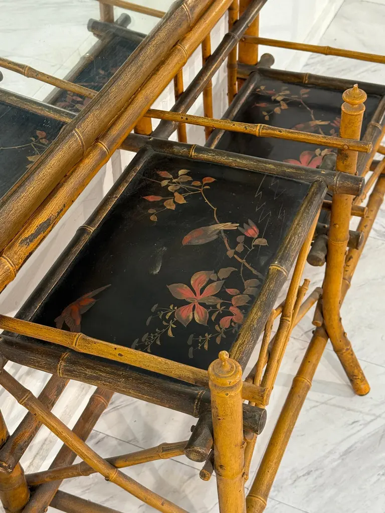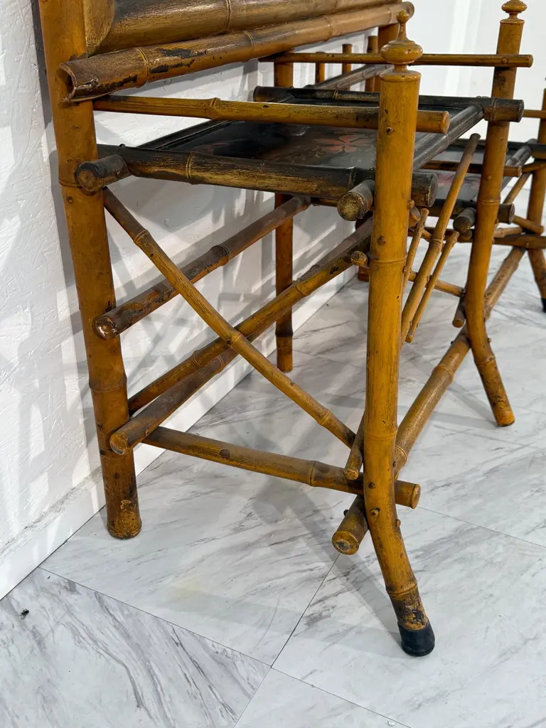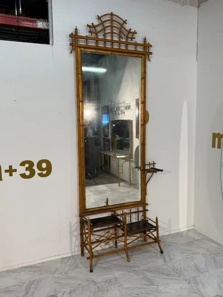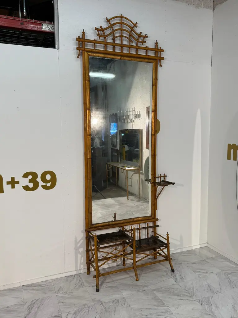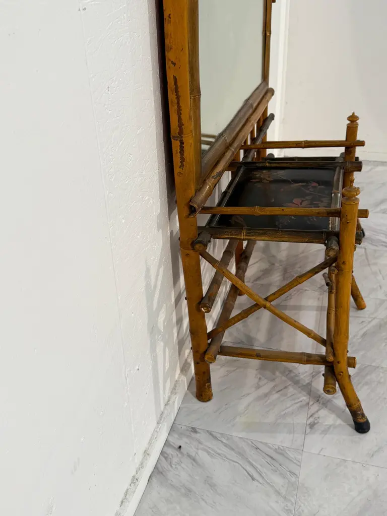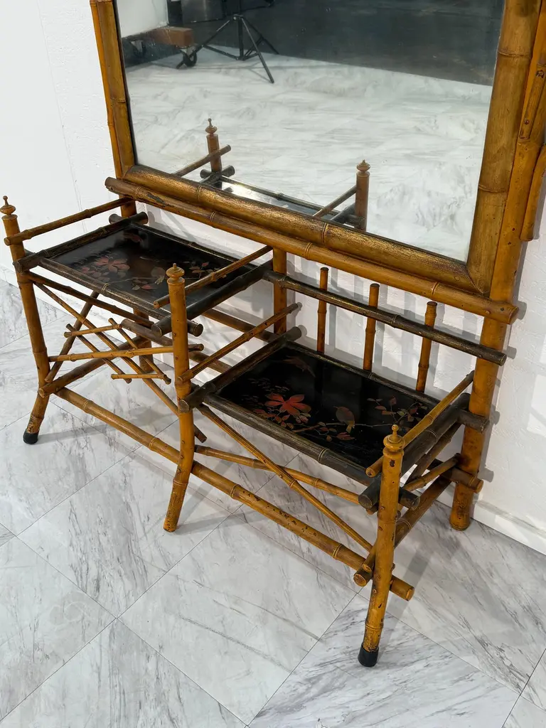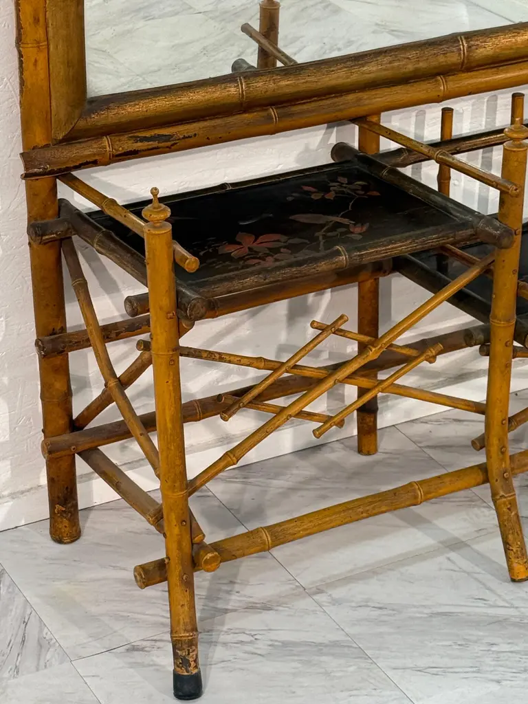 A rare and elegant Anglo-Japanese style hall tree, dating from the late 19th century. This striking piece features a tall rectangular beveled mirror framed in faux bamboo with a decorative pagoda-style crest at the top. Below, two lacquered shelves are beautifully hand-painted with floral and bird motifs, offering both visual charm and practical use. Additional side shelves and supports provide functionality, while the overall construction reflects the period’s fascination with Japanese-inspired design during the Aesthetic Movement.The hall tree retains its original warm patina, with age-related wear consistent with its history, adding to its authenticity and character. Perfect as a statement entryway piece, it combines artistry and utility in one remarkable antique.
