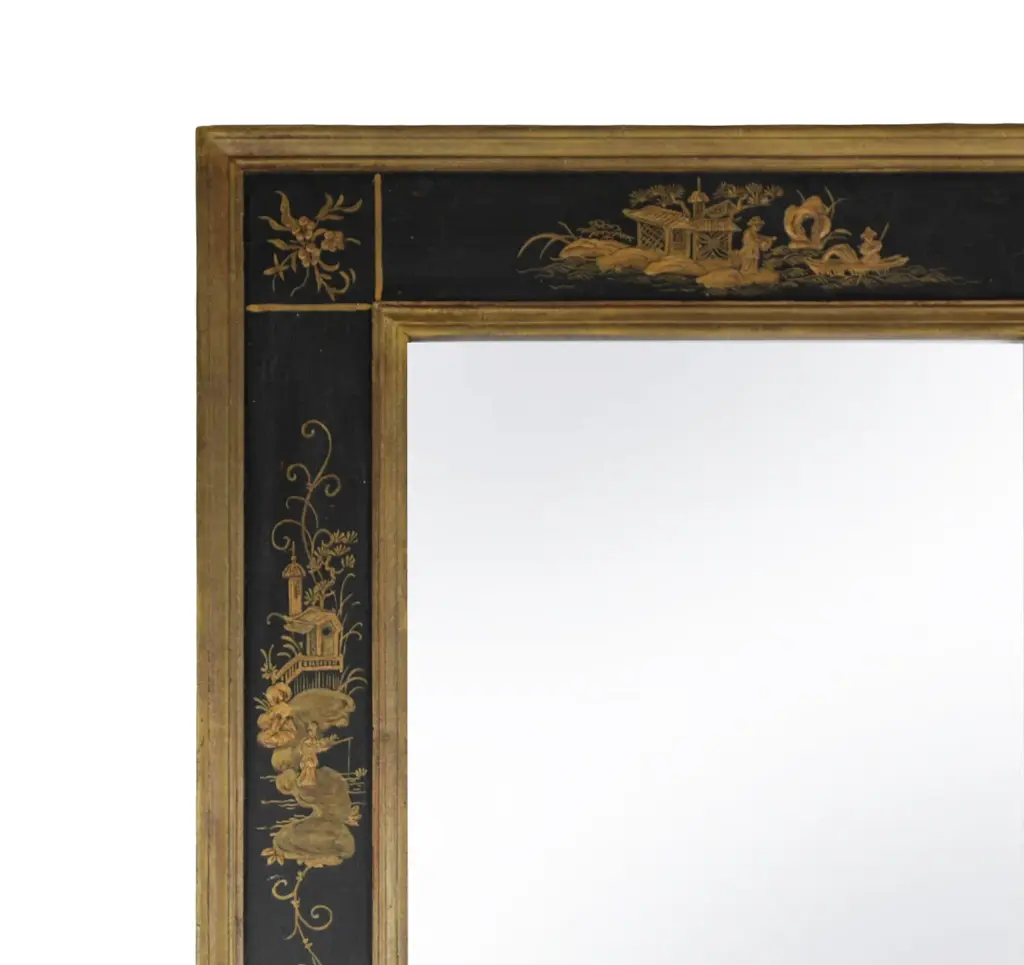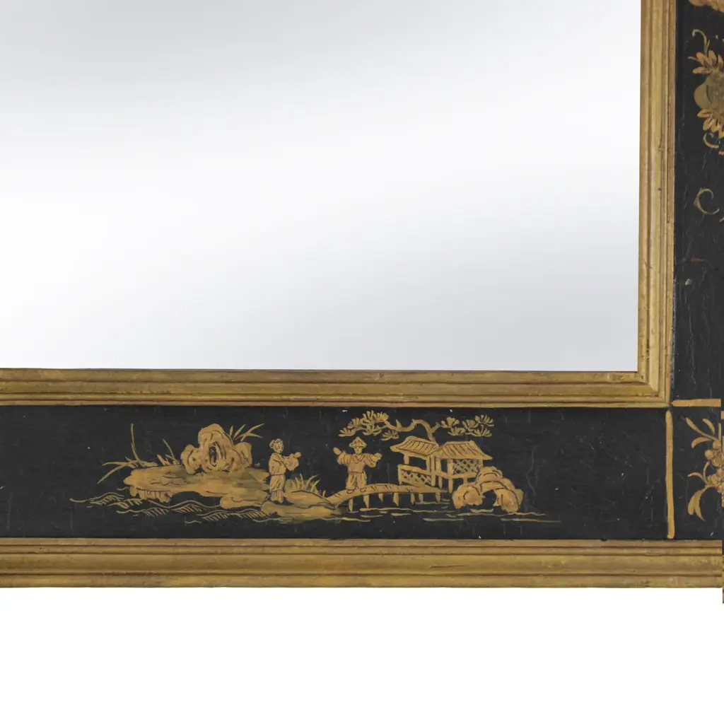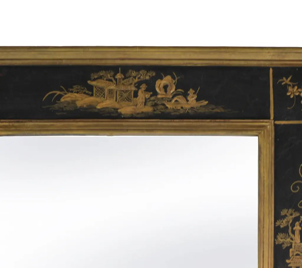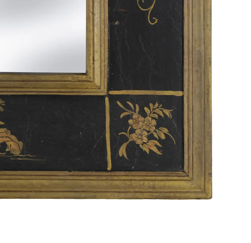 Antique Gilt black Chinoiserie Mirror. vintage gilt black Chinoiserie mirror. This mirror is a very typical European chinoiserie art form from the 17th to 18th century. It is a work of art anywhere in the interior, it is hand-painted by the artist, with lots of gilding, Chinese patterns and figures, and magnificent landscapes. Chinoiserie became popular in Europe in the mid-18th century. Today, chinoiserie remains a widely imitated design trend because its whimsical, incredible landscapes and playful embellishments create a charming decorative aesthetic. less 33ʺW × 1ʺD × 37ʺH